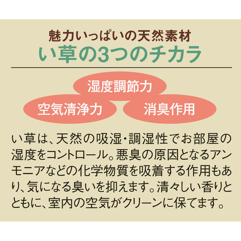 い草は非常に高い吸収性を備え、また乾燥時には水分を室内に放出する特性を持っています。湿度の変化に対応し、優れた湿度調整機能を発揮するので、一年中快適にご使用いただけます。【い草の機能2】●空気環境を整えてくれます。