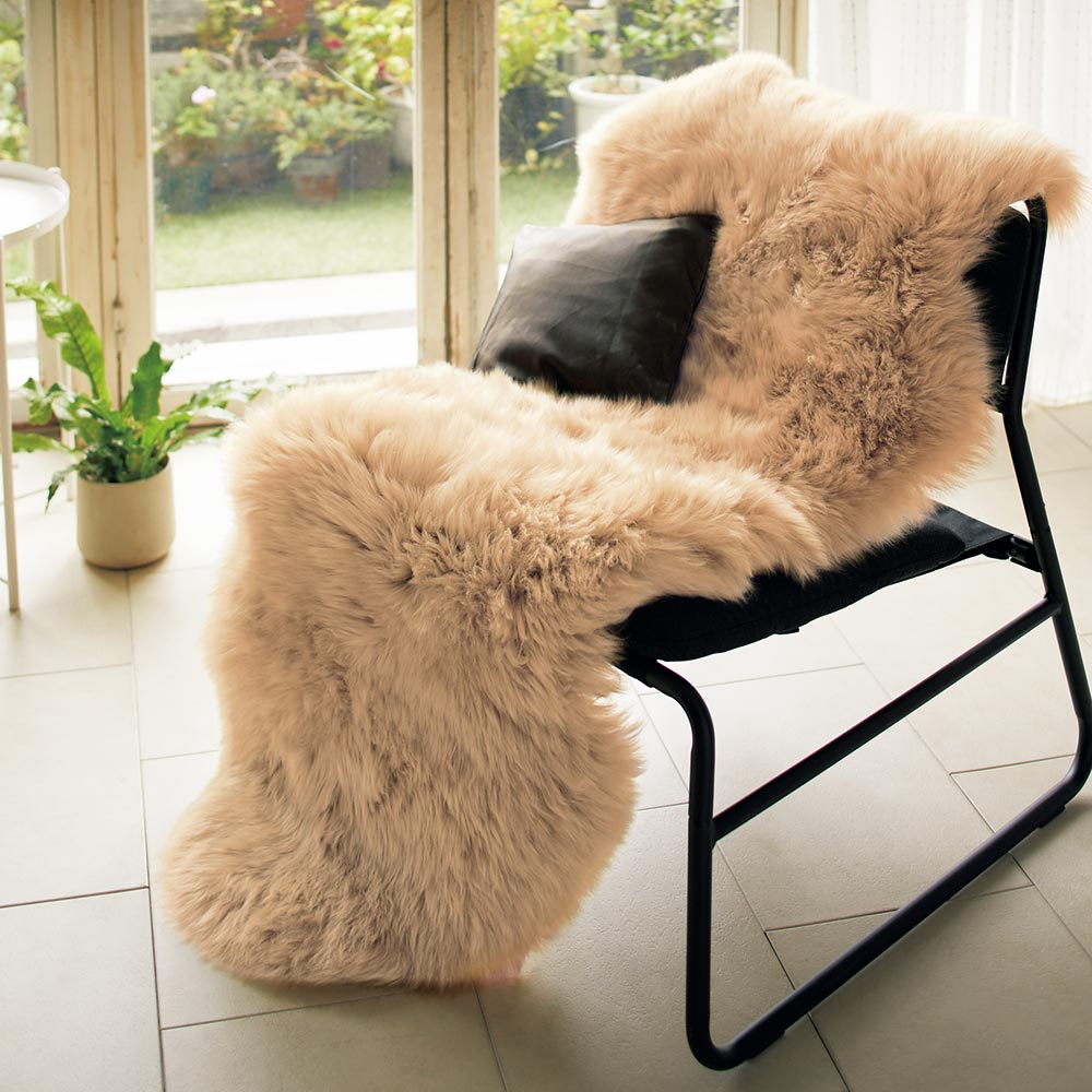 たっぷり毛足60mmのムートンで満足のボリューム感。天然の吸放湿性で、夏はサラッと冬は暖か。一年中活躍です。