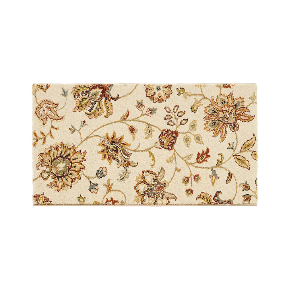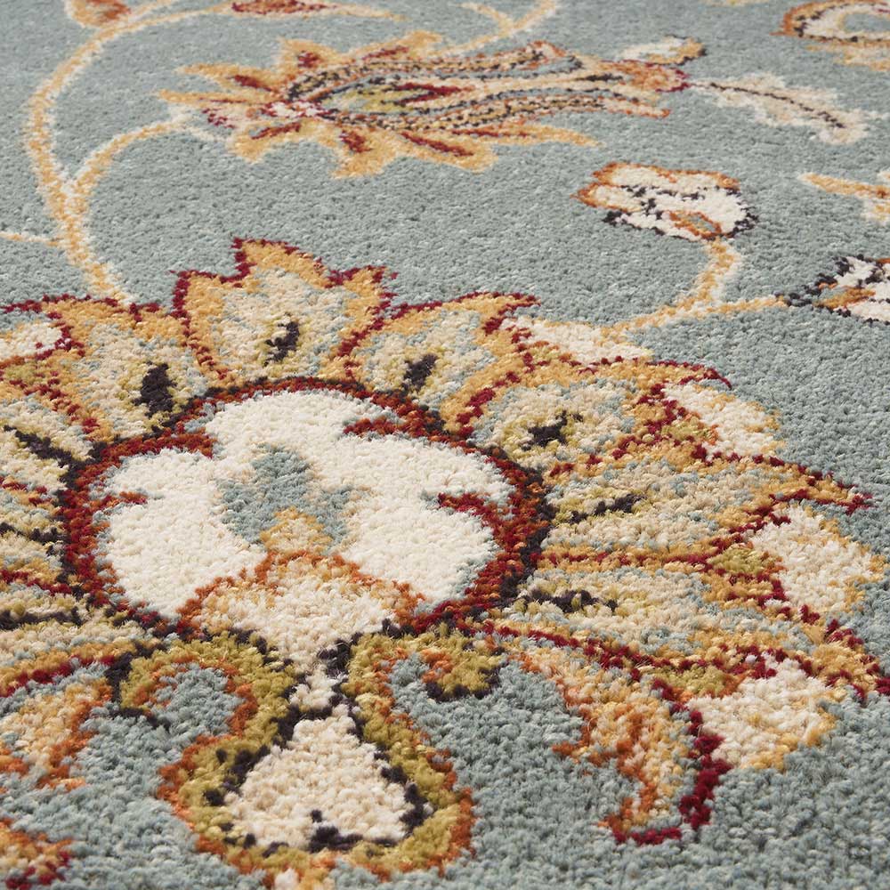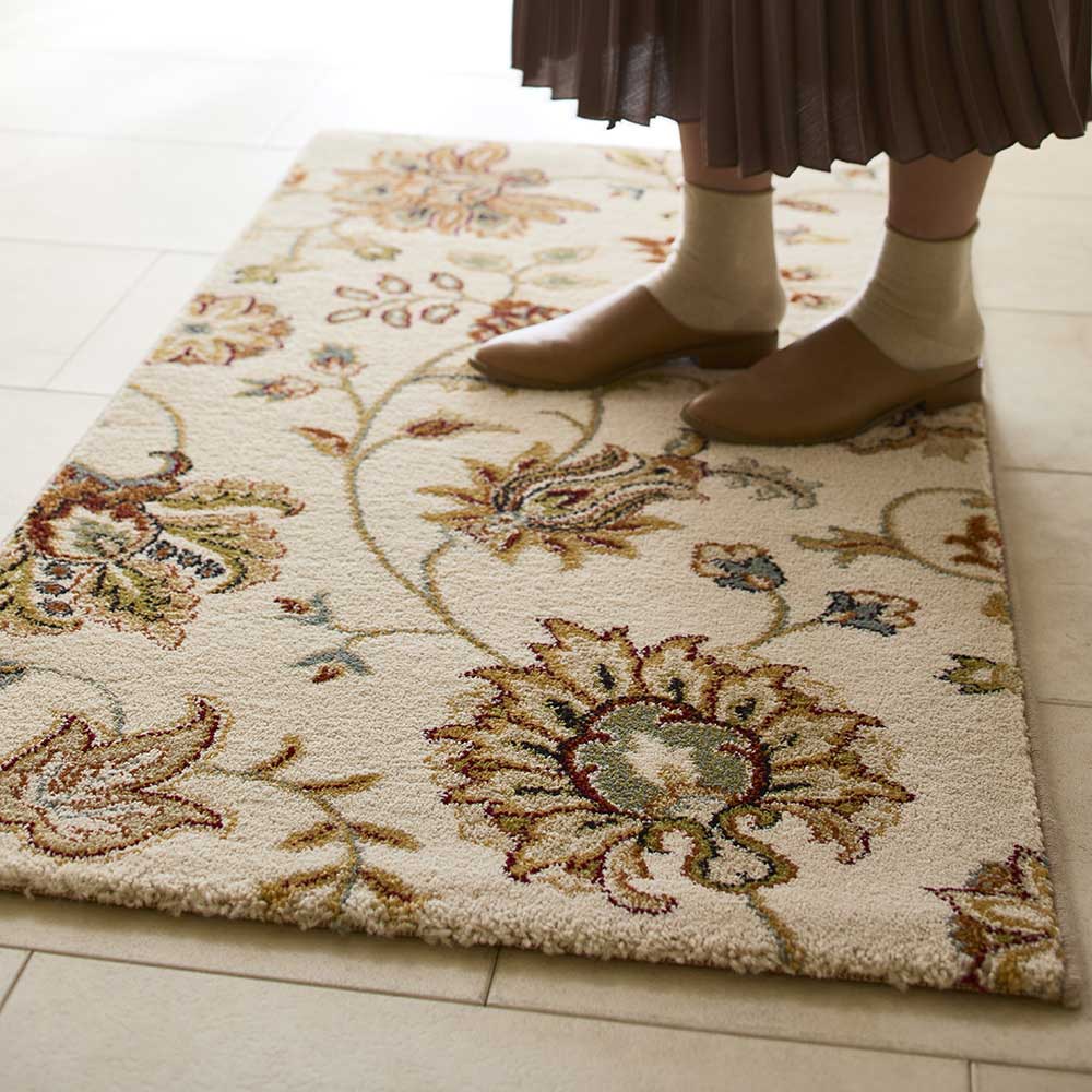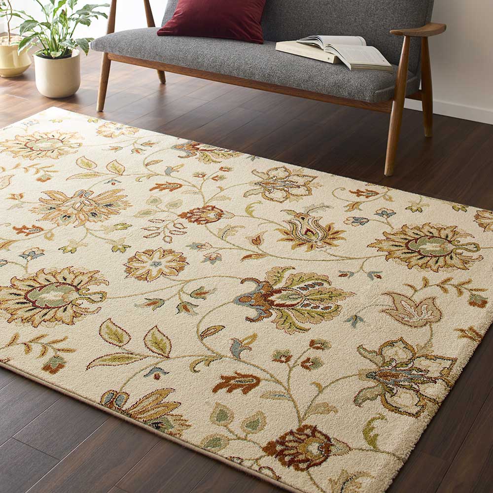 伝統的な更紗柄を織りならではの柔らかな表現でモダンに。大胆ながらダイニングから玄関まで使い勝手の良いデザインです。伝統的な更紗柄を織りならではの柔らかな表現でモダンに。大胆ながらダイニングから玄関まで使い勝手の良いデザインです。●ウィルトン織とは18世紀中期・イギリスのウィルトン市で発祥した機械織りのラグで、次のような特徴があります。【1】自由な表現力と高いデザイン性無地・柄ラグ共にパイルの長さを自由に変えることができることであらゆる表現力を持ち、デザイン性の高いラグを作ることができます。【2】頑丈なつくりで、耐久性がある表面のパイル糸以外に、地径糸(じだていと)・覆糸(おおいいと)・緯糸(よこいと)の4種類の糸を、織りこんで作ってあります。表面のパイル糸が下糸に直接絡み合わせて織り込んであるるために、パイルが抜けにくく、しっかりとした耐久性に優れた仕上がりになっています。●打込み数織りの密度を表すもので一般的には1平方メートルあたりにどれくらいの織り目があるかをノット数という単位であらわします。ノット数が多ければ多いほど高密度になり耐久性と重厚感がでるだけでなく、繊細な絵柄を表現することもできるようになり、一般的には価格も高くなります。●耐久性に優れたポリプロピレン100%ポリプロピレンは軽くて耐久性に優れ、湿気を取り込みにくく、汚れが付きにくいのが特長。濡れても乾きやすく、他の素材に比べて遊び毛がほとんど出ないので、お手入れがしやすい素材です。着色する場合は原料から染色するので堅牢度に優れ、色落ちしにくいという特性もあります。●遊び毛が出にくいヒートセット加工パイル糸に熱処理(ヒートセット加工)を施し、更に撚り加工を施すことで、やわらかな感触と弾力のあるふみ心地に。また、遊び毛が出にくくホコリが立ちにくいので、お掃除もラクに。