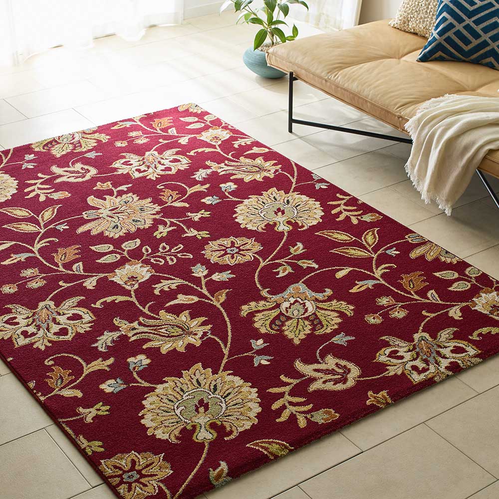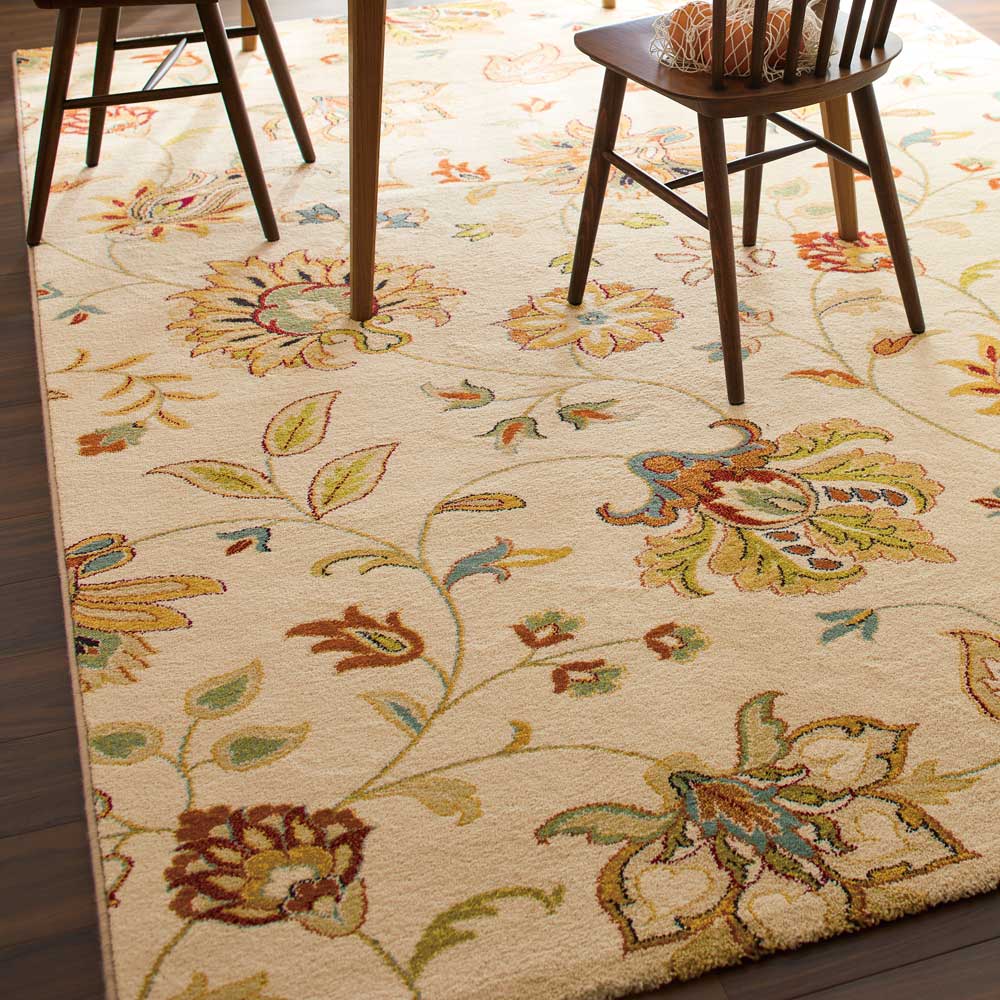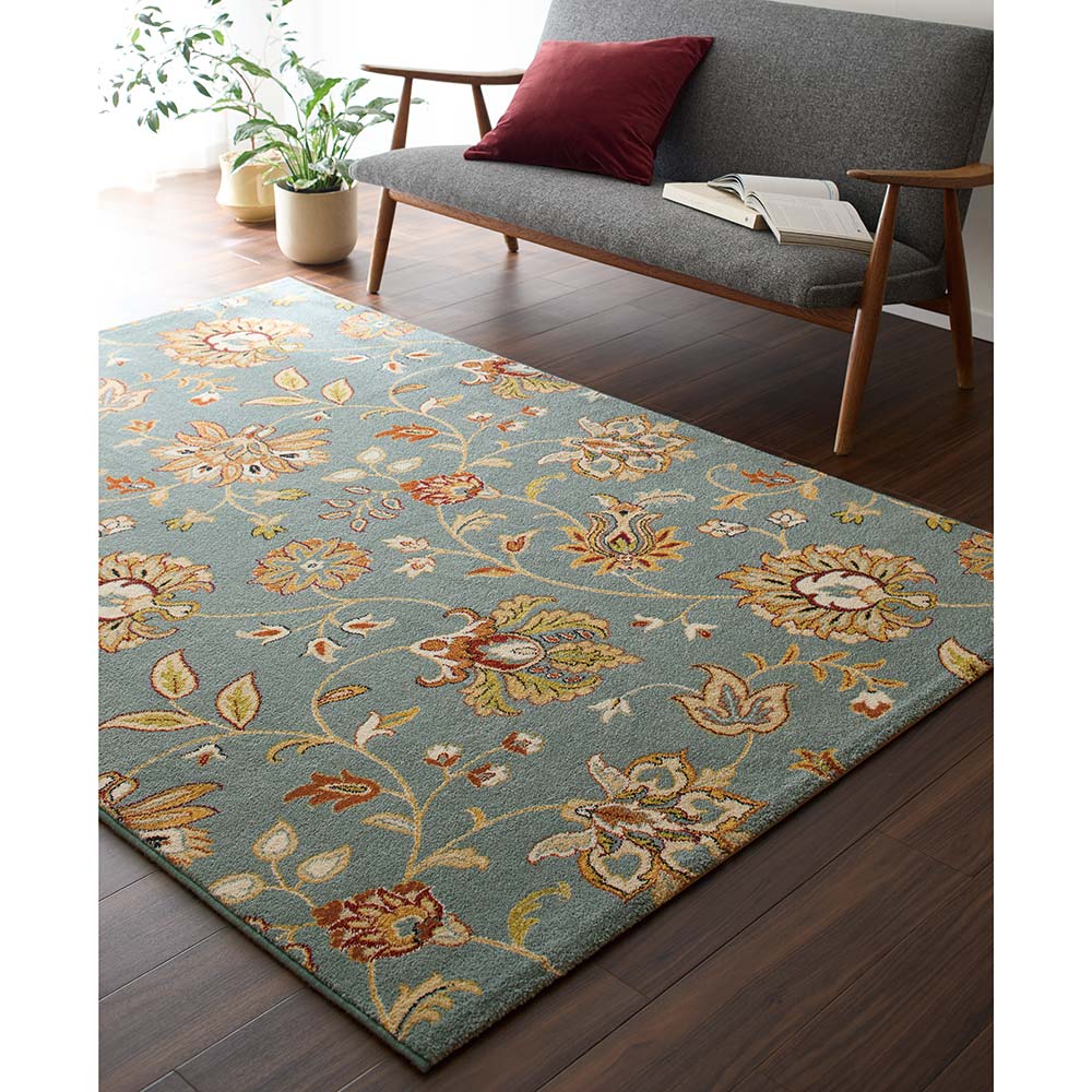 伝統的な更紗柄を織りならではの柔らかな表現でモダンに。大胆ながらダイニングから玄関まで使い勝手の良いデザインです。伝統的な更紗柄を織りならではの柔らかな表現でモダンに。大胆ながらダイニングから玄関まで使い勝手の良いデザインです。●ウィルトン織とは18世紀中期・イギリスのウィルトン市で発祥した機械織りのラグで、次のような特徴があります。【1】自由な表現力と高いデザイン性無地・柄ラグ共にパイルの長さを自由に変えることができることであらゆる表現力を持ち、デザイン性の高いラグを作ることができます。【2】頑丈なつくりで、耐久性がある表面のパイル糸以外に、地径糸(じだていと)・覆糸(おおいいと)・緯糸(よこいと)の4種類の糸を、織りこんで作ってあります。表面のパイル糸が下糸に直接絡み合わせて織り込んであるるために、パイルが抜けにくく、しっかりとした耐久性に優れた仕上がりになっています。●打込み数織りの密度を表すもので一般的には1平方メートルあたりにどれくらいの織り目があるかをノット数という単位であらわします。ノット数が多ければ多いほど高密度になり耐久性と重厚感がでるだけでなく、繊細な絵柄を表現することもできるようになり、一般的には価格も高くなります。●耐久性に優れたポリプロピレン100%ポリプロピレンは軽くて耐久性に優れ、湿気を取り込みにくく、汚れが付きにくいのが特長。濡れても乾きやすく、他の素材に比べて遊び毛がほとんど出ないので、お手入れがしやすい素材です。着色する場合は原料から染色するので堅牢度に優れ、色落ちしにくいという特性もあります。●遊び毛が出にくいヒートセット加工パイル糸に熱処理(ヒートセット加工)を施し、更に撚り加工を施すことで、やわらかな感触と弾力のあるふみ心地に。また、遊び毛が出にくくホコリが立ちにくいので、お掃除もラクに。