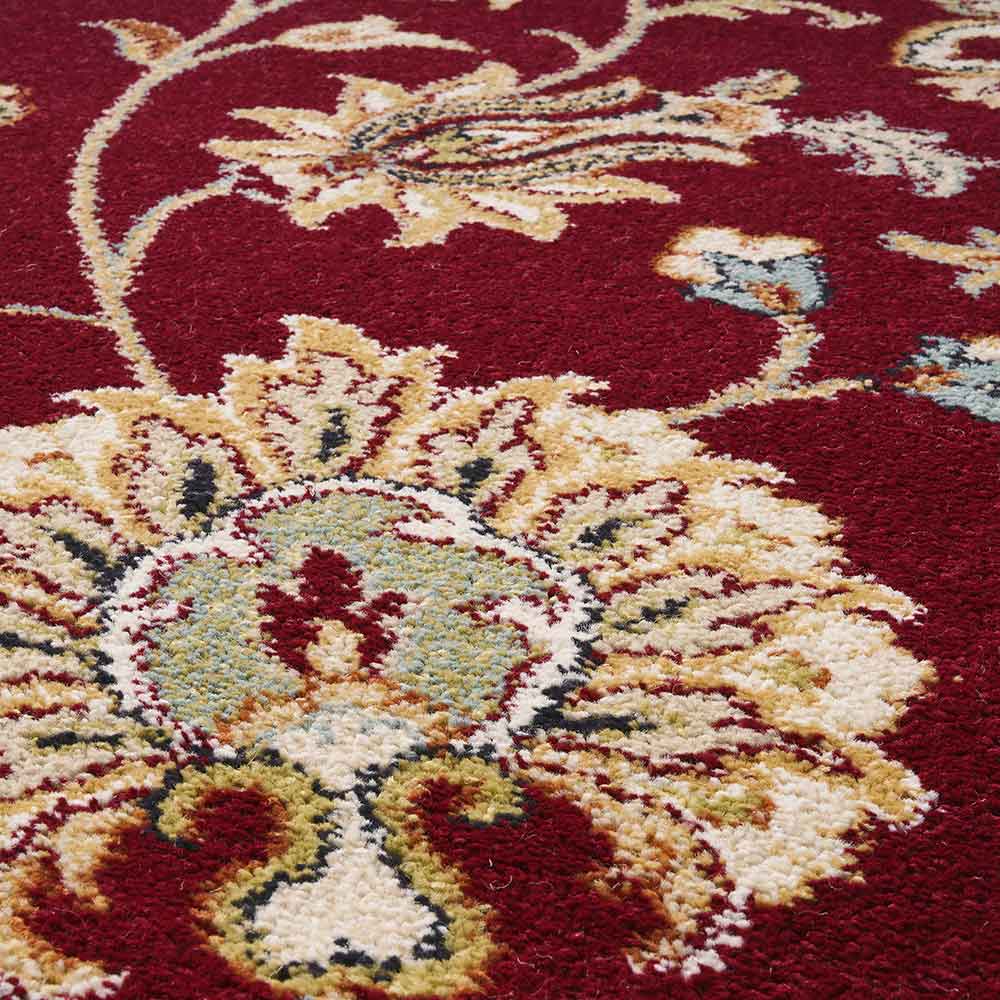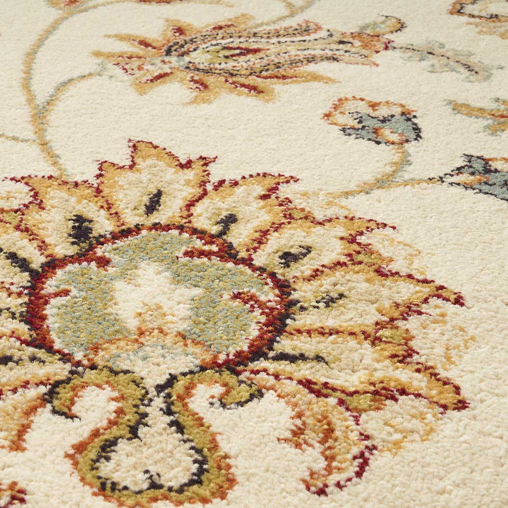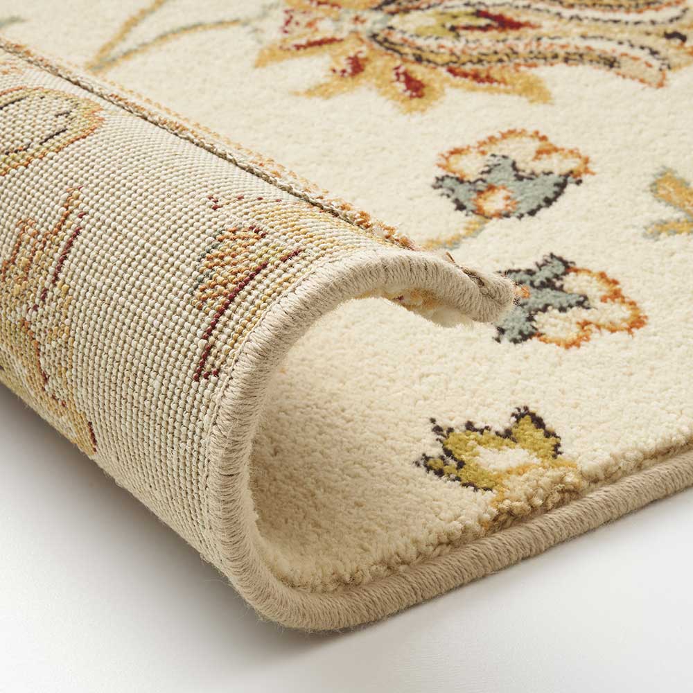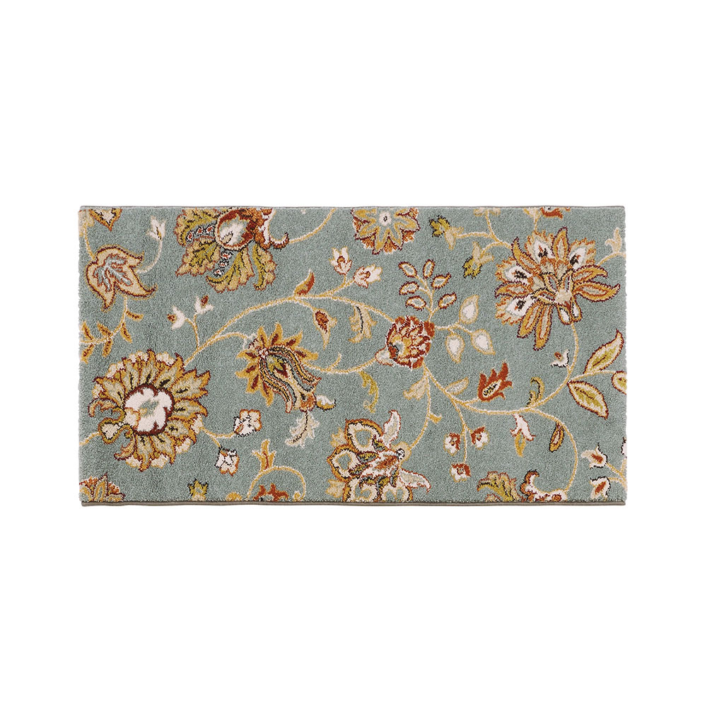 伝統的な更紗柄を織りならではの柔らかな表現でモダンに。大胆ながらダイニングから玄関まで使い勝手の良いデザインです。伝統的な更紗柄を織りならではの柔らかな表現でモダンに。大胆ながらダイニングから玄関まで使い勝手の良いデザインです。●ウィルトン織とは18世紀中期・イギリスのウィルトン市で発祥した機械織りのラグで、次のような特徴があります。【1】自由な表現力と高いデザイン性無地・柄ラグ共にパイルの長さを自由に変えることができることであらゆる表現力を持ち、デザイン性の高いラグを作ることができます。【2】頑丈なつくりで、耐久性がある表面のパイル糸以外に、地径糸(じだていと)・覆糸(おおいいと)・緯糸(よこいと)の4種類の糸を、織りこんで作ってあります。表面のパイル糸が下糸に直接絡み合わせて織り込んであるるために、パイルが抜けにくく、しっかりとした耐久性に優れた仕上がりになっています。●打込み数織りの密度を表すもので一般的には1平方メートルあたりにどれくらいの織り目があるかをノット数という単位であらわします。ノット数が多ければ多いほど高密度になり耐久性と重厚感がでるだけでなく、繊細な絵柄を表現することもできるようになり、一般的には価格も高くなります。●耐久性に優れたポリプロピレン100%ポリプロピレンは軽くて耐久性に優れ、湿気を取り込みにくく、汚れが付きにくいのが特長。濡れても乾きやすく、他の素材に比べて遊び毛がほとんど出ないので、お手入れがしやすい素材です。着色する場合は原料から染色するので堅牢度に優れ、色落ちしにくいという特性もあります。●遊び毛が出にくいヒートセット加工パイル糸に熱処理(ヒートセット加工)を施し、更に撚り加工を施すことで、やわらかな感触と弾力のあるふみ心地に。また、遊び毛が出にくくホコリが立ちにくいので、お掃除もラクに。