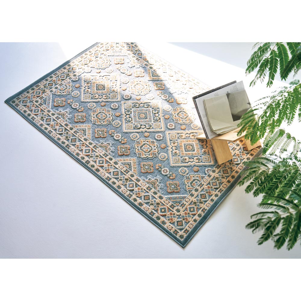 ジャカード織機で織られた織物です。立体的で複雑な柄を作ることができます。織物のため比較的薄手で床との段差もできにくく、折りたたみもしやすいので使わないときの収納にも便利です。