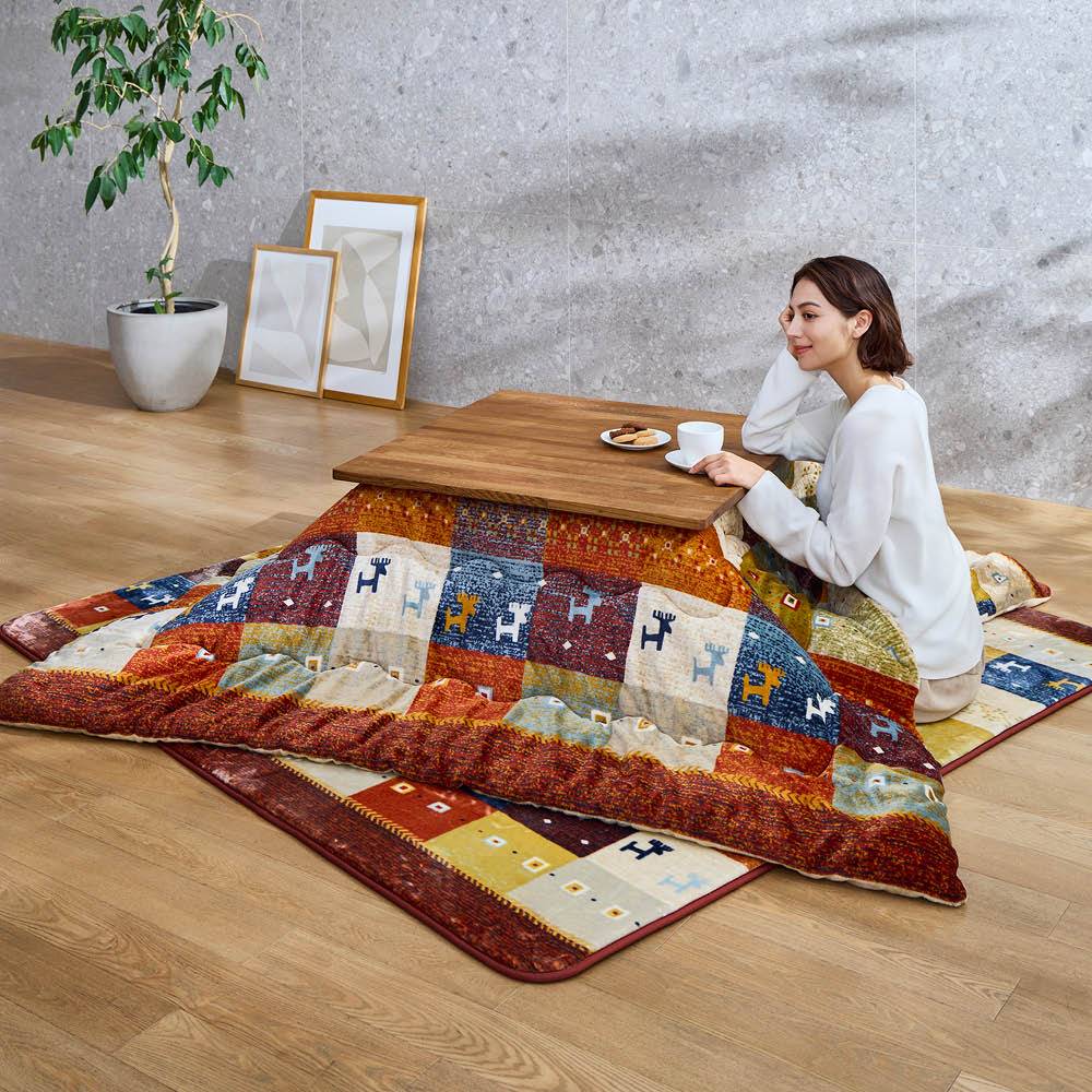 伝統的なギャッベ柄をあしらった、温もりを感じるこたつ掛布団です。木や花、動物など遊牧民の想いが込められたモチーフがリビングに映え、落ち着きのある上質な冬時間を演出します。裏地には、蓄熱・保温性に優れたグラフェン繊維を採用。別売りの同柄ラグとセットで使えば、統一感のある洗練された空間に。やさしい風合いのギャッベ柄で、冬のリビングにぬくもりをギャッベ柄のやさしい趣がリビングに落ち着いた温もりと上質な雰囲気をもたらし、冬の空間を品よく彩ります。とろける肌ざわりと高い保温性で、ずっと触れていたくなる心地よさ表生地は、とろけるようなタッチのマイクロファイバーフランネル。裏生地にはグラフェン繊維を使用し、蓄熱&保温であったか。清潔に使える機能性も魅力です。すばやく暖まり、じんわり保温。高機能素材「グラフェン繊維」を採用軽くて丈夫なグラフェン繊維を裏地に使用。熱伝導性に優れ、すぐに暖かく。蓄熱・保温性も高く、ポカポカが長続きする、次世代の高機能素材です。飲み物をこぼしても安心。はっ水加工で汚れにくさも◎こたつのある暮らしに、うれしい安心感。はっ水加工でうっかり飲み物をこぼしても汚れにくく、小さなお子さまやペットのいるご家庭にもおすすめです。同柄ラグで統一感を演出。ラグだけで使えば、オールシーズン活躍別売りのラグを合わせることで一気におしゃれ度アップ。素敵なギャッベ柄はラグだけで使っても絵になるので、季節を問わずお使いいただけます。