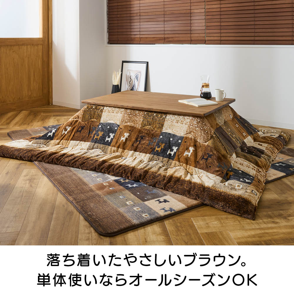 やさしい風合いのギャッベ柄ラグが、冬のリビングにぬくもりで満たすギャッベ柄が醸し出すやさしい趣のラグが、リビングに落ち着いた温もりと上質な雰囲気に。セットのこたつ布団と使うのはもちろん、単体でもお部屋をおしゃれに彩ります。