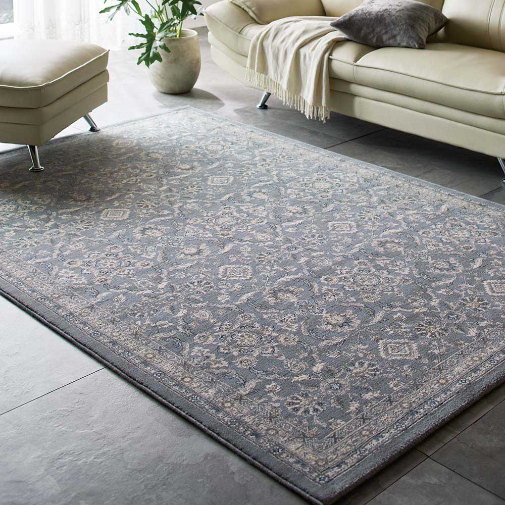 伝統のオリエンタル柄が繊細な配色のボカシ表現で織られたアンティーク調のデザイン。耐久性のある素材で肌触りも柔らかです。ウィルトン織機を使い、高密度(100万point/m2)に織り上げ、繊細にデザインを表現。伝統的なオリエンタル柄をシンメトリーに配置、細ボーダーで締めました。アンティーク調に色を表現。敢えてボカシ風(ヴィンテージ風)に織り上げ、オールドクラシック調に表現しています。【ウィルトン織】18世紀中期・イギリスのウィルトン市で発祥した機械織りのラグで、次のような特徴があります。【1】自由な表現力と高いデザイン性無地・柄ラグ共にパイルの長さを自由に変えることができることであらゆる表現力を持ち、デザイン性の高いラグを作ることができます。【2】頑丈なつくりで、耐久性がある表面のパイル糸以外に、地径糸(じだていと)・覆糸(おおいいと)・緯糸(よこいと)の4種類の糸を、織りこんで作ってあります。表面のパイル糸が下糸に直接絡み合わせて織り込んであるるために、パイルが抜けにくく、しっかりとした耐久性に優れた仕上がりになっています。【打込み数】織りの密度を表すもので一般的には1平方メートルあたりにどれくらいの織り目があるかをポイント数という単位であらわします。 ポイント数が多ければ多いほど高密度になり耐久性と重厚感がでるだけでなく、繊細な絵柄を表現することもできるようになり、一般的には価格も高くなります。【ポリプロピレン素材の特徴】ポリプロピレンは耐久性に優れた軽い素材で、吸湿性がないので濡れても乾きやすく、その分お手入れがしやすい素材です。着色する場合は原料から染色するので堅牢度に優れ、色落ちしにくいという特性も持っています。また他の素材に比べて遊び毛がほとんど出ないのも特徴です。【遊び毛が出にくいヒートセット加工】パイル糸に熱処理(ヒートセット加工)を施し、更に撚り加工を施すことで、やわらかな感触と弾力のあるふみ心地に。また、遊び毛が出にくくホコリが立ちにくいので、お掃除もラクに。【床暖房・ホットカーペット対応】床暖房がある部屋に、ラグやカーペットを敷きたいと考えている方におすすめ。ホットカーペットや床暖房にも対応しているため、オールシーズンで使えます。