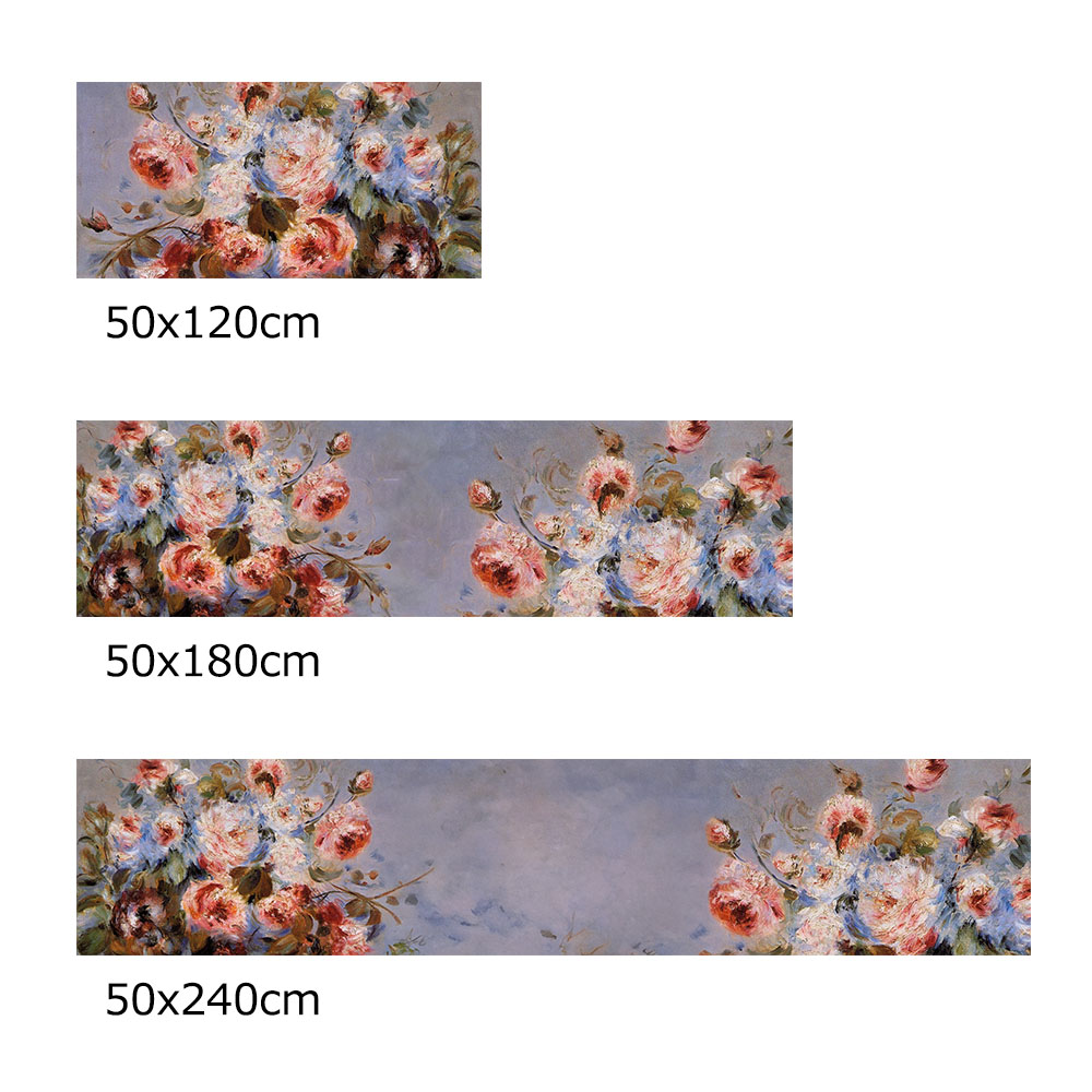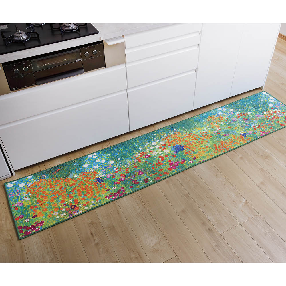 巨匠たちの名画をモチーフにした華やかなロングマットです。クリムトの「フラワーガーデン」、ゴッホの「花咲くアーモンドの木の枝」、モネの「睡蓮」、ルノワール「ワーグモントのばら」をシェニール生地に鮮やかに表現しました。裏面は滑りにくい仕様で、汚れたら手洗いできるので清潔に保てます。敷くだけで日常の空間を格調高く演出する、贈り物にもおすすめの一品です。