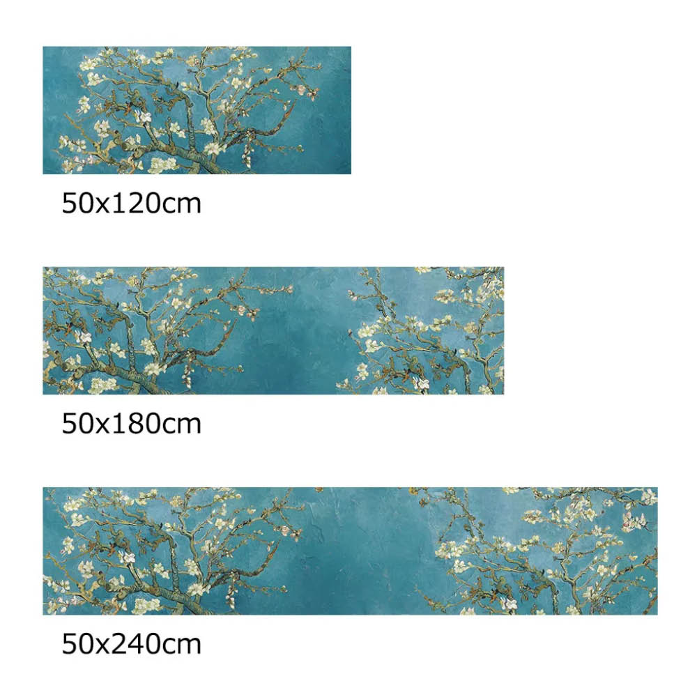 巨匠たちの名画をモチーフにした華やかなロングマットです。クリムトの「フラワーガーデン」、ゴッホの「花咲くアーモンドの木の枝」、モネの「睡蓮」、ルノワール「ワーグモントのばら」をシェニール生地に鮮やかに表現しました。裏面は滑りにくい仕様で、汚れたら手洗いできるので清潔に保てます。敷くだけで日常の空間を格調高く演出する、贈り物にもおすすめの一品です。