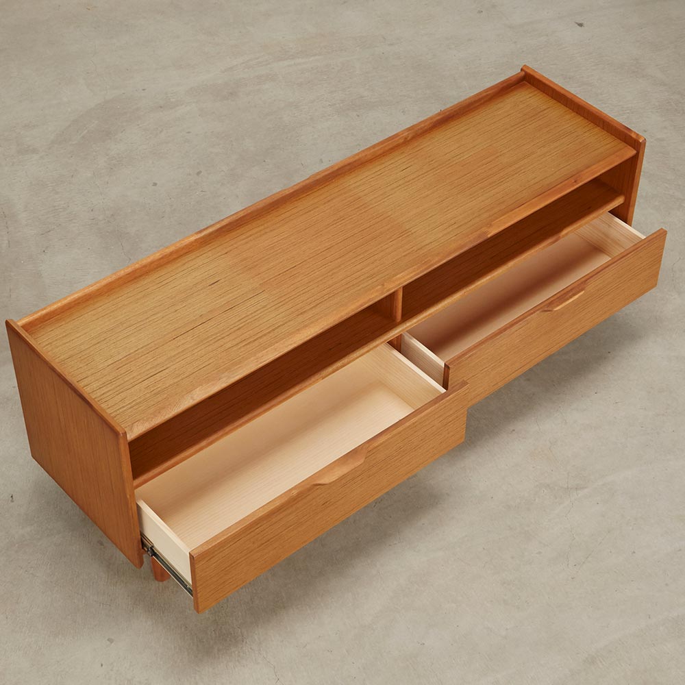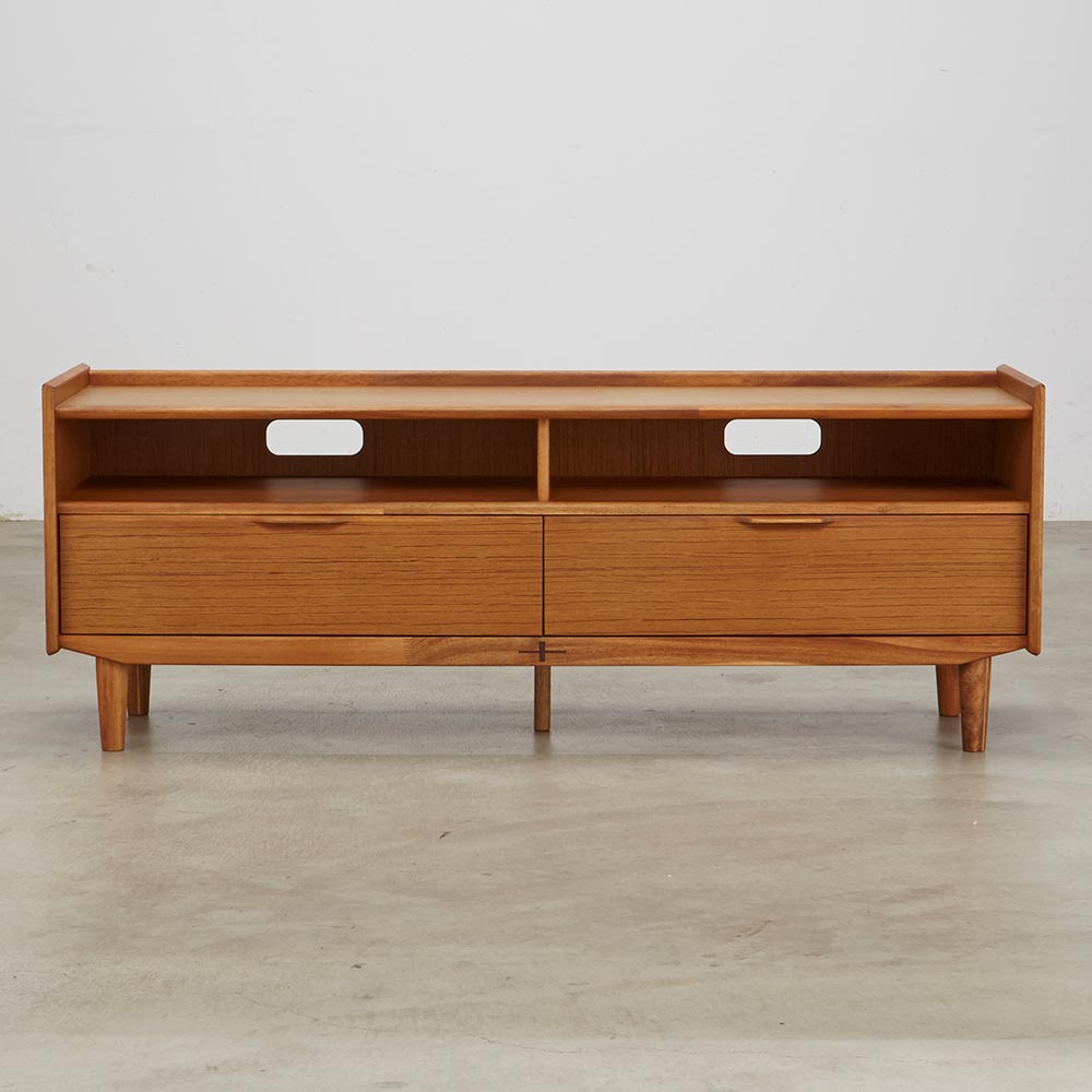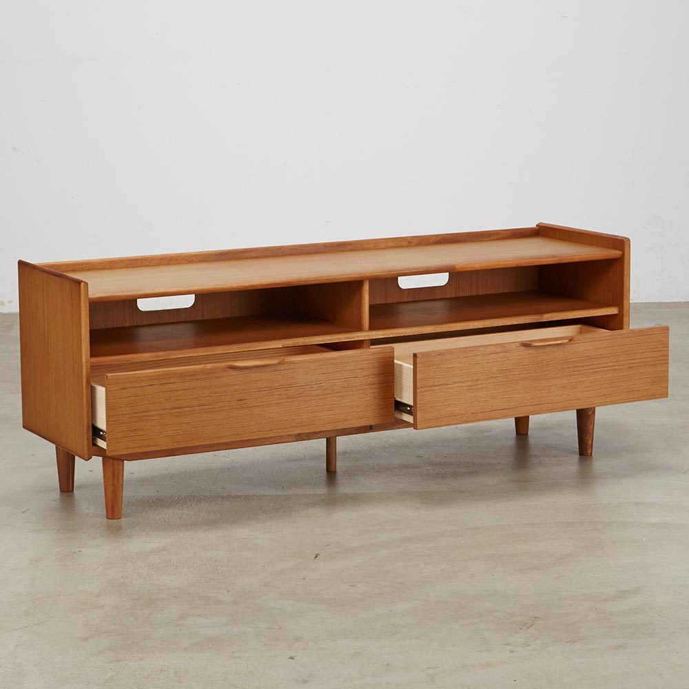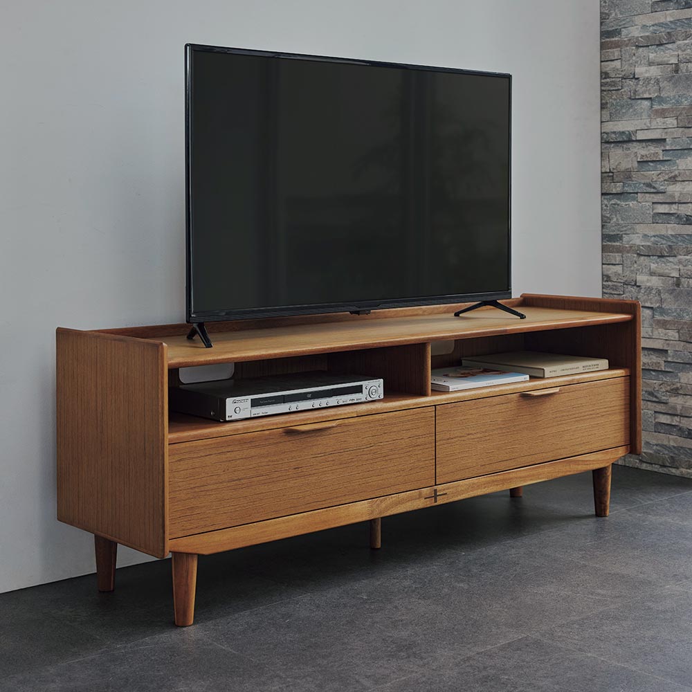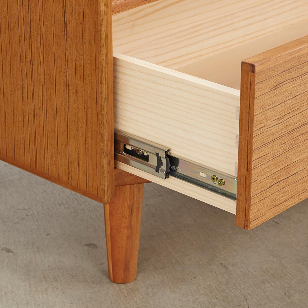 北欧ヴィンテージ家具のディテールを踏襲しつつ、日本の住宅事情に合わせたサイズのテレビボード。本物の北欧アンティーク家具に多用されている人気のチーク材を使用しているので、スカンジナビア風のお部屋コーディネートにお勧めです。北欧ヴィンテージ家具のディテールを踏襲チークの木目が美しい突き板仕様、柔らかい曲線でやさしく手になじむ取っ手、先端に向かって細くテーパードした脚など、手間暇を惜しまず熟練の技で仕上げた造りも特徴です。仕上げ塗料の原料には日本伝統の荏胡麻を使用。乾燥に時間がかかりますが、食用のため安全性が高く、化学物質を含まないので木が呼吸し続けることができます。