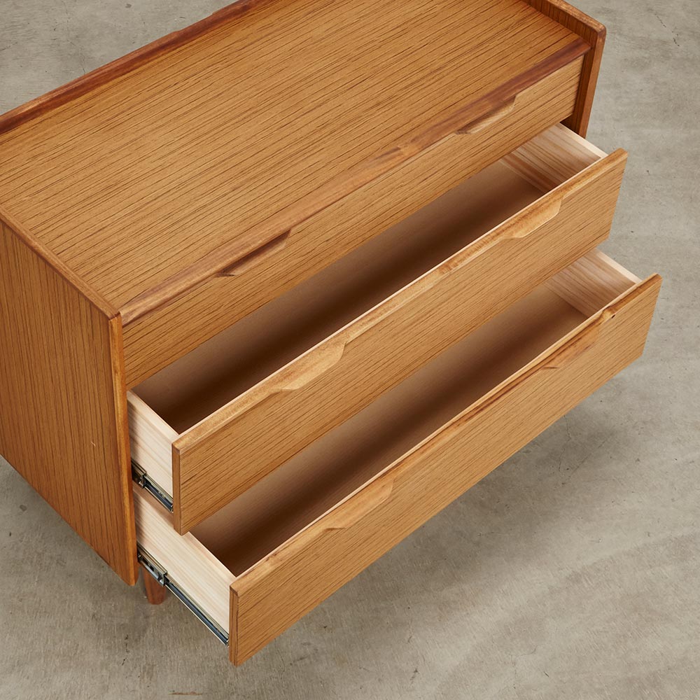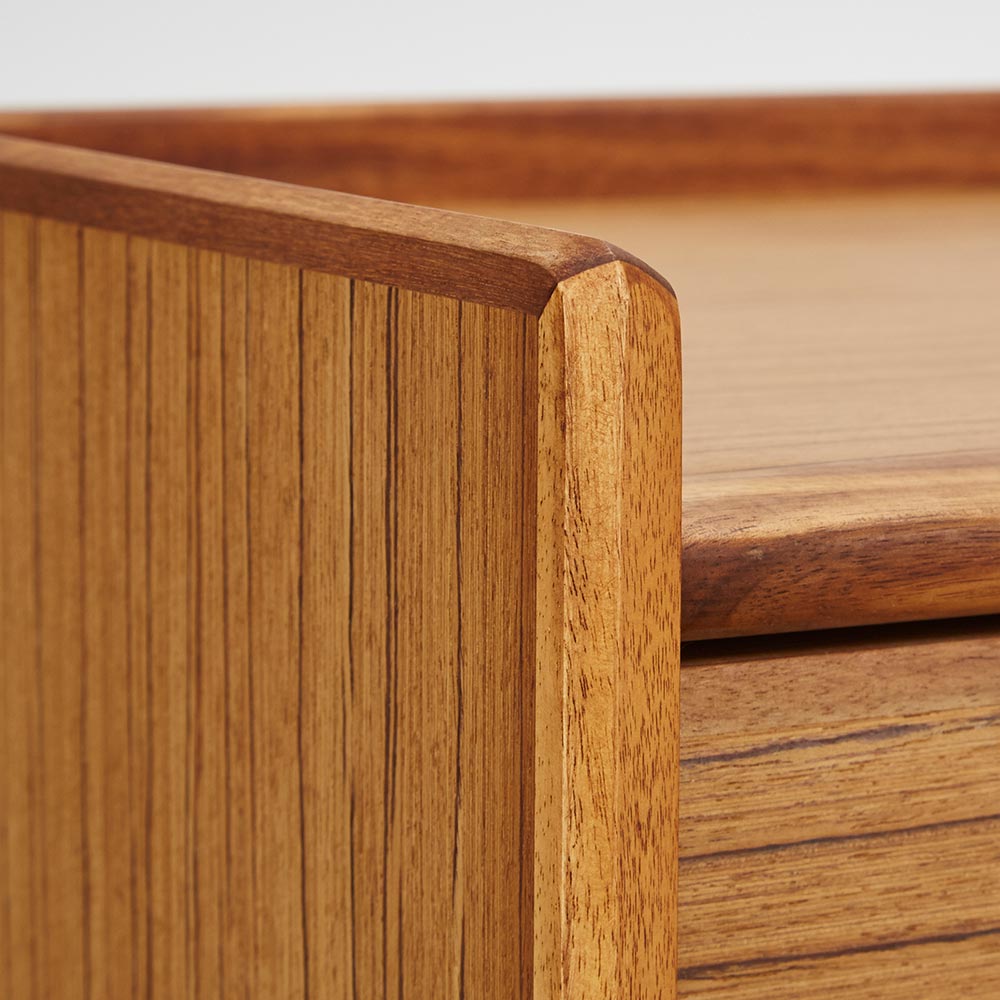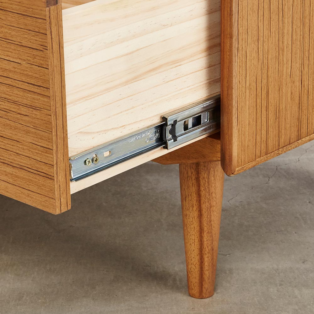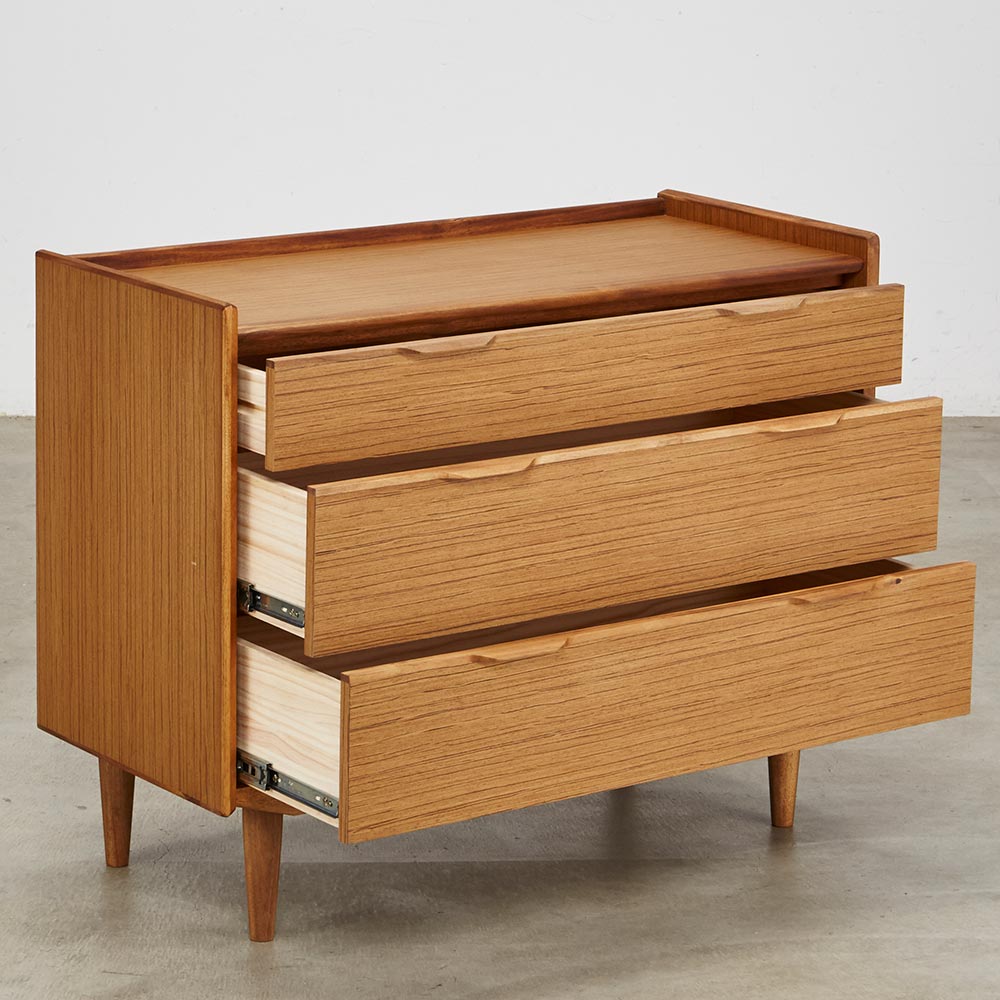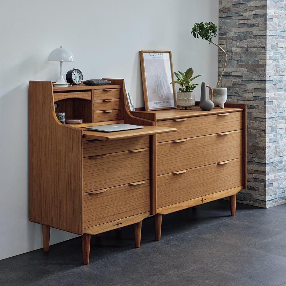 北欧ヴィンテージ家具のディテールを踏襲しながら、日本の住宅事情で使いやすいサイズに仕上げた収納家具。本物の北欧アンティーク家具に多用されている人気のチーク材を使用しているので、スカンジナビア風のお部屋コーディネートにお勧めです。人気の北欧ヴィンテージスタイルを彷彿とさせるデザイン収納家具●北欧ヴィンテージ家具のディテールにこだわったチークの木目が美しい突き板仕様。●アンティーク調デザインと天然木の素材感を存分に味わえるリビングチェストです。●角の丸み加工も、北欧スタイルのやさしい表情を見せます。●柔らかい曲線で手になじむ取っ手、テーパードした脚などレトロなデザインが詰まっています。●深みのある色と質感で北欧スカンジナビアンスタイルの家具やお部屋コーディネートにおすすめです。●北欧スタイルのインテリアや雑貨は和にも馴染む人気のインテリアスタイルです。●人気のインテリアグリーンとも相性がよく、清々しいスカンジナビアンスタイルを叶えます。●見て触ってやさしく、天然木の温もりを楽しめるおすすめの家具シリーズです。チーク材の質感を最大限に引き出す仕上げにこだわりました●荏胡麻オイルフィニッシュを施し、天然木の魅力ある表情や色・質感をお楽しみいただけます。●荏胡麻オイルは化学塗料と異なり、木が家具となってからもずっと呼吸を続けることができます。また人への安全性も高い天然素材のオイルです。●木はひとつひとつその表情が異なり、年月を重ねるとさらに木目や節が馴染み変化します。●使い込んで味わい深く変わっていくのをお楽しみいただけるヴィンテージデザイン家具です。収納家具として使いやすい機能性を備えています●引き出しの2段目と最下段はフルスライドレール仕様で奥の収納物まで見渡せます。●引き出しはあり組仕様でしっかりとした強度のあるつくりです。●最上段の引き出しは仕切り付きでリビング小物などを分類して収納できます。●天板奥にはコード穴を設けており、照明などの家電類を置いて配線がしやすい仕様です。