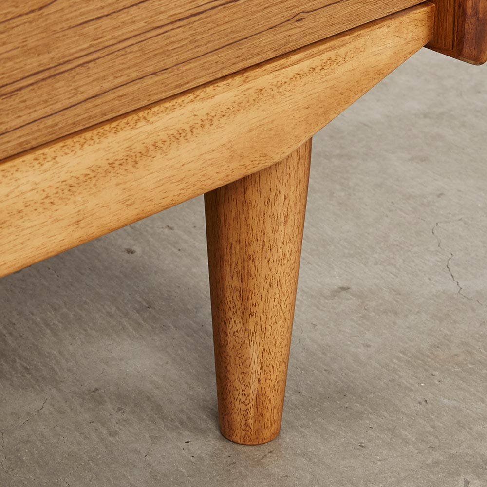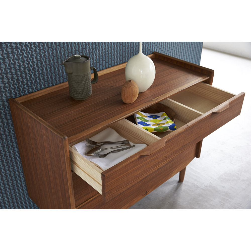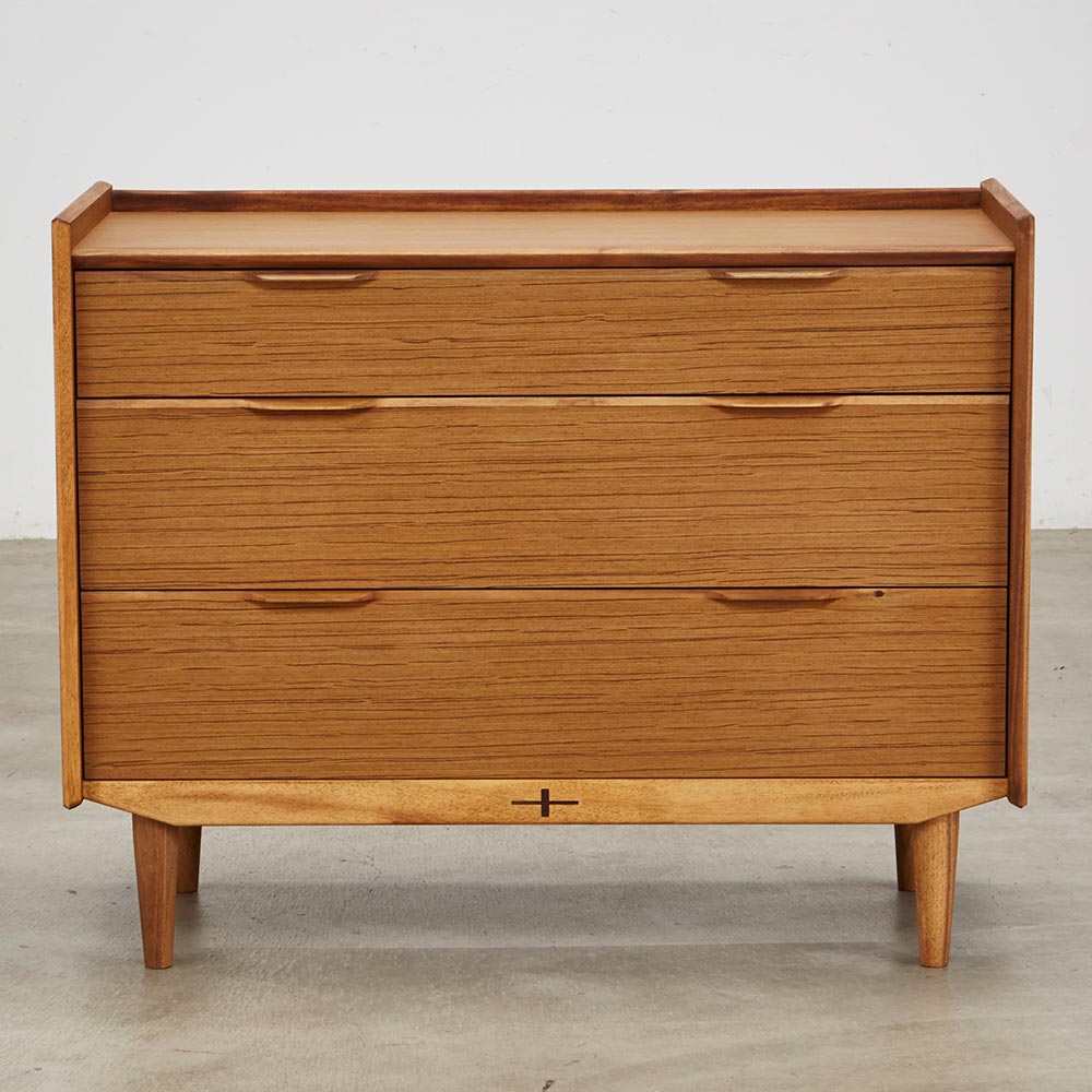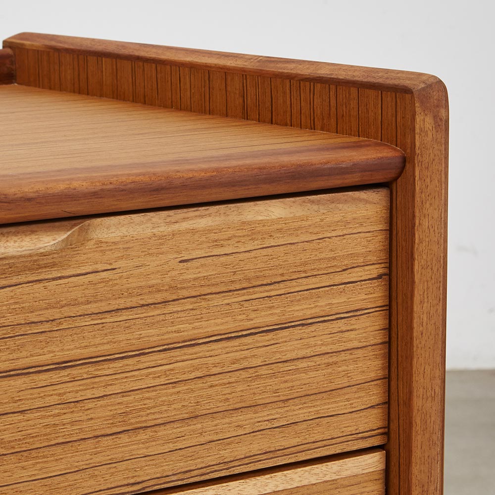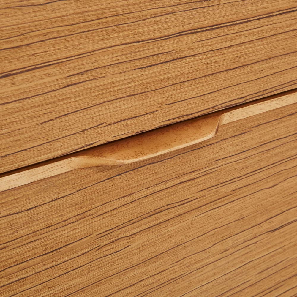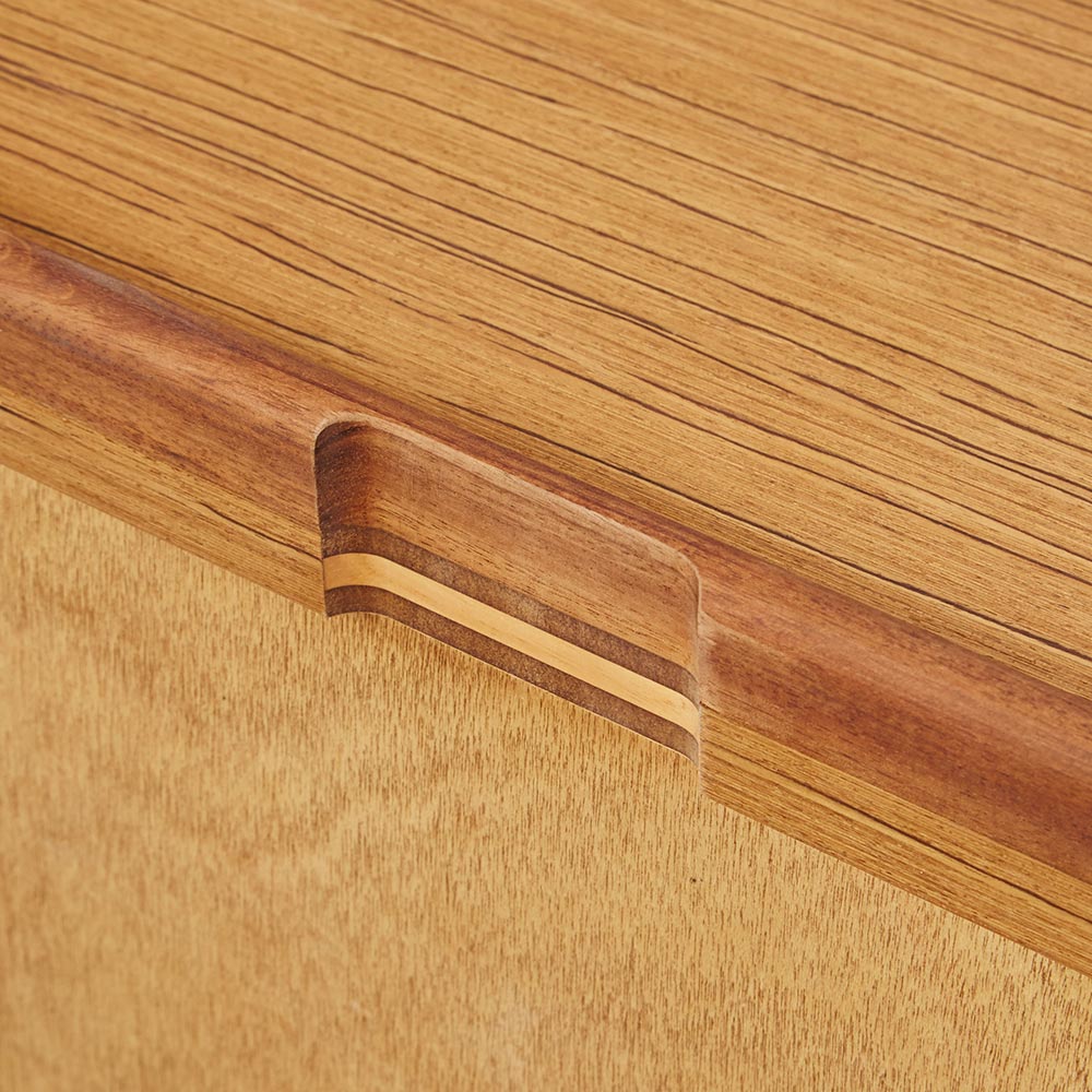 北欧ヴィンテージ家具のディテールを踏襲しながら、日本の住宅事情で使いやすいサイズに仕上げた収納家具。本物の北欧アンティーク家具に多用されている人気のチーク材を使用しているので、スカンジナビア風のお部屋コーディネートにお勧めです。人気の北欧ヴィンテージスタイルを彷彿とさせるデザイン収納家具●北欧ヴィンテージ家具のディテールにこだわったチークの木目が美しい突き板仕様。●アンティーク調デザインと天然木の素材感を存分に味わえるリビングチェストです。●角の丸み加工も、北欧スタイルのやさしい表情を見せます。●柔らかい曲線で手になじむ取っ手、テーパードした脚などレトロなデザインが詰まっています。●深みのある色と質感で北欧スカンジナビアンスタイルの家具やお部屋コーディネートにおすすめです。●北欧スタイルのインテリアや雑貨は和にも馴染む人気のインテリアスタイルです。●人気のインテリアグリーンとも相性がよく、清々しいスカンジナビアンスタイルを叶えます。●見て触ってやさしく、天然木の温もりを楽しめるおすすめの家具シリーズです。チーク材の質感を最大限に引き出す仕上げにこだわりました●荏胡麻オイルフィニッシュを施し、天然木の魅力ある表情や色・質感をお楽しみいただけます。●荏胡麻オイルは化学塗料と異なり、木が家具となってからもずっと呼吸を続けることができます。また人への安全性も高い天然素材のオイルです。●木はひとつひとつその表情が異なり、年月を重ねるとさらに木目や節が馴染み変化します。●使い込んで味わい深く変わっていくのをお楽しみいただけるヴィンテージデザイン家具です。収納家具として使いやすい機能性を備えています●引き出しの2段目と最下段はフルスライドレール仕様で奥の収納物まで見渡せます。●引き出しはあり組仕様でしっかりとした強度のあるつくりです。●最上段の引き出しは仕切り付きでリビング小物などを分類して収納できます。●天板奥にはコード穴を設けており、照明などの家電類を置いて配線がしやすい仕様です。