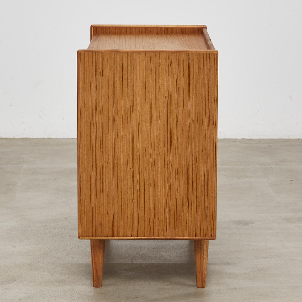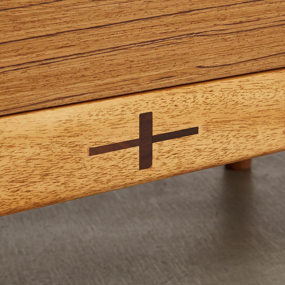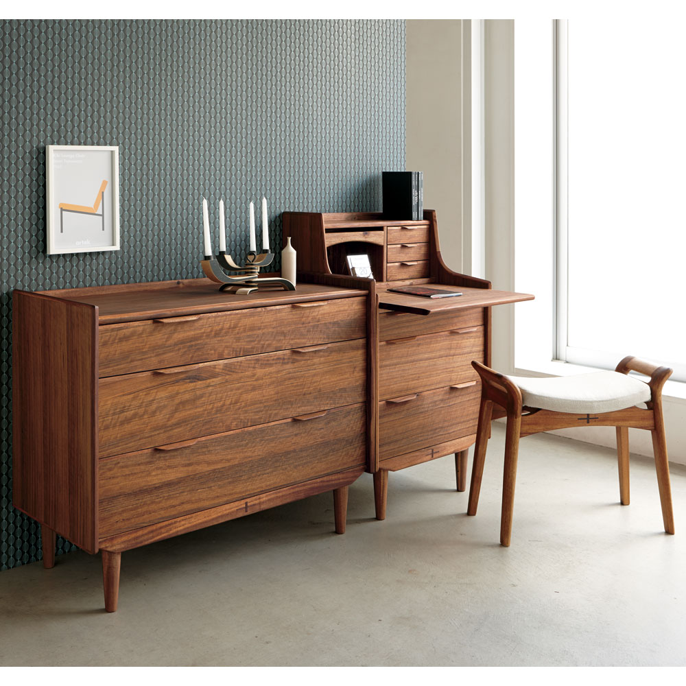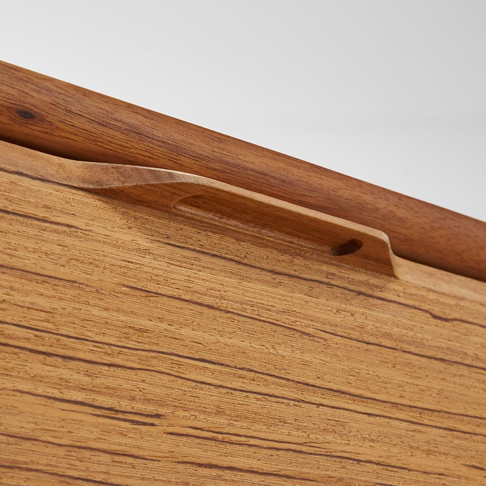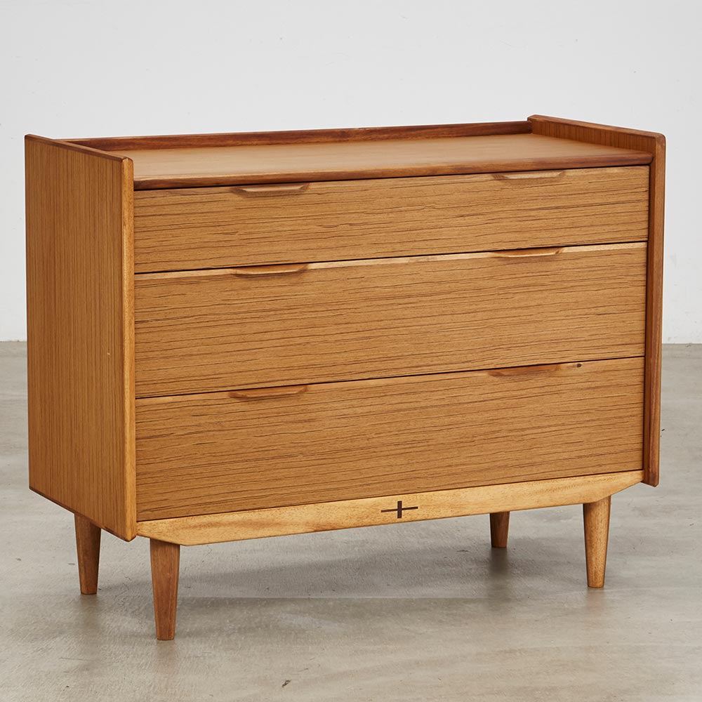 北欧ヴィンテージ家具のディテールを踏襲しながら、日本の住宅事情で使いやすいサイズに仕上げた収納家具。本物の北欧アンティーク家具に多用されている人気のチーク材を使用しているので、スカンジナビア風のお部屋コーディネートにお勧めです。人気の北欧ヴィンテージスタイルを彷彿とさせるデザイン収納家具●北欧ヴィンテージ家具のディテールにこだわったチークの木目が美しい突き板仕様。●アンティーク調デザインと天然木の素材感を存分に味わえるリビングチェストです。●角の丸み加工も、北欧スタイルのやさしい表情を見せます。●柔らかい曲線で手になじむ取っ手、テーパードした脚などレトロなデザインが詰まっています。●深みのある色と質感で北欧スカンジナビアンスタイルの家具やお部屋コーディネートにおすすめです。●北欧スタイルのインテリアや雑貨は和にも馴染む人気のインテリアスタイルです。●人気のインテリアグリーンとも相性がよく、清々しいスカンジナビアンスタイルを叶えます。●見て触ってやさしく、天然木の温もりを楽しめるおすすめの家具シリーズです。チーク材の質感を最大限に引き出す仕上げにこだわりました●荏胡麻オイルフィニッシュを施し、天然木の魅力ある表情や色・質感をお楽しみいただけます。●荏胡麻オイルは化学塗料と異なり、木が家具となってからもずっと呼吸を続けることができます。また人への安全性も高い天然素材のオイルです。●木はひとつひとつその表情が異なり、年月を重ねるとさらに木目や節が馴染み変化します。●使い込んで味わい深く変わっていくのをお楽しみいただけるヴィンテージデザイン家具です。収納家具として使いやすい機能性を備えています●引き出しの2段目と最下段はフルスライドレール仕様で奥の収納物まで見渡せます。●引き出しはあり組仕様でしっかりとした強度のあるつくりです。●最上段の引き出しは仕切り付きでリビング小物などを分類して収納できます。●天板奥にはコード穴を設けており、照明などの家電類を置いて配線がしやすい仕様です。
