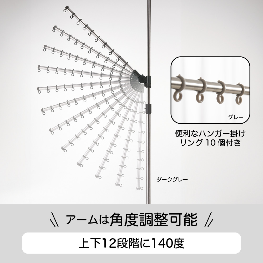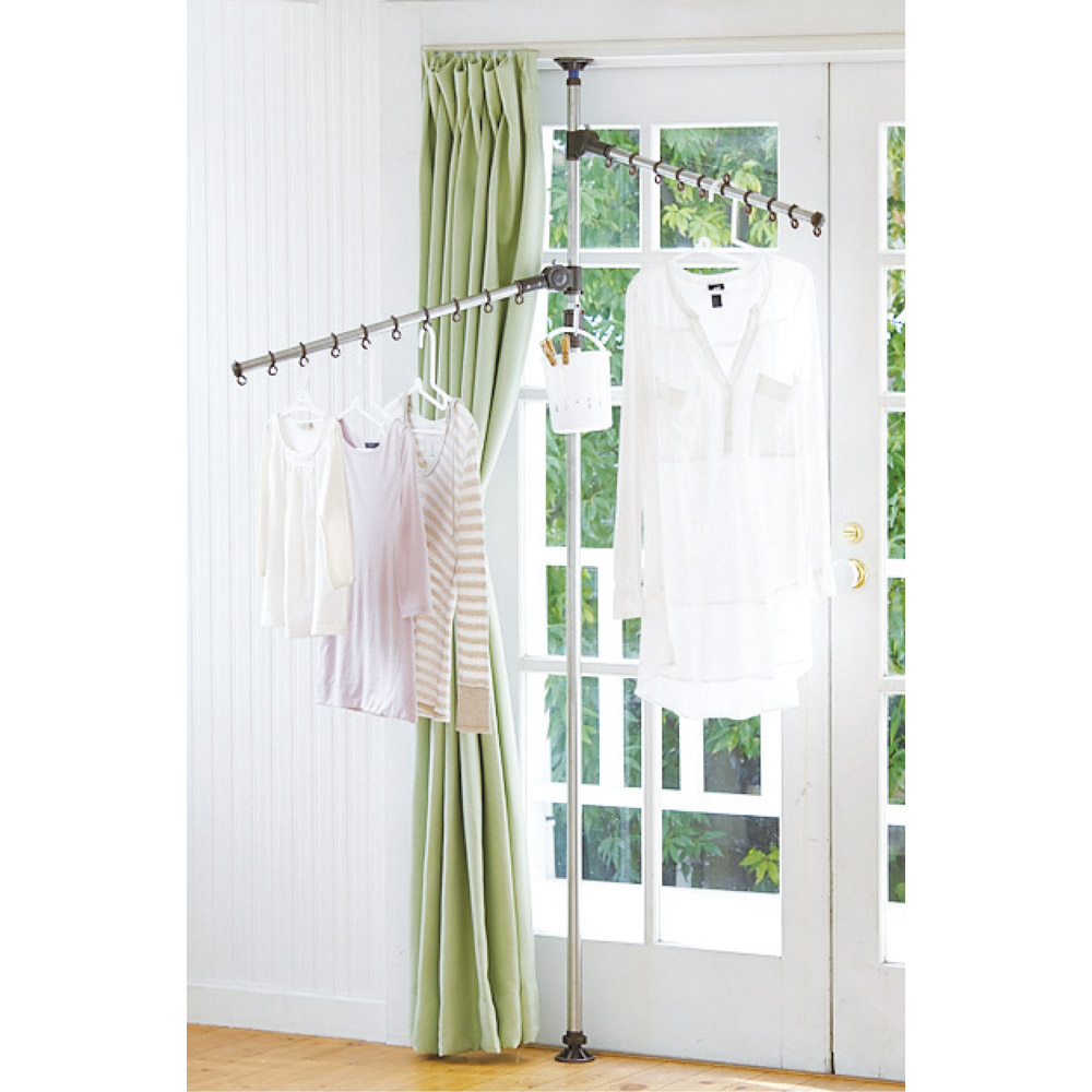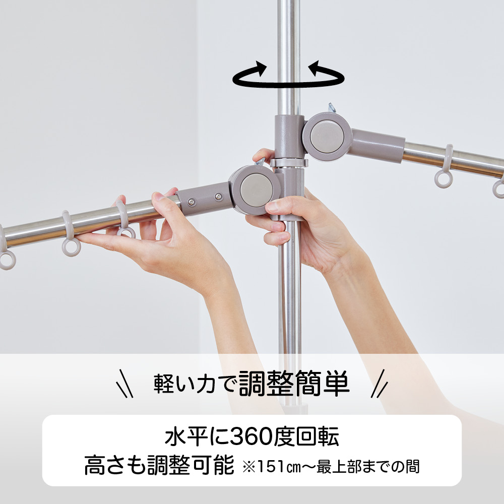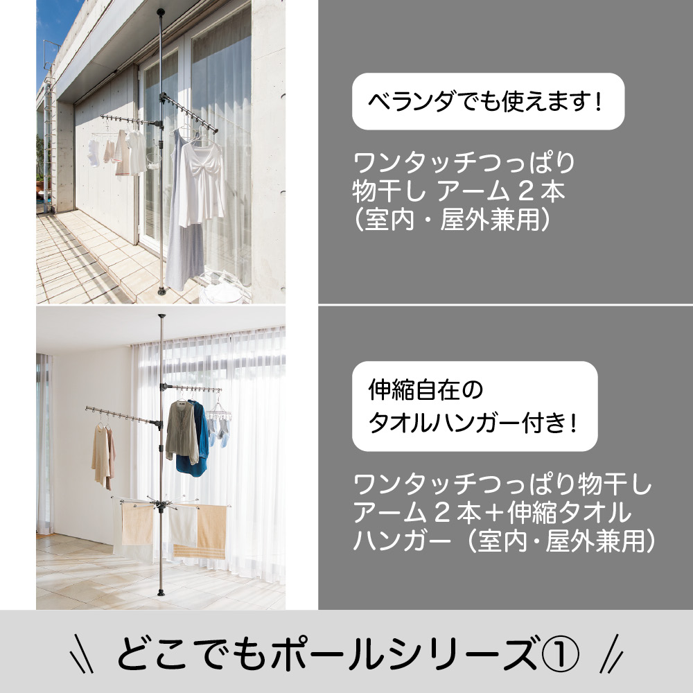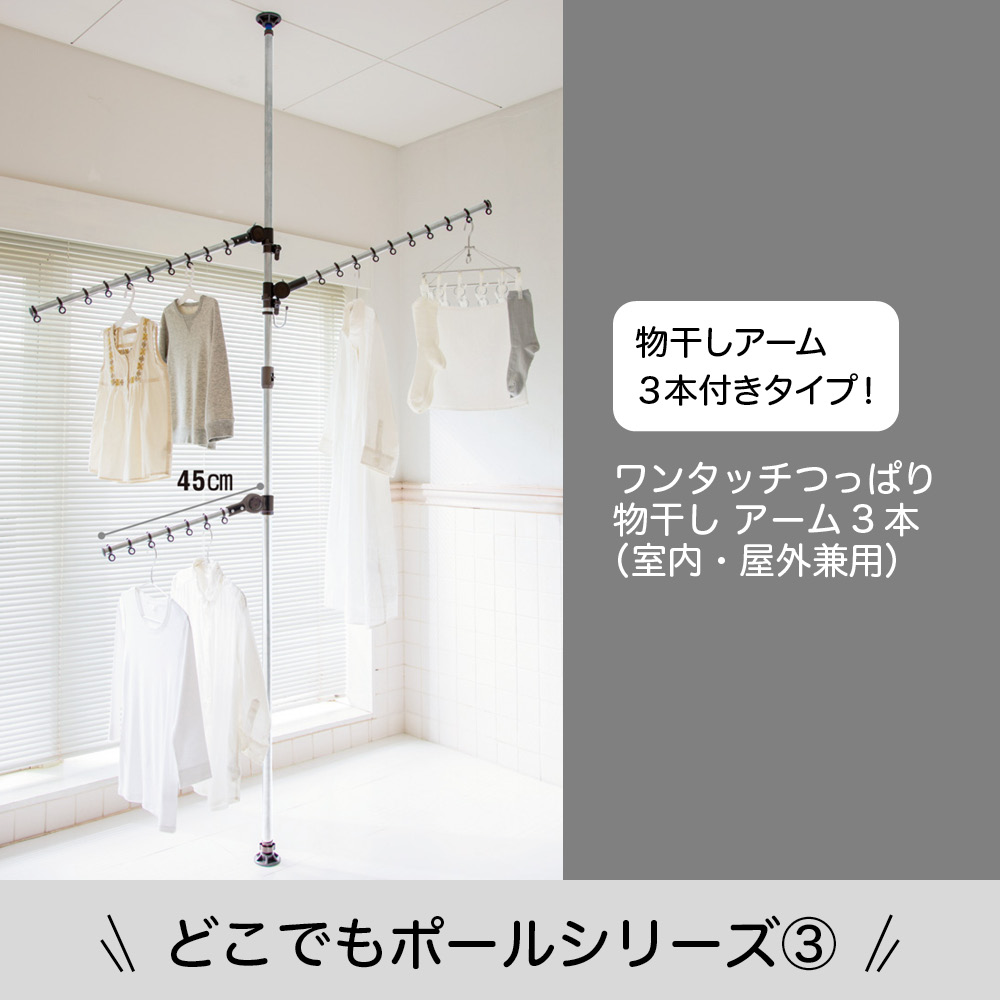 ポール一本でどこでも干せる!設置面積わずか直径8cmのワンタッチ式つっぱり物干し。ハンガーがより沢山干せる、アーム3本タイプが登場!つっぱりポールを1本立てるだけで、好きな場所が物干し場になる大ヒットシリーズ。●ハンガーがよりたくさんかけられるアーム3本タイプが新しく登場しました。●コートなどの一時掛けにも活躍。●アームの角度が上下12段階に140度、水平方向に360度回転、高さも調節が可能です!