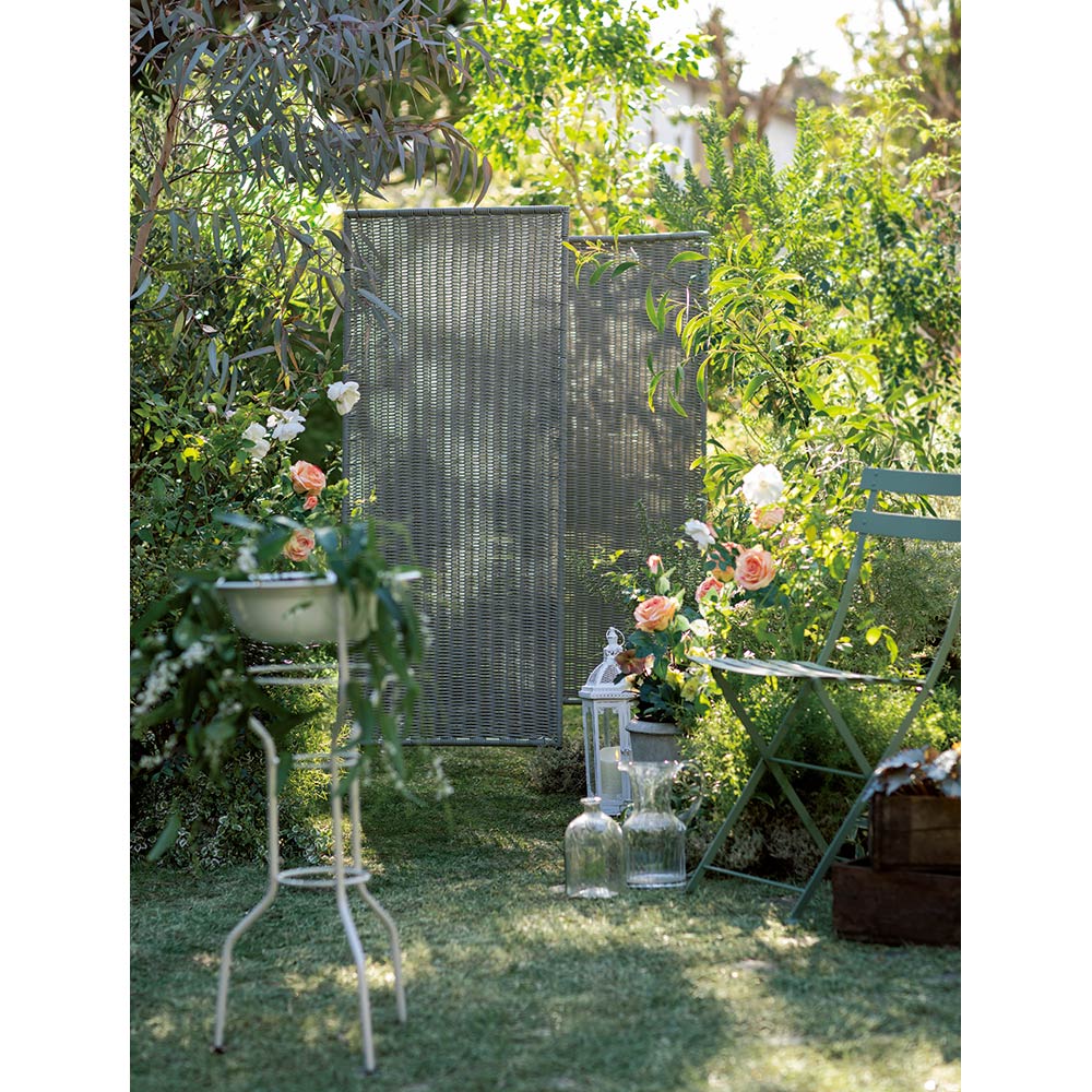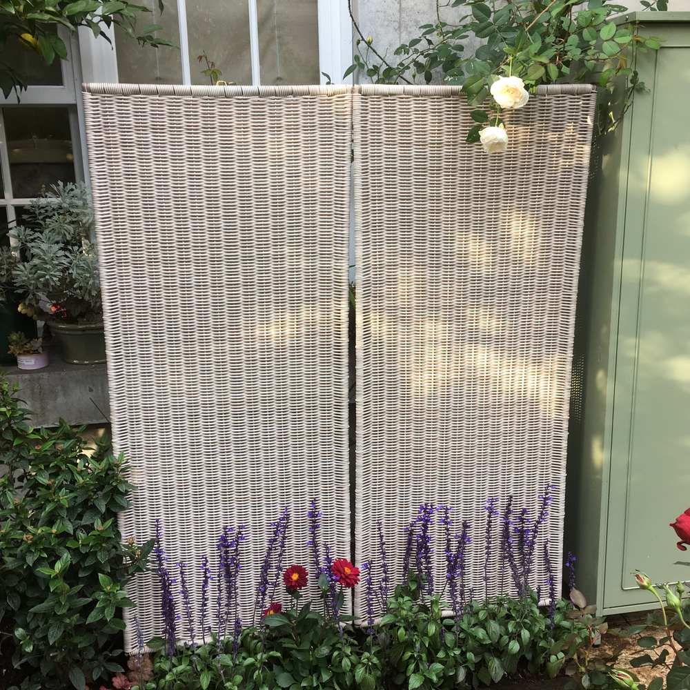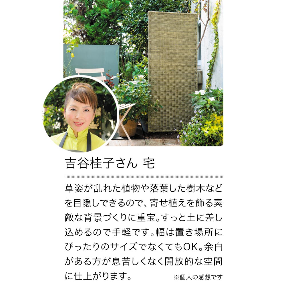 ※スチール製品は素材の特性上、経年変化でサビが発生致します。長くお使い頂くために、お届け直後の錆止め材の塗布をお薦めしております。 また、ご使用開始後も定期的なお手入れをお薦めします。(お手入れ方法&取り付け方法)【吉谷桂子先生おすすめ商品】本物のラタンのような自然な仕上がりが魅力。スペースの間仕切りや、背景の目隠しにも。植栽とのなじみが良いカラーバリエーションも人気。吉谷桂子さんおすすめ商品♪「まるで本物のラタンみたい。これほど自然に目隠しできるフェンスはありませんでした。ポリプロピレン製なので耐久性が高いのもいいですね。比較的風通しがよく、日除けにも活躍してくれそう。」お庭に大事な背景づくり。これがあれば一気に雰囲気が変わる!せっかくきれいに仕上げたお庭も、背景がいまいちだと台無しに…このフェンスを挿すだけで、見せたくない背景の目隠しが可能に!「窓を開け放して過ごしたいけれど、外から屋内が見えそう。あるいは、屋外の景色が良く無い。など。視線をそっと遮るのにも便利です。また、玄関から庭につながる場所で訪問者からの視線を遮るボロ隠しにも、目立つコンポストボックスなどの前にフェンスをつければ楽屋を隠すようにスマートにカバーできます。」フェイクラタンなので、お手入れラクラク!本物のラタンは、ささくれや腐りなど、お手入れが大変…。フェイクのラタンは、汚れても柔らかい布で乾拭きするだけ。簡単にお手入れできます。ラタンの風合いそのまま ナチュラル系ラタンの風合いを活かした自然なライトブラウン系ナチュラル色。「素材感はそのままに木やグリーンとマッチする色合いです。」優しい雰囲気が魅力のアイボリー系より草花を引き立たせる色味にこだわってセレクトしたカラーが登場。「自然な素材感はそのままに明るい色調へと雰囲気をブラッシュアップ、それまでの空間を、今まで以上に明るくスッキリと見せることができます。」と吉谷先生。モダンでおしゃれな雰囲気に!ブルージュ系植栽に馴染みの良いブルーかかったベージュの色合い、ブルージュ系カラー。吉谷先生曰く「外壁や植栽とのなじみの良い、自然な色が出したかった。ブルージュはどんな花も葉も際立つ色合いです。」色ムラをつけ、ラタンの自然な質感を表現しています。≪buyer’s voice≫イギリスで見た、おしゃれなラタンフェンスから発想を得ました!イギリスに行ったとき目にしたのは、とてもおしゃれに隣の家と間仕切りされたお庭たち。そのほとんどが、ウッドやラタンなど天然素材でできていて、とても雰囲気のあるようによく見えました。日本でも、きっとお庭で目隠ししたり間仕切りしたりしたい場所は多いはず…そんな思いから、開発しようと思っていたところ、吉谷さんにいろいろご意見を聞かせていただきました。イギリスで暮らされた経験をお持ちの吉谷さん、すぐに反応いただき、これは便利に違いない、とたくさんのアドバイスをいただきました。日本の気候に合うように風が通るようなつくりや、適度な厚さ・色みなどこだわって企画した商品です。ぜひ、手にとってみていただけたら!と思っています。