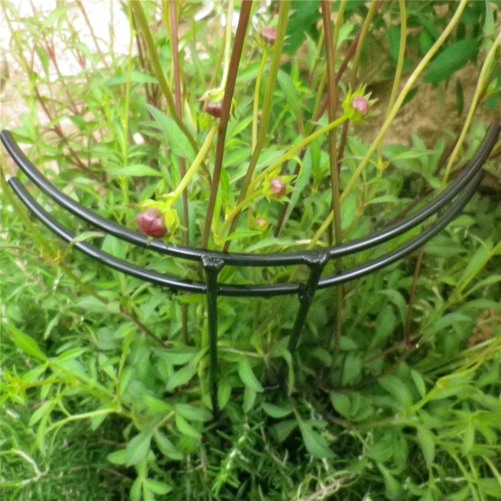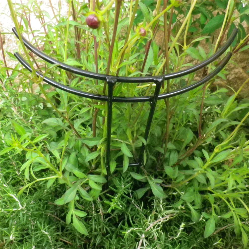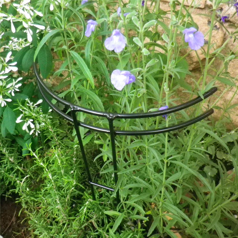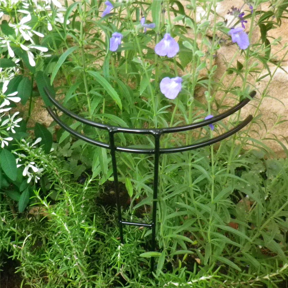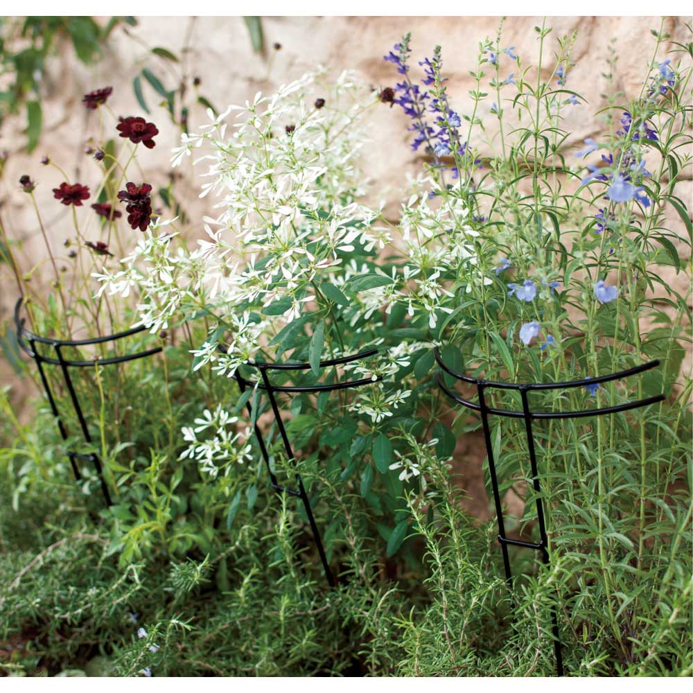 バラの苗を定植するときや、広がりがちな草花などに、倒れないようサッと土に差してサポート。半円形の上部で花をやさしく支えます。定植したてのバラや広がりがちな草花に、倒れないようにしっかりと苗を支えます。倒れやすい雨の時期にも活躍します!花の重さで茎が倒れてしまう・・・なんてことありますよね。プランターに差しても違和感のないデザインで丈夫なスチール製の支柱。花壇やプランターに差してお花のサポートに。シンプルなフォルムも◎。バラ苗の定植時にも役立ちます。