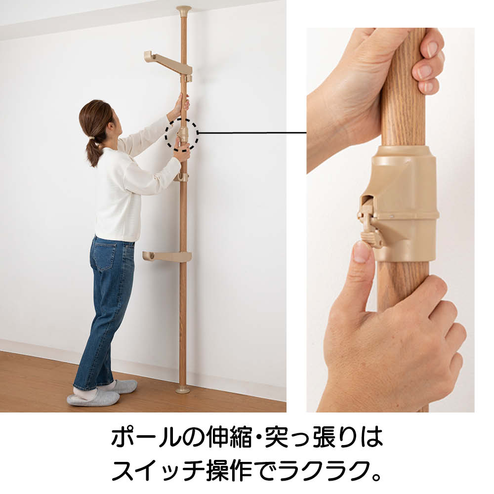 リビングになじむおしゃれな木目調。窓ぎわが物干しスペースに!日当たりのよい窓際に突っ張って設置。ナチュラルな木目調で、こだわりのインテリアにもなじみます。窓の幅に合わせてワイドに使えるので、シーツなどの大物もおまかせ!スイッチを押している間はポールが伸縮し、指を放すと止まる仕組み。最後にぐっと押し上げると、しっかり突っ張って固定されます。