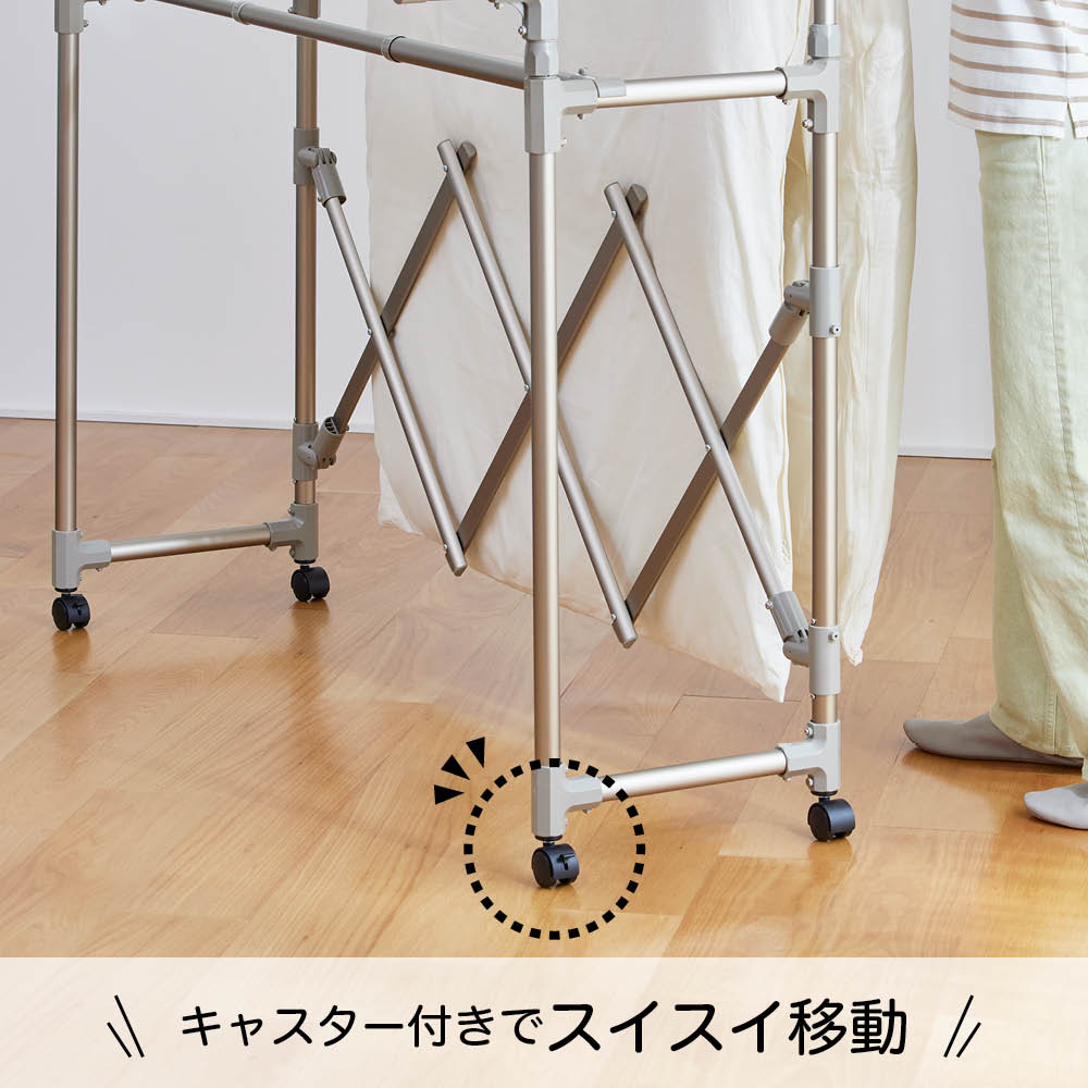 狭い場所でもコンパクトに干せて、キャスターで移動もラク。 (ア)シャンパンゴールド