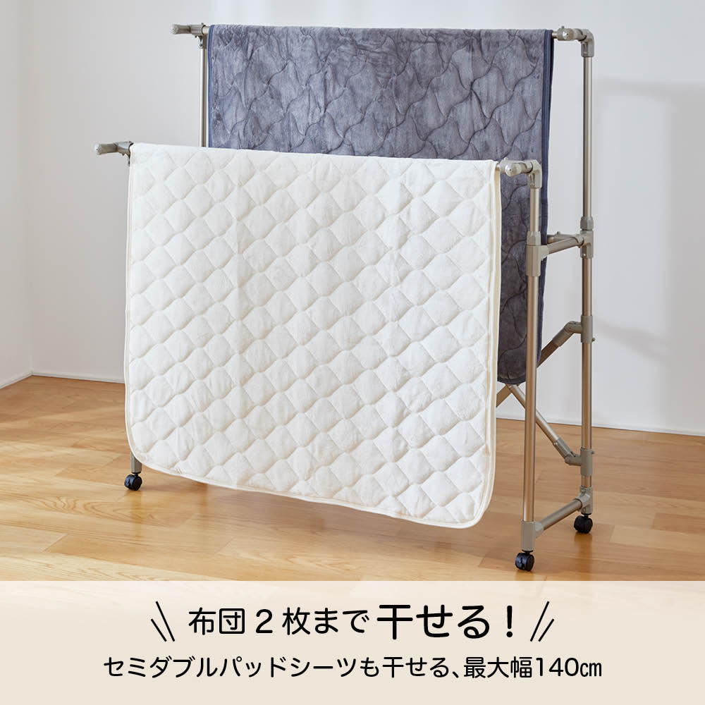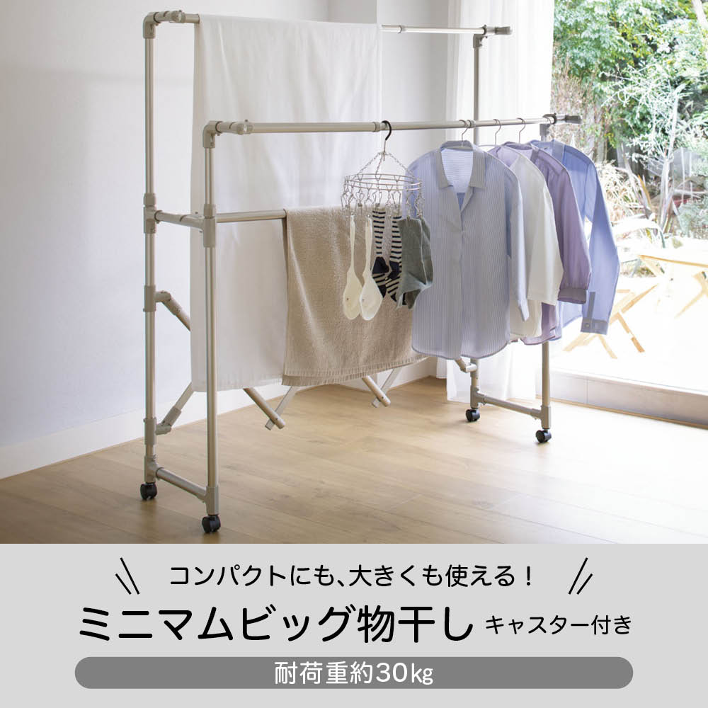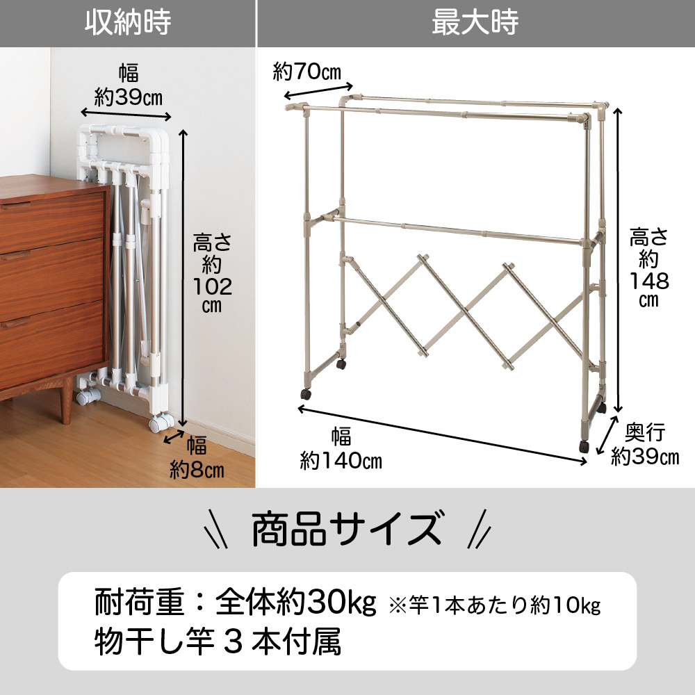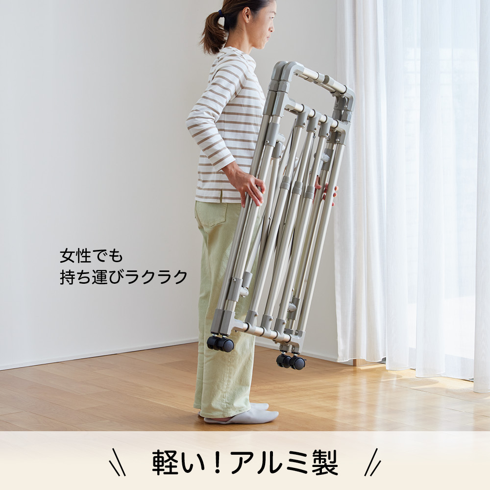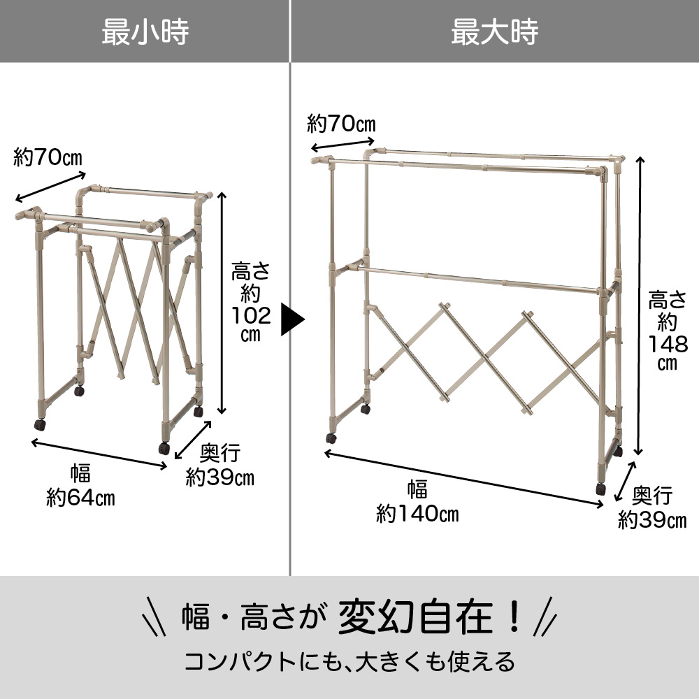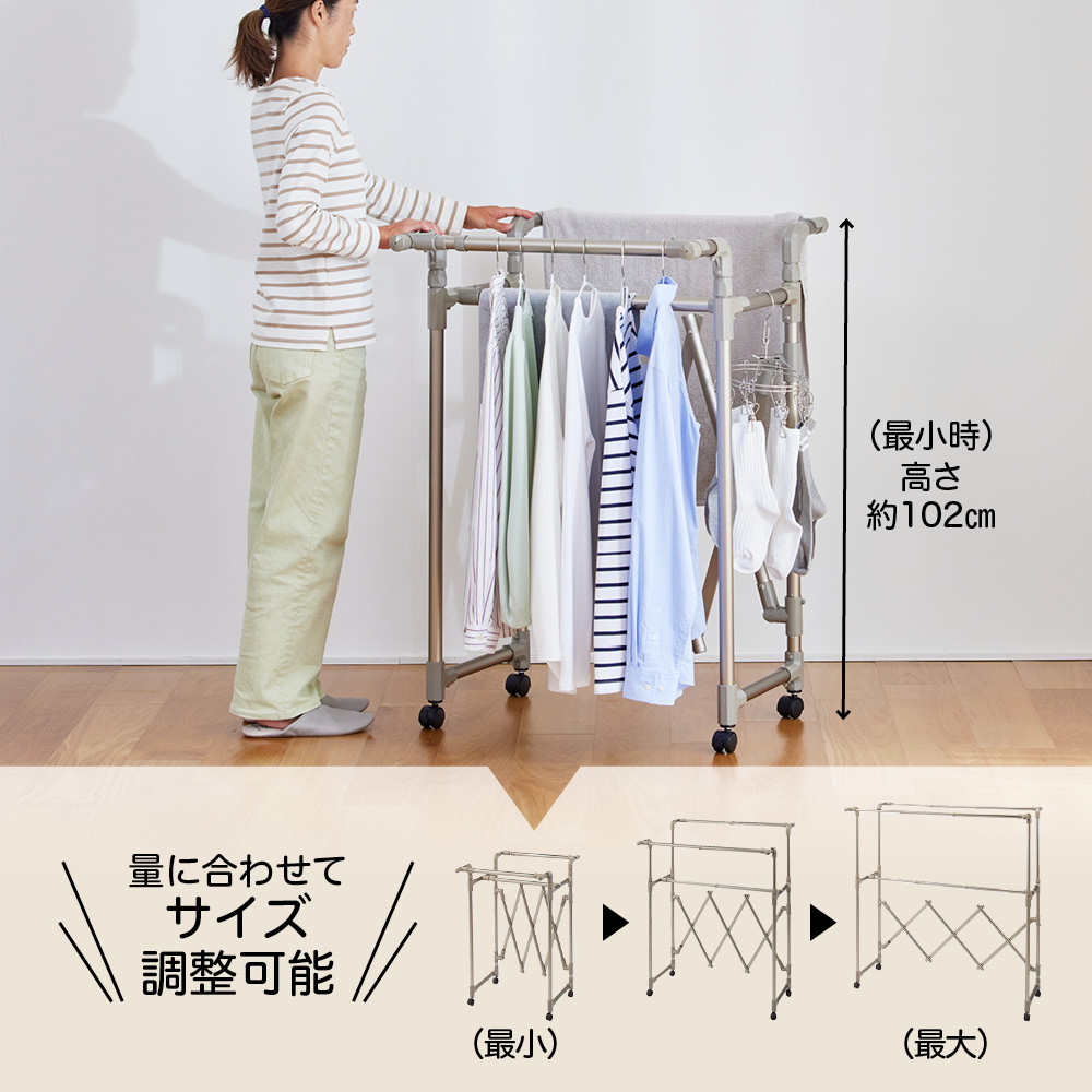 軽量で移動しやすいのに、優れた耐久性!アコーディオン式に伸縮ができるので、軽い力でいっきに組み立てでき、使わないときはコンパクト。幅と高さを調整して、洗濯物の量によって無駄なくスペースを活用できます。毎日変わる洗濯物の量に対応!洗濯物の量は、毎日同じとはかぎりません。出張や合宿帰りの家族がいる時は洗濯物が多くなったり、週末はシーツを干したい、タオルをまとめて天日干ししたい時も。雨や風の強い日は、部屋干ししたいけど、物干しが大きすぎるとちょっと邪魔になってしまう。だから、伸縮性のある物干しが、本当に便利なんです!実際、物干しに利便性なんて関係あるの?あるんです!物干しが変わるだけで、洗濯が快適にこなせるようになるんです。【快適ポイント1】洗濯物の量に合わせてサイズを調整幅も高さも自分の好きな大きさに無段階で調節することができるので、洗濯物の量によって物干しのサイズを変えられます(最大幅157cm)。最小サイズにすれば、浴室での使用が可能。また、ベランダや庭につながる窓から、洗濯物をかけたまま屋内に取り込むこともできます。これなら、急な天候不良の際にもすぐに対応できて安心!ワイドサイズは、最大に伸ばせばシーツを2枚広げて干せるサイズになるので、週末のまとめ洗いにも対応できます。家族全員分の洗濯物のいっき干しも十分出来るサイズです。★前後それぞれで高さを調節できるから、風通し良く干せます。★たためば薄さはわずか約8cm!使用しない際は、竿を本体に止めて簡単に収納できます。部屋の中で竿がバラバラになることもなく、一ヶ所にまとめて収納しておけます。【快適ポイント2】様々な仕様で外干し・中干しにも!キャスターなし、キャスター付き、ブローベース付きの3タイプで、生活スタイルに合わせて使用できます。本体は軽くて移動もラクチン。庭やベランダから、中へ取り込むのも簡単です。★キャスターなしは屋内外兼用で。天候によって干す場所を変えることができます。★キャスターありは屋内用として。洗濯機の近くで洗濯物をかけて、窓の近くまで移動させて干せるのが便利。お部屋を掃除する時にも邪魔になりにくく、便利です。★ブローベース付きはしっかりと安定して、強風にも耐えるから、べランドなどでも安心して外干しすることができます。【快適ポイント3】気持ちを上げる2色展開物干しにめずらしいおしゃれなシャンパンゴールドと、清潔感のあるシルバーの2色展開!シンプルかつキレイな配色で、見た目もうれしい物干しなら、洗濯が苦になりません。部屋干し用に室内に置いておく際にもお部屋の雰囲気を損ねません。