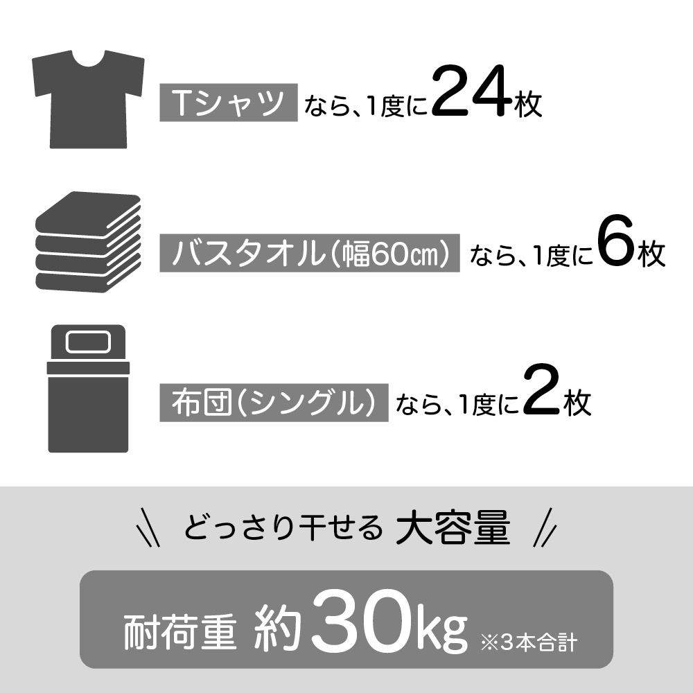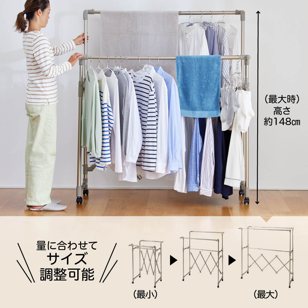 幅と高さを調整して、洗濯物の量によって無駄なくスペースを活用!