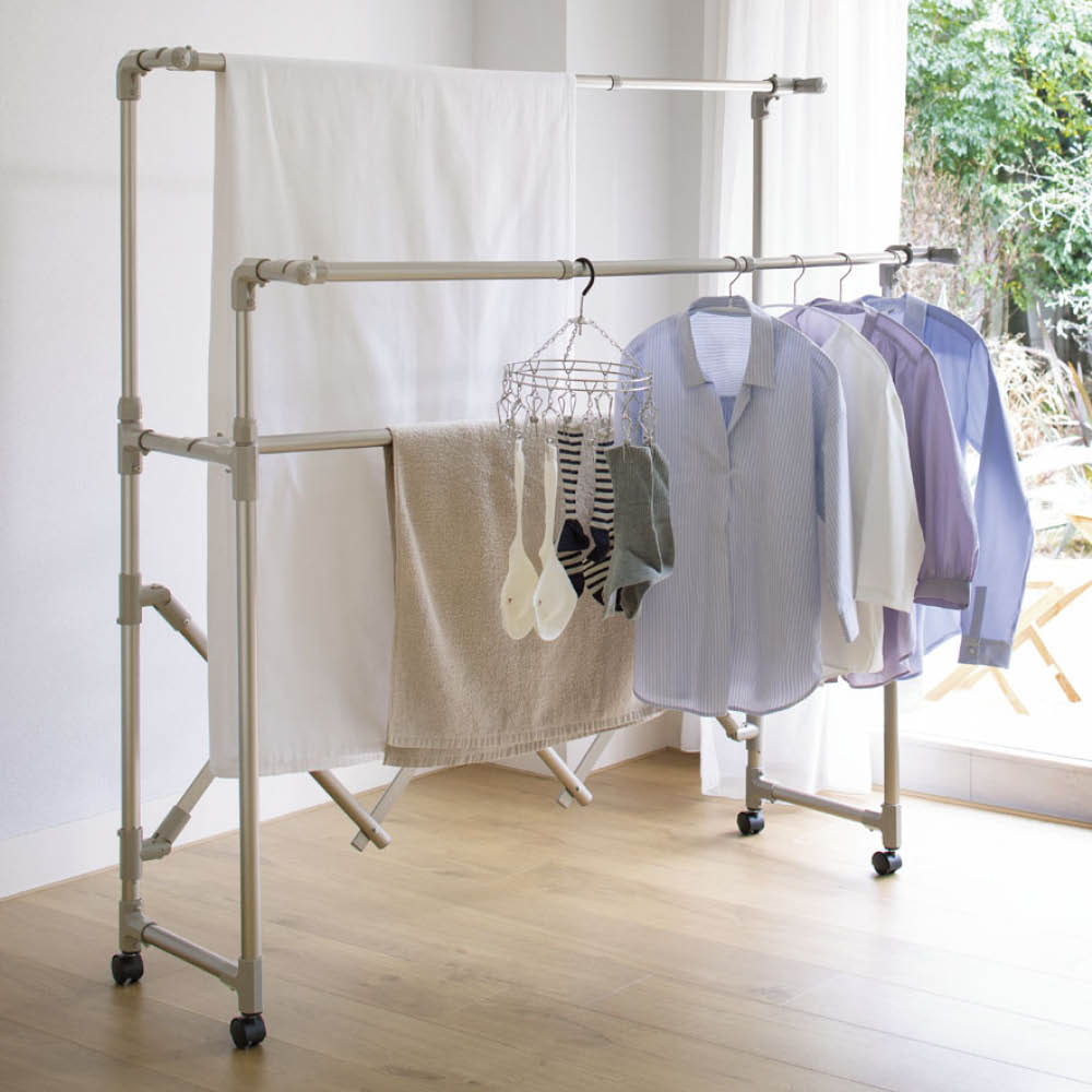 軽量で移動しやすいのに、優れた耐久性!アコーディオン式に伸縮ができるので、軽い力でいっきに組み立てでき、使わないときはコンパクト。幅と高さを調整して、洗濯物の量によって無駄なくスペースを活用できます。毎日変わる洗濯物の量に対応!洗濯物の量は、毎日同じとはかぎりません。出張や合宿帰りの家族がいる時は洗濯物が多くなったり、週末はシーツを干したい、タオルをまとめて天日干ししたい時も。雨や風の強い日は、部屋干ししたいけど、物干しが大きすぎるとちょっと邪魔になってしまう。だから、伸縮性のある物干しが、本当に便利なんです!実際、物干しに利便性なんて関係あるの?あるんです!物干しが変わるだけで、洗濯が快適にこなせるようになるんです。【快適ポイント1】洗濯物の量に合わせてサイズを調整幅も高さも自分の好きな大きさに無段階で調節することができるので、洗濯物の量によって物干しのサイズを変えられます(最大幅157cm)。最小サイズにすれば、浴室での使用が可能。また、ベランダや庭につながる窓から、洗濯物をかけたまま屋内に取り込むこともできます。これなら、急な天候不良の際にもすぐに対応できて安心!ワイドサイズは、最大に伸ばせばシーツを2枚広げて干せるサイズになるので、週末のまとめ洗いにも対応できます。家族全員分の洗濯物のいっき干しも十分出来るサイズです。★前後それぞれで高さを調節できるから、風通し良く干せます。★たためば薄さはわずか約8cm!使用しない際は、竿を本体に止めて簡単に収納できます。部屋の中で竿がバラバラになることもなく、一ヶ所にまとめて収納しておけます。【快適ポイント2】様々な仕様で外干し・中干しにも!キャスターなし、キャスター付き、ブローベース付きの3タイプで、生活スタイルに合わせて使用できます。本体は軽くて移動もラクチン。庭やベランダから、中へ取り込むのも簡単です。★キャスターなしは屋内外兼用で。天候によって干す場所を変えることができます。★キャスターありは屋内用として。洗濯機の近くで洗濯物をかけて、窓の近くまで移動させて干せるのが便利。お部屋を掃除する時にも邪魔になりにくく、便利です。★ブローベース付きはしっかりと安定して、強風にも耐えるから、べランドなどでも安心して外干しすることができます。【快適ポイント3】気持ちを上げる2色展開物干しにめずらしいおしゃれなシャンパンゴールドと、清潔感のあるシルバーの2色展開!シンプルかつキレイな配色で、見た目もうれしい物干しなら、洗濯が苦になりません。部屋干し用に室内に置いておく際にもお部屋の雰囲気を損ねません。