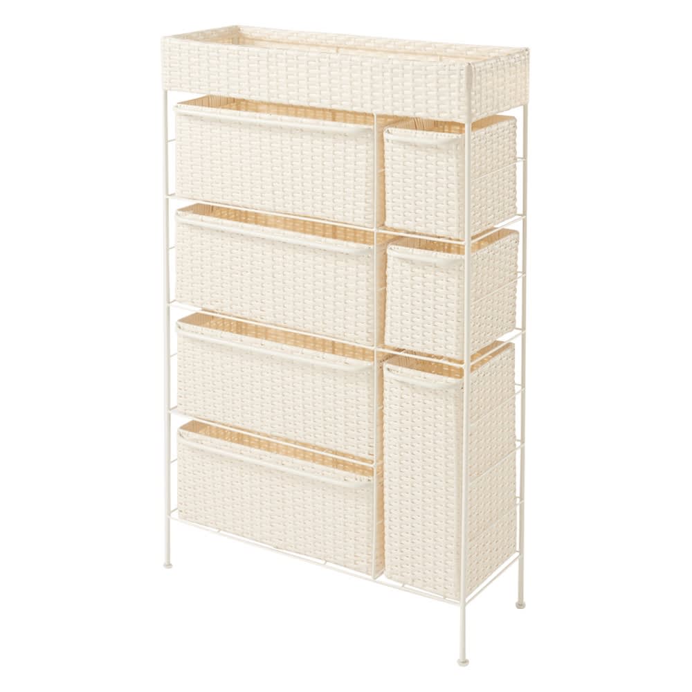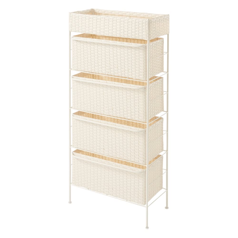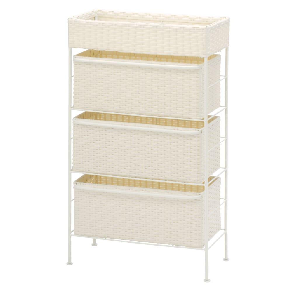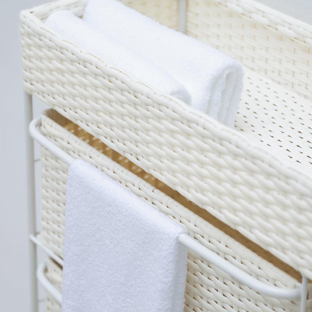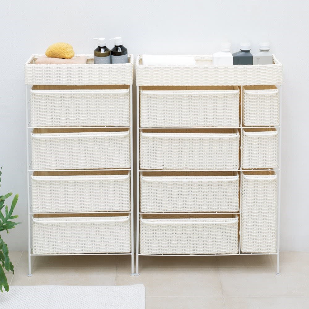 奥行たったの24cm!まるでラタンを編んだような仕上がりの、ポリプロピレン製のチェスト。衣類やタオルが引っかかる心配がなく、湿気の気になる洗面書や脱衣所でも安心して清潔に使えます。コンパクトながら収納量はたっぷり。バスまわりがすっきり片づくラタン調チェストラタン風のナチュラルな見た目で、バスルームからリビングまで、どんなインテリアにも違和感なく溶け込み、空間をおしゃれに演出。奥行きが浅いので狭い洗面所でも圧迫感なく置け、着替えやタオル、シャンプー類のストックなどを収納できます。よりお求めやすい価格になりました!通気性がよく、水に強いポリプロピレン製ポリプロピレン製の樹脂を丁寧に編み上げて、ナチュラルな風合いに。水がはねてもサッと拭くだけでお手入れ簡単。湿気の多い洗面所や脱衣所周りでも清潔に使えます。アイアン製のハンドルは、タオル掛けにもナチュラルな風合いながら、アイアン製のハンドルですっきりとした印象に。タオル掛けとしても使用できます。編み上げられたバスケット部分は通気性が良く、収納物が湿気に悩まされません。いつでも清潔でナチュラルな風合いを保ちます。深引き出しは高さのあるボトルも収納可能ワイド3段・ワイド4段の下部にある引き出しは、約36.5cmの高さのボトルまで収納できます。3段と4段、2つの幅から選べる豊富なバリエーション置き場所や収納したいものに合わせて、ぴったりのチェストを選べます。奥行きわずか26cmのスリムなデザイン狭い脱衣所でも圧迫感なく、快適な収納スペースとして活躍します。上部のオープンスペースにも収納可能上部のオープンスペースには、高さのあるボトルやアイテムがしっかり収納できます。いつも使うアイテムを置いておけば、サッと取れて便利。床から約10cmのオープンスペースは体重計や小物の収納にぴったり。限られたスペースを最大限に活用できます。