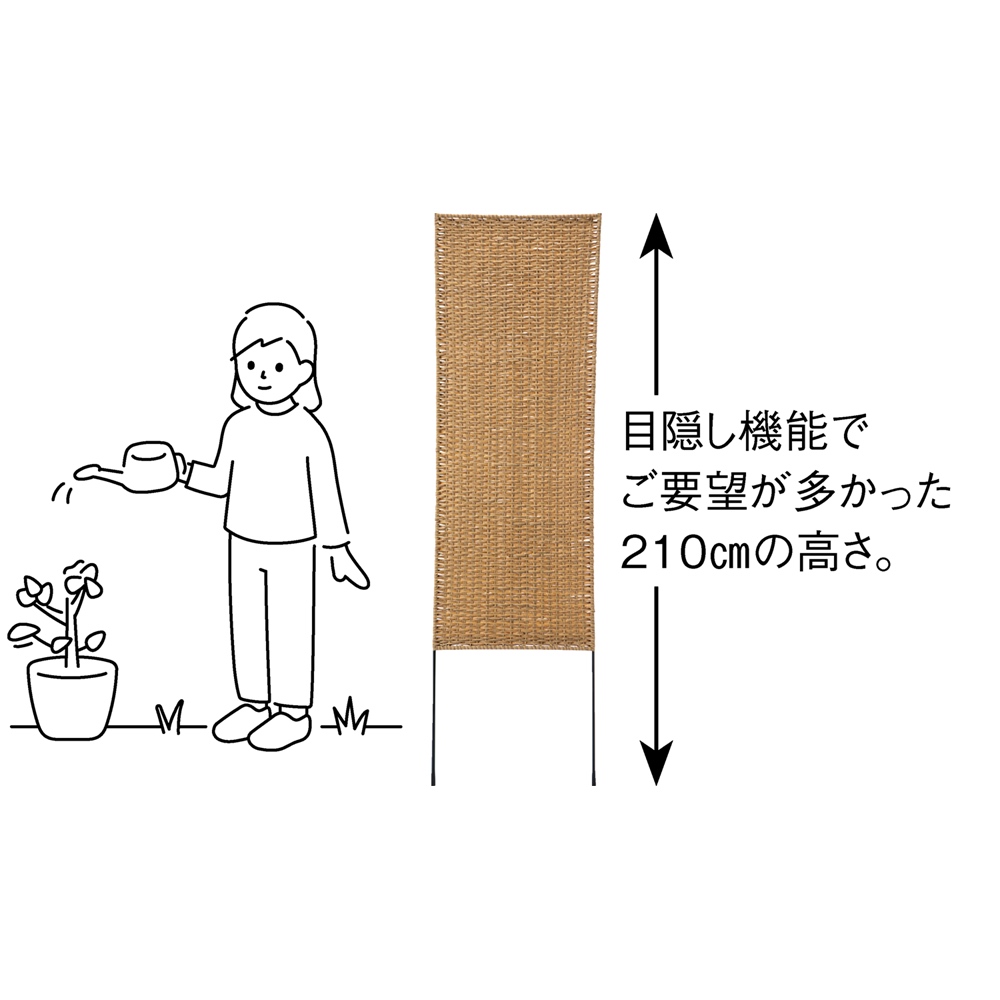 ※スチール製品は素材の特性上、経年変化でサビが発生致します。長くお使い頂くために、お届け直後の錆止め材の塗布をお薦めしております。 また、ご使用開始後も定期的なお手入れをお薦めします。(お手入れ方法&取り付け方法)庭になじむナチュラルな見た目の屋外用目隠しフェンス。丈夫で長持ちな樹脂製・挿し込むだけの簡単設置。天然籐風のナチュラルで合わせやすいデザインで、塀のように玄関前や庭周りに廻らせてお洒落に目隠しを。◆地中に挿し込んでも人の目線の高さをカバーできる210cm。◆目隠しフェンスとして頼もしい高さ◆地中挿し込み高さを計算し企画したディノスオリジナル商品!◆よりプライベートな空間を、挿し込むだけで簡単に演出。◆境界作りにオシャレと機能性をプラス!◆水や汚れに強く、朽ちにくい樹脂製の人工ラタンでお手入れも楽々◆天然籐の素材を再現したポリプロピレン樹脂製で耐候性も安心。◆自然環境の影響を受けやすい屋外用フェンスだからこその特長◆雨水や飛び散った泥汚れも簡単お手入れ◆思い通りに扱える頼もしく、お洒落なガーデンエクステリア。
