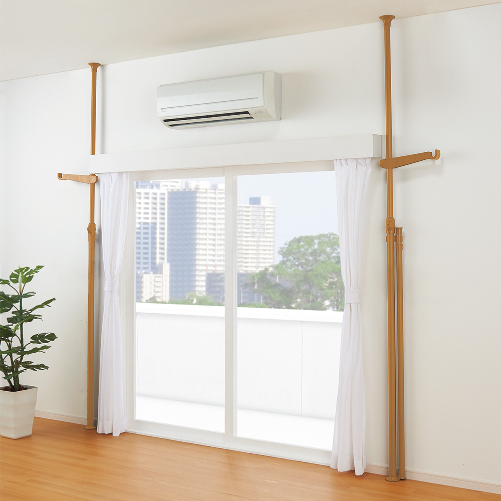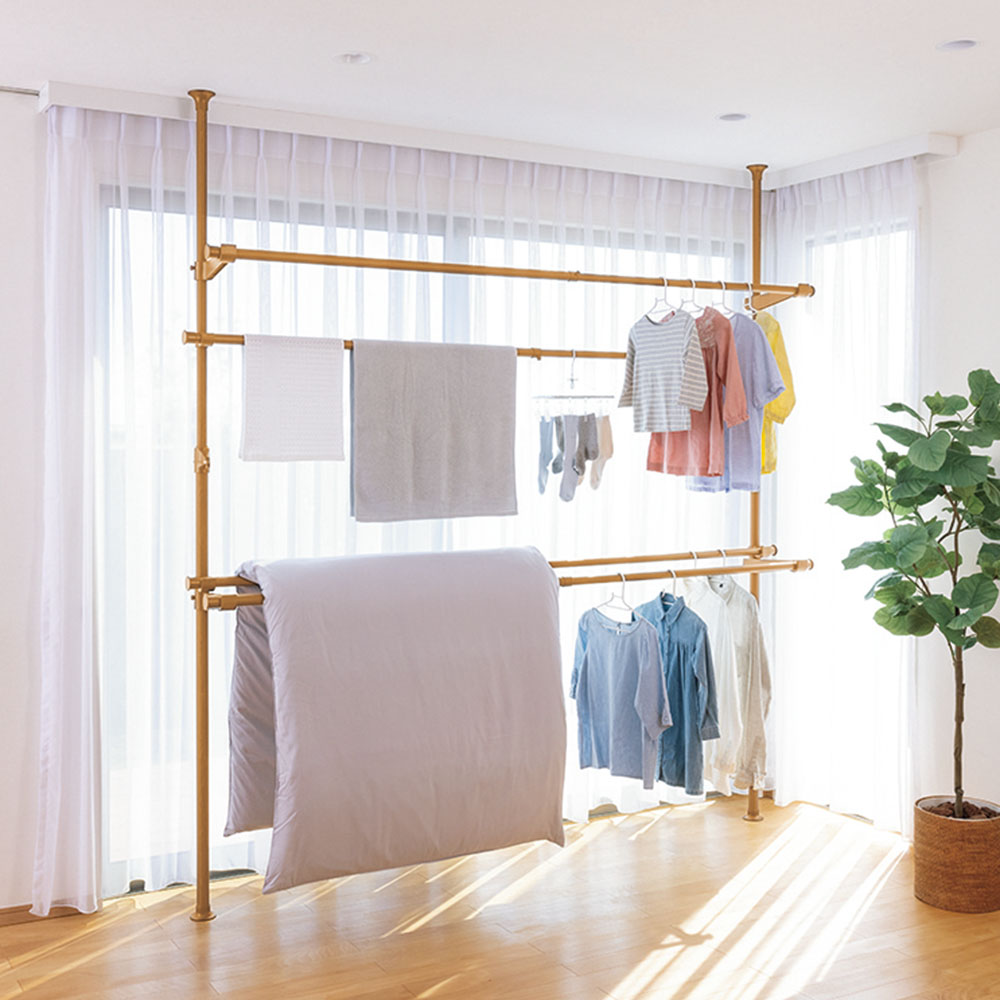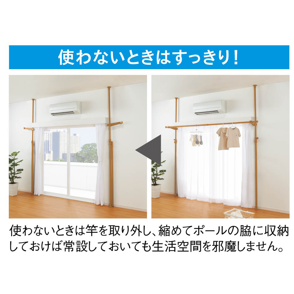 プラス1で洗濯効率UP 日当たりのよい窓際を効率よく活用。急な雨も安心。スイッチを押している間はポールが伸縮し、指を放すと止まる仕組み。最後にぐっと押し上げると、しっかり突っ張って固定されます。