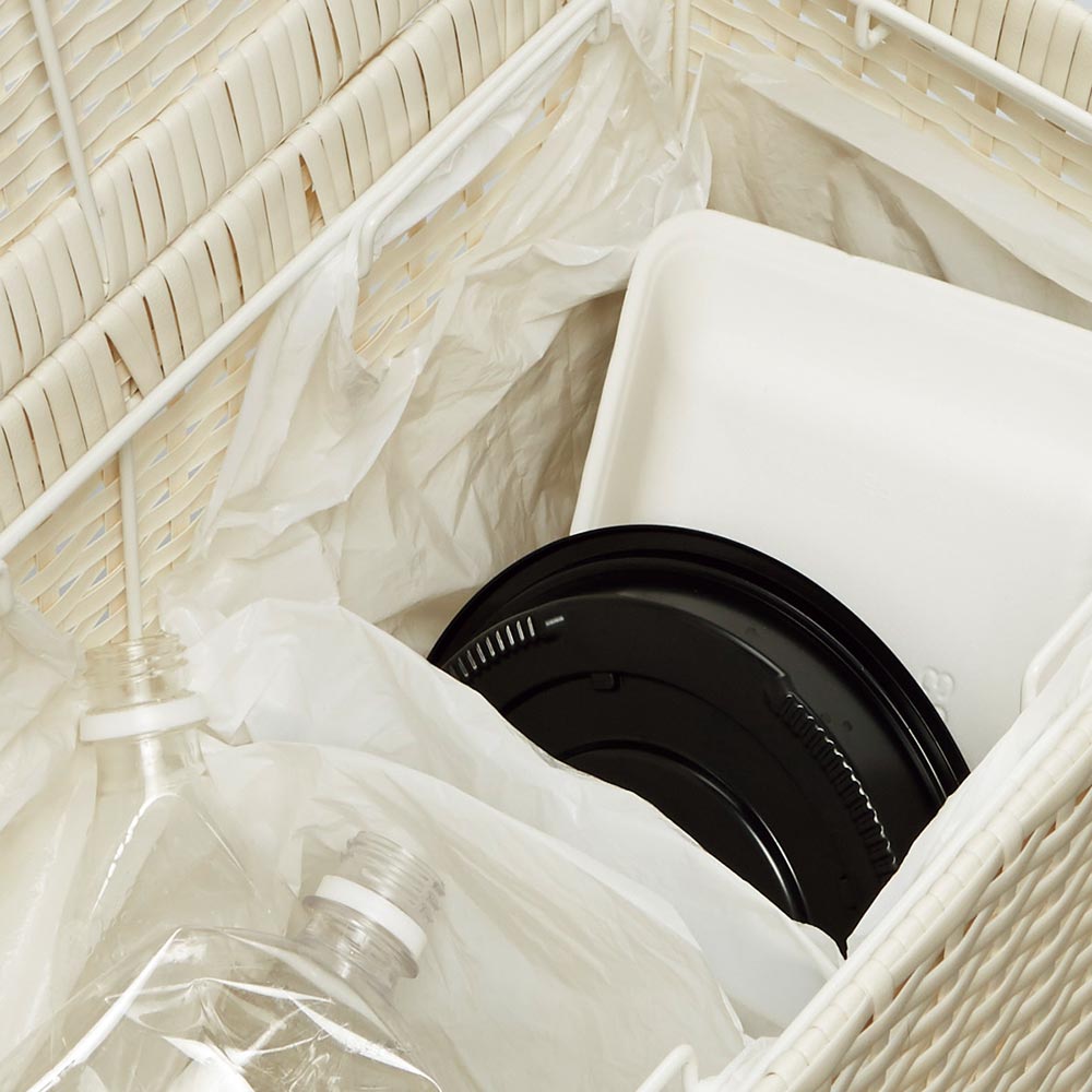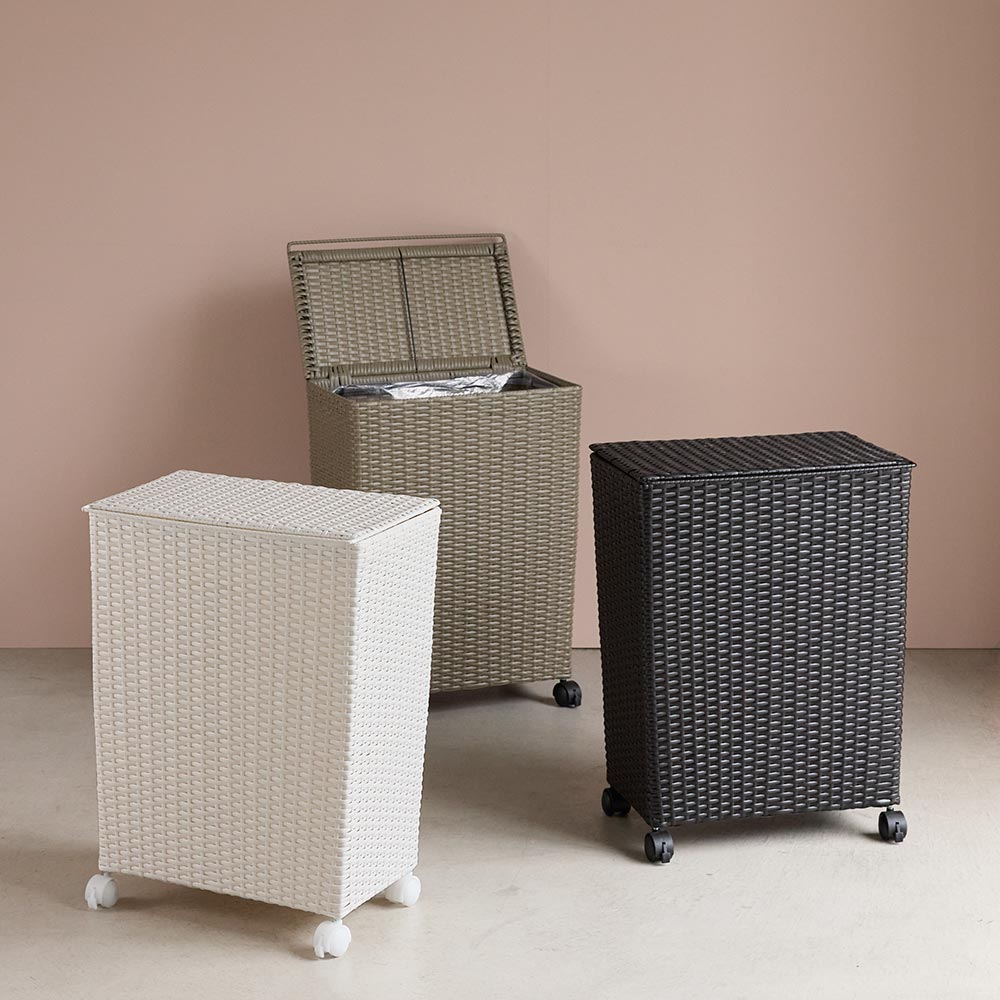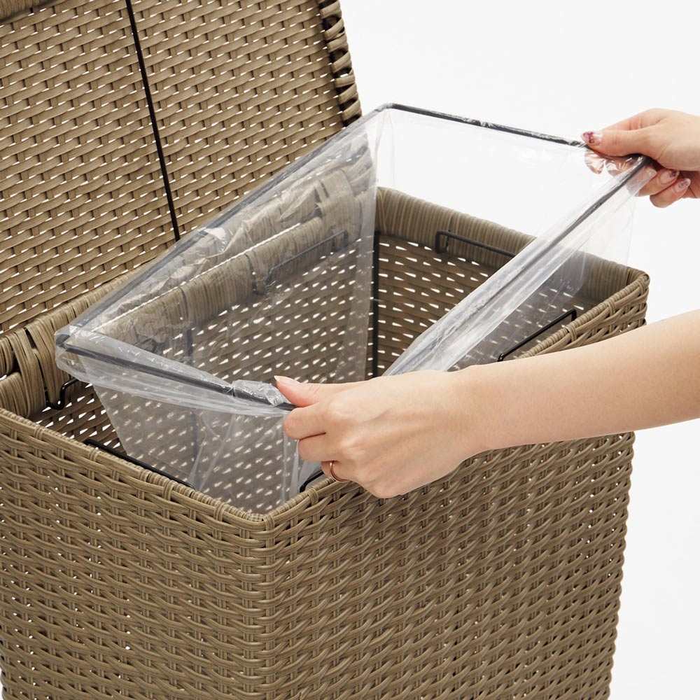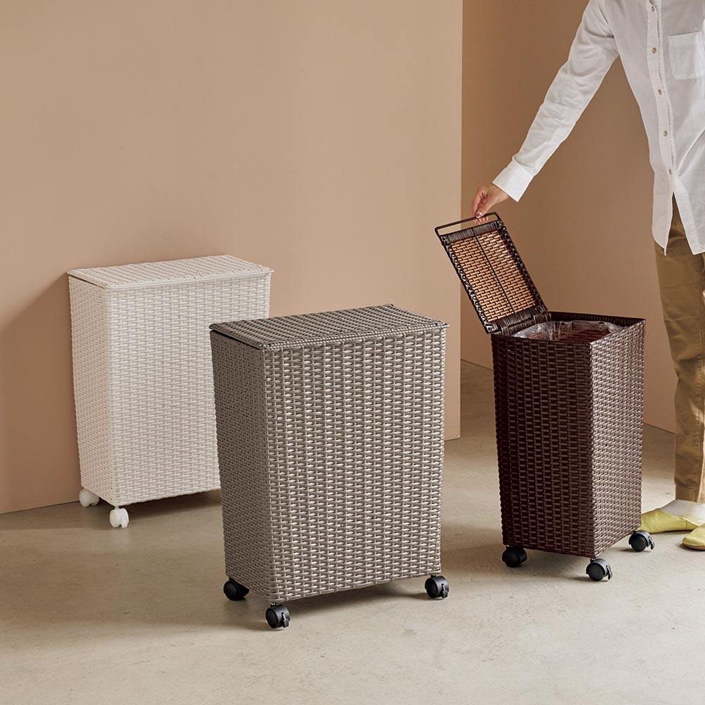 お洒落なラタン風樹脂素材が生活感を排除します。かさばるビン・缶・ペットボトルは、一見ゴミ箱とは思えないおしゃれなラタン調ボックスに。バスケットのような素材なので通気性がよく水や汚れにも強く、フタを閉めれば見た目すっきり。内側のワイヤーに袋を掛ければ中が汚れる心配もなく、ゴミ捨ても楽々です。キャスター付きで移動も簡単です。