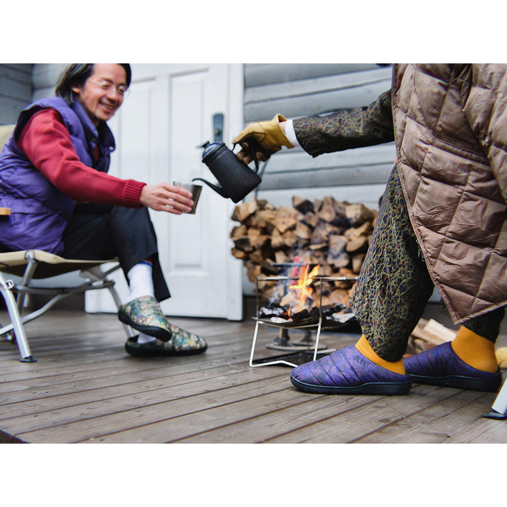 冬にサンダルを履く。「ちょっとそこまで出たいとき、サンダルでは寒い…。」今までにない新しい秋冬のサンダルです。キャンプシーンなどにもぴったりの難燃性CORDURA®305D素材を表地に使っています。冬にサンダルを履く。「ちょっとそこまで出たいとき、サンダルでは寒い…。」今までにない新しい秋冬のサンダルです。●寒い冬、ふと出掛けるときにも素足で履けるSUBU。●ダウンのような暖かさと、起毛加工の内側の生地と4層構造のインソールが足全体にフィットし、優しい履き心地を創り出します。●ソールはスニーカーのようにしっかりしたすべり止めになっています。4層のクッション性のあるソールなので、外を歩くのにぴったり。●アッパーはダウンジャケットのような見た目でSUBUのロゴ入り。難燃性CORDURA®305D素材を表地に使った、キャンプシーンに最適な一足。●内側は起毛素材を使用しており、暖かく履き心地抜群です。素足で履くのはもちろん、ファッショナブルな色使いのSUBUとお気に入りの靴下とのコーディネイトを楽しんで。●同じカラーの収納袋がついてきますので、旅行やキャンプなどいろいろなところにもっていけます。■SUBUコンセプト・日々の暮らしに、発見と驚きを。靴を脱いで、素足になる。それは、あなたをリラックスさせ、あなたに自由を与えてくれます。そしてまた、自由になった時にこそ初めて、「好きなモノ」や「新しいコト」に対して、まっすぐと純粋に向き合えるのではないでしょうか。好きなモノを手に入れる。新しいコトに挑戦する。きっとそれは、発見と驚きに溢れ、日々の暮らしを豊かにしてくれるはずです。・好きなモノ、新しいコトへ、一歩ずつ。SUBUは、そんな小さな「一歩」を踏み出す生活者に愛されつづけるブランドでありたいと思います。「好きなモノ」や「新しいコト」は人それぞれで、それこそ自由です。好きなモノを形にし、新しいコトに挑戦しつづけ、そのプロセスや時間を共有する。私たちは、その一つ一つを応援したいと思います。・さぁ、あなたらしく一歩をこのサンダルとともに。誰も知らない冬のサンダル。それはまさに、私たちにとって「好きなモノ」であり、「新しいコト」への挑戦でした。今後も、このサンダルを通じて、たくさんの人と出会い、たくさんの人が自由に、純粋に、一歩を踏み出せるようにお手伝い出来ればと思っています。