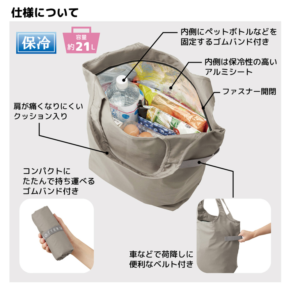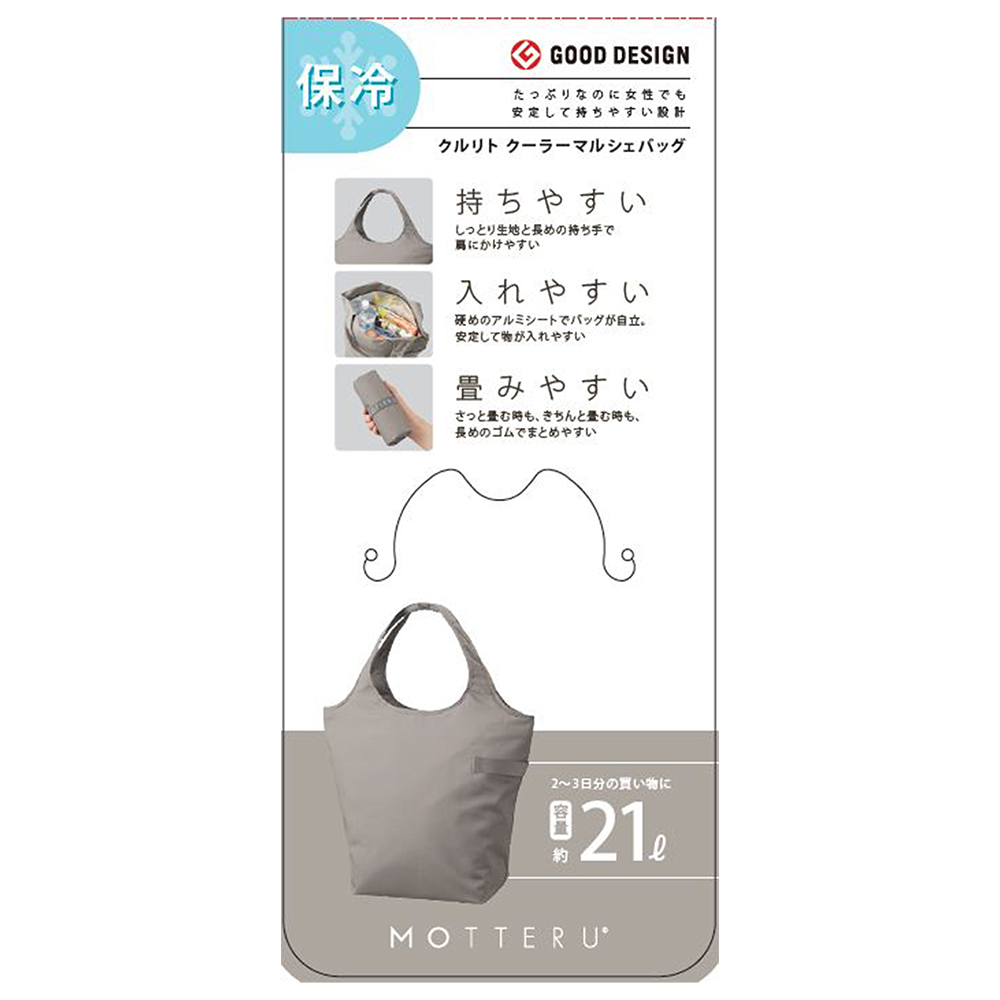 保冷機能付きなのにコンパクトに折りたためる理想的なバッグ。ペットボトルなどを立てたまま収納できるゴムバンドや、重くなった荷物の移動が簡単なサイドに付いたハンドルなど、使いやすさも抜群!・ついつい買いすぎても大丈夫!ハンドル付きで持ち運びもラクラクな保冷バッグ。・バッグにゴムがついており、未使用時は折りたたんでコンパクトに持ち運ぶことができます。ゴムはバッグに縫い込まれていますので、なくすこともありません。・内側のアルミがしっかりしているので、物を入れるときも自立して入れやすく、2Lペットボトルや牛乳パックが固定できるゴムバンドが付いております。・ 口元はファスナー仕様となっているので、中身が飛び出る心配がありません。・外側についているベルトは車からの荷降ろしや少し手を開けたい時に、傘等を引っ掛けることが出来ます。・持ち手はクッション入りで肩が痛くなりにくい。・生鮮、精肉が入ったトレーも横置きできるしっかり広いマチ仕様です。・普段のスーパーなどでのお買い物にぴったりな使える保冷バッグです。 ●クルリトシリーズのこだわり クルクルと簡単にたためてコンパクトに持ち運べるのがCururito(クルリト)シリーズの最大の特長です。質感や持った時の手の感触にこだわった高密度ポリエステルは使っていてもシワになりにくい素材で、手に持ったとき、肩にかけたときに負担になりません。●MOTTERUとは使い続けることでエコにつながる、持っていることで意識が高まる、環境に配慮し、生活を豊かにする、それがMOTTERU というブランドです。