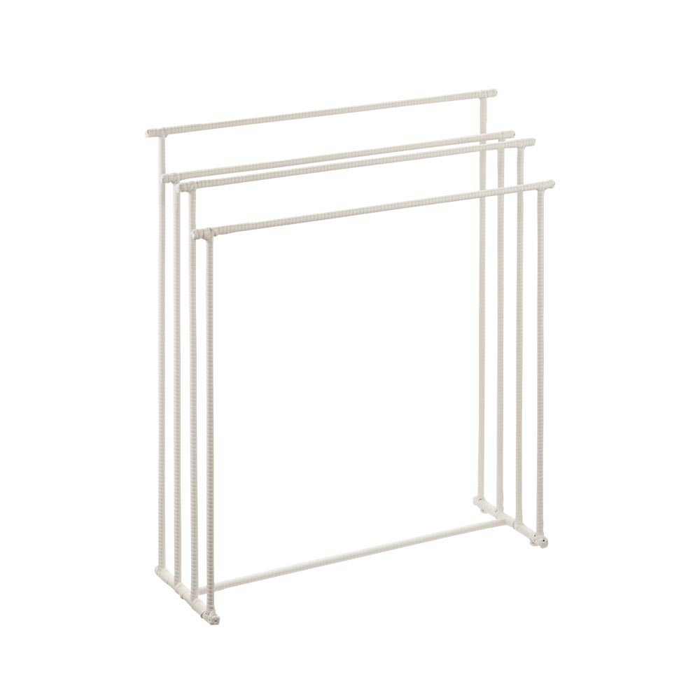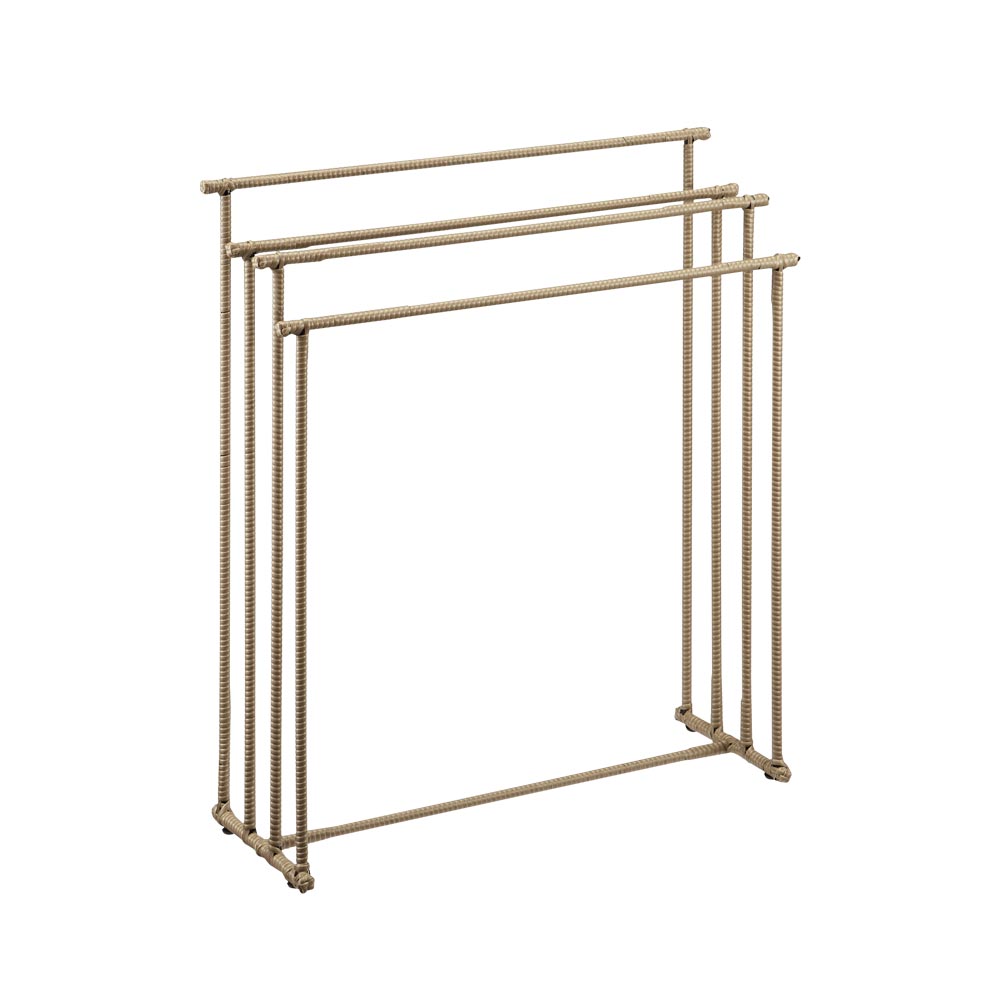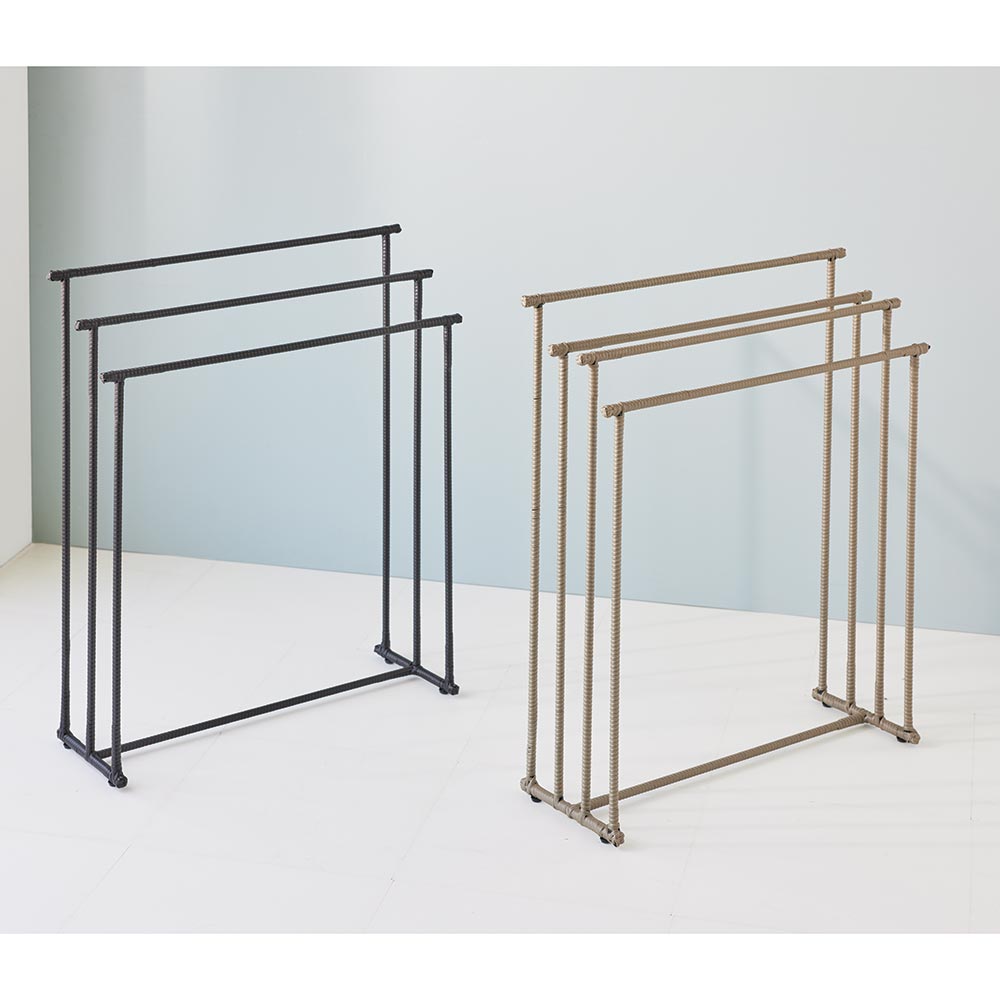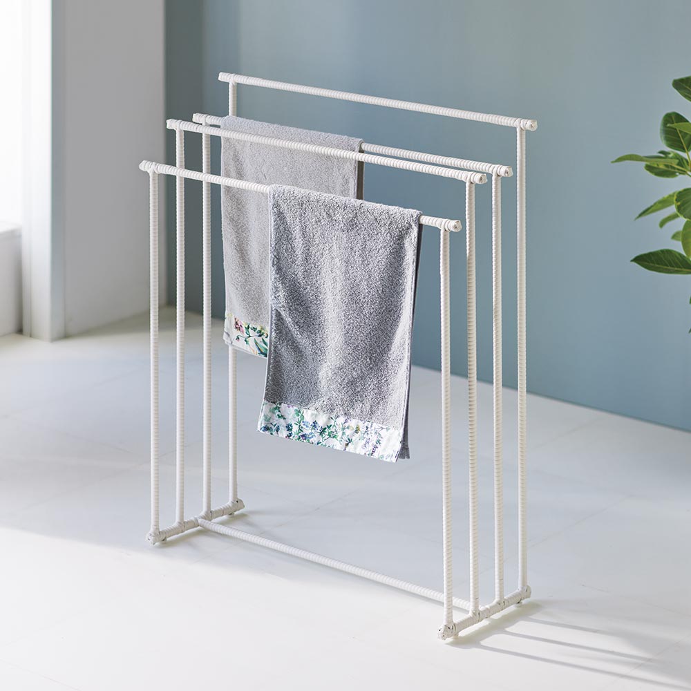 水濡れに強くおしゃれで人気のラタン調からバスタオルハンガーが登場。やや幅広のバーは海外製バスタオルも掛けられるサイズ。軽くても安定感があり、扱いやすく掃除の時も嬉しい。水濡れに強くおしゃれで人気のラタン調からバスタオルハンガーが登場!■水に強く通気性の良い、ラタン調の樹脂素材本体は樹脂素材なので水や汚れに強く、湿った洋服でも安心です。通気性が良く、臭いや湿気もこもりにくく、汚れた洗濯物もOK。汚れが気になる場合は、水拭きで簡単にお手入れできます。■やや幅広のバー設計で海外製バスタオルも掛けられますタオルバーの広さにもこだわった設計で、少し幅の広い海外製バスタオルも掛けられるサイズ。軽くて扱いやすいラタン調なので、コンパクトながら移動も楽々です。■おしゃれなラタン調シリーズでランドリータイムを快適に生活感の出るバスタオル掛けは、ラタン調シリーズで洗濯前のタオルを存分にかけて。シリーズでお使いいただけば、洗面所の空間に統一感をもたらせます。■インテリアに合わせて3色からホワイトは清潔感があり、明るい印象に。ブラウンは本物のラタンのように立体感のあるおしゃれな色味。ダークブラウンはシックで高級感を演出。インテリアにもなじみゃすいカラーです。