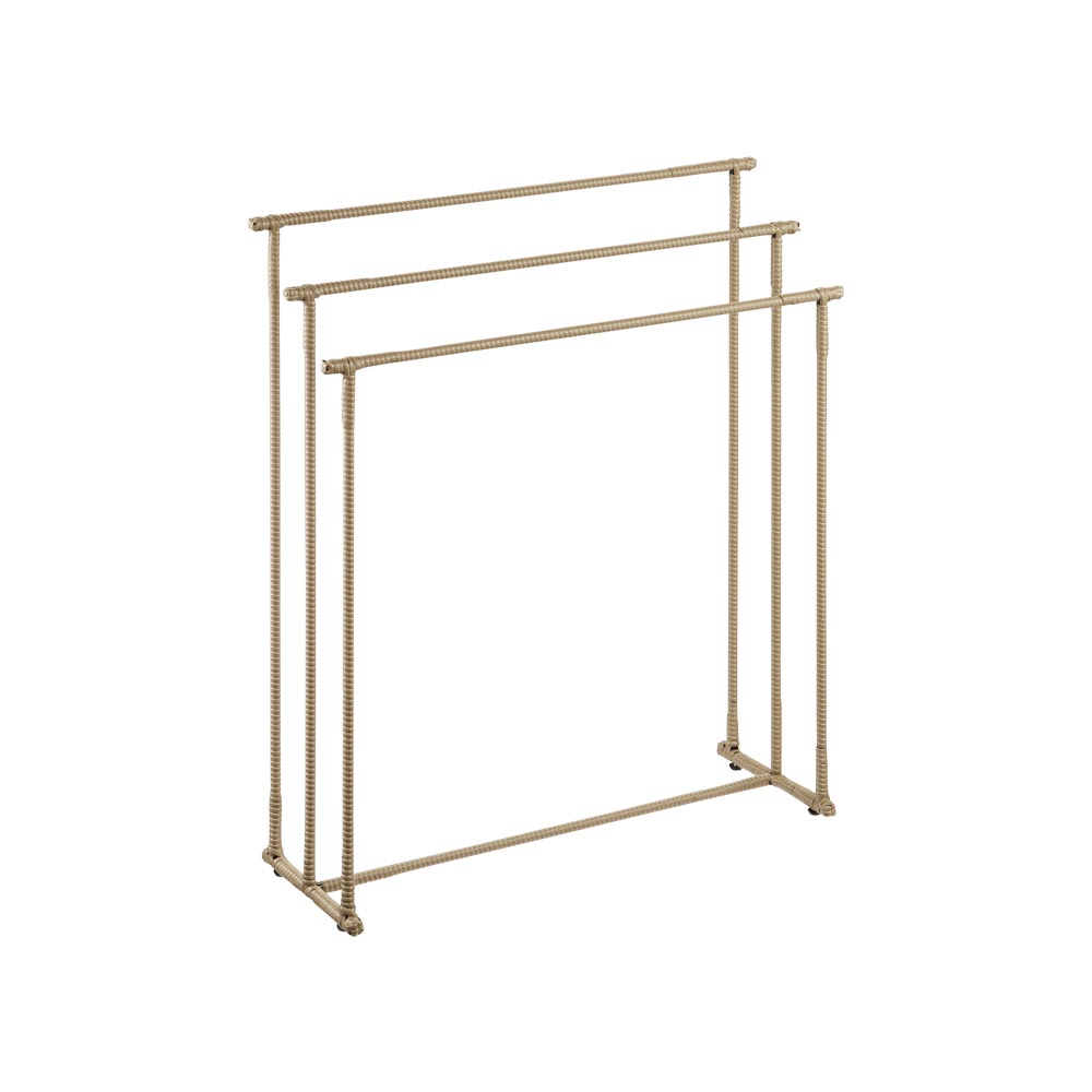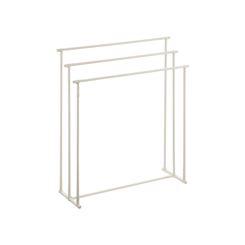 水濡れに強くおしゃれで人気のラタン調からバスタオルハンガーが登場。やや幅広のバーは海外製バスタオルも掛けられるサイズ。軽くても安定感があり、扱いやすく掃除の時も嬉しい。水濡れに強くおしゃれで人気のラタン調からバスタオルハンガーが登場!■水に強く通気性の良い、ラタン調の樹脂素材本体は樹脂素材なので水や汚れに強く、湿った洋服でも安心です。通気性が良く、臭いや湿気もこもりにくく、汚れた洗濯物もOK。汚れが気になる場合は、水拭きで簡単にお手入れできます。■やや幅広のバー設計で海外製バスタオルも掛けられますタオルバーの広さにもこだわった設計で、少し幅の広い海外製バスタオルも掛けられるサイズ。軽くて扱いやすいラタン調なので、コンパクトながら移動も楽々です。■おしゃれなラタン調シリーズでランドリータイムを快適に生活感の出るバスタオル掛けは、ラタン調シリーズで洗濯前のタオルを存分にかけて。シリーズでお使いいただけば、洗面所の空間に統一感をもたらせます。■インテリアに合わせて3色からホワイトは清潔感があり、明るい印象に。ブラウンは本物のラタンのように立体感のあるおしゃれな色味。ダークブラウンはシックで高級感を演出。インテリアにもなじみゃすいカラーです。