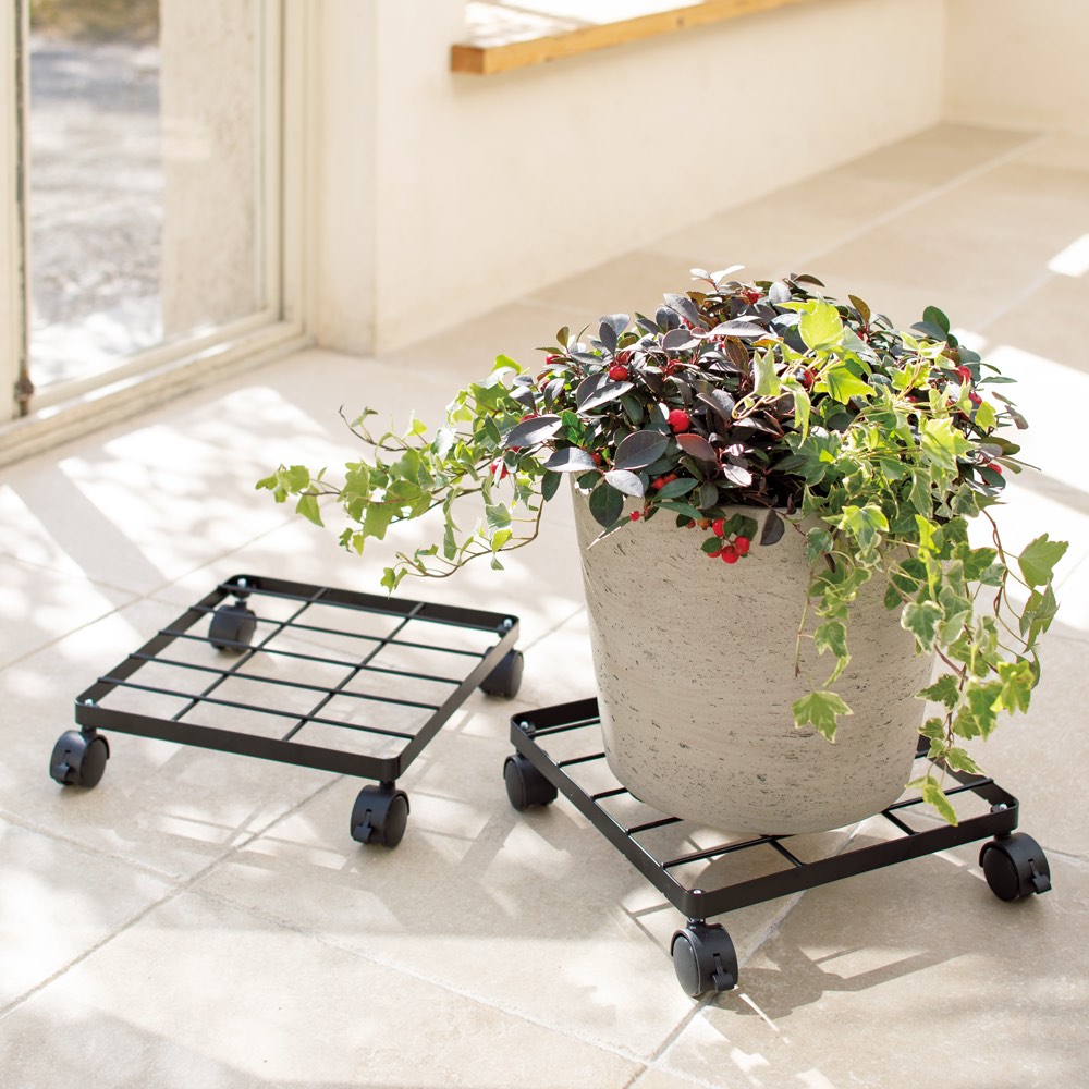 四角い鉢にも端正になじむ30cm角サイズ。耐荷重40kgに加えてキャスター付きなので、重い鉢も安心してのせられる上、移動もスムーズ。