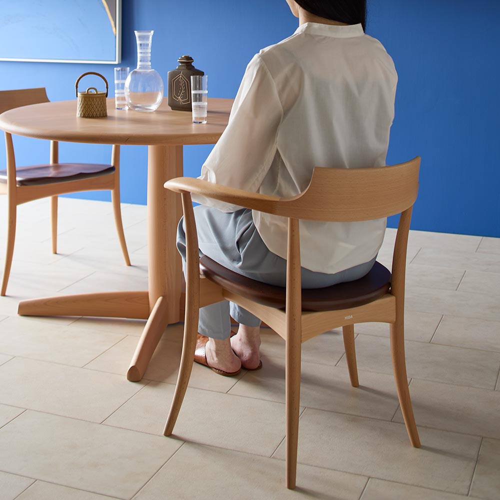 曲げ木家具でくつろぐ、温もりあふれる北欧モダンな空間。柔らかなフォルムの無垢材家具に囲まれた穏やかな時間。立ち上がりたくない座り心地で定評あるHIDAを代表する国産材のチェア。丸テーブルと合わせて風格のある空間に。飛騨の技と心を受け継ぐ老舗メーカー「飛騨産業」日本有数の家具の産地である岐阜県・飛騨高山。1920年に創業した「飛騨産業」は、“ 飛騨の匠”で知られる伝統技術、山々に密生した豊富なブナ原生林を資源に持つこの地で一世紀もの歴史を刻み、「キツツキマークの木製家具メーカー」として国内のみならず、世界でも高い評価を得ています。自分のために選びたい日々を豊かにする国産チェアどこから眺めても美しいシルエット、妥協のない精巧な細工、堅牢な使いやすさ― 。飛騨産業の家具には、いにしえの造都や寺院建設に貢献したといわれる名工たち、飛騨の匠の技と心が確かに息づいています。「立ち上がりたくない椅子」とも称されるHIDAのシンボリックチェア1995年に発表された、滑らかな曲線だけで構成される美しいデザインは、座り心地を追及した結果生まれた必然な形です。極上の座り心地を持つこのチェアはダイニングではもちろんのこと、パーソナルな空間で1脚からのご使用にもおすすめです。吸いつくようなフィット感背板もまた体を支える重要なパーツで、飛騨産業が世界に誇る匠の技「曲げ木」が使用されています。曲木とは、木材を蒸煮することで軟化させた後、曲型にはめて固定し、乾燥させて曲面に形成した部材のことです。曲木を使用した背板は背中にぴったりとフィットし、椅子に包み込まれるような心地を体感できます。触感のデザインこのチェアは「触感のデザイン」というコンセプトの基に、目を閉じて座っても、いい椅子だと思えるような掛け心地や触り心地を作ろうとデザイナーの佐々木敏光氏と手を組み開発されました。肘部分は下向きに少し傾斜した丸みのあるフォルムでつかみやすく、そっと肘を乗せると自然と肘裏に指が回り、心地良い安心感を得られます。座った時のフィット感。こだわりの座面木で出来た座面でありながらも、不思議なことに座ったときに堅さをあまり感じません。座面の角度や座面を立体的に削る「座繰り加工」を施し、職人の手で丹念に磨き上げることで、やさしい座り心地を実現しています。さらに塗装には「ノンスリップ加工」がされており、おしりが前に滑ることなく正しい姿勢を維持できます。職人技が光る、安心の日本製熟練の家具職人が、一点一点心をこめて丁寧に仕上げております。長く使うものだから、造りのしっかりした家具をお求めください。面倒な組み立てのいらない完成品組み立て不要の完成商品でのお届けになります。届いたその日からすぐにご使用いただけます。【HIDA】1920年飛騨高山に創業。飛騨産業の伝統である曲げ木の技と豊富なビーチ材を資源にした家具は、日本でも世界でも高い評価を得ています。ハウススタイリングは、HIDA(飛騨産業)の正規販売店ですディノス・ハウススタイリングは、HIDA(飛騨産業)の製品の正規販売店です。並行輸入品やリプロダクト、ジェネリックと称するコピー商品は販売しておりません。