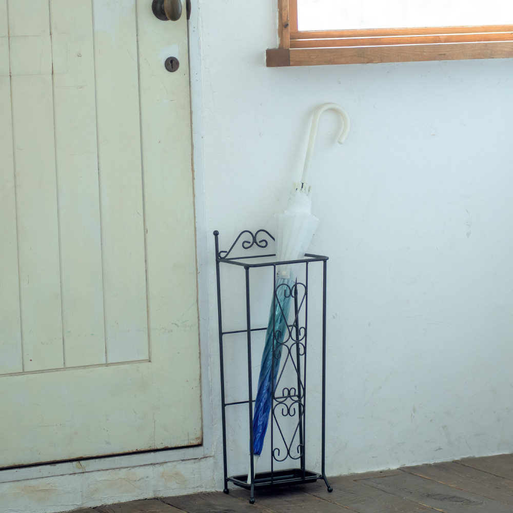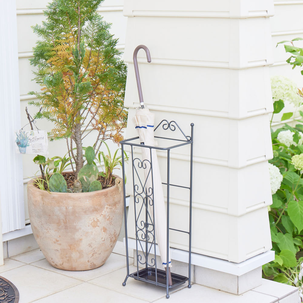 デザイン性とシンプルさを兼ね備えた傘立てはホウキなどのツールを立てても便利。水受けは取り外し可能。溜まった水がラクに捨てられます。玄関に傘立てがあれば、出がけに忘れてもすぐに手にできそうです。