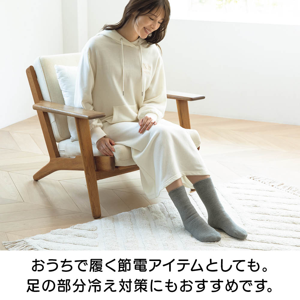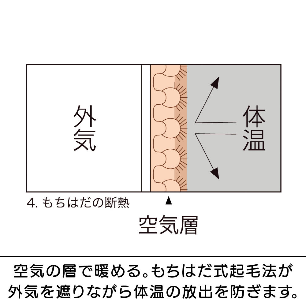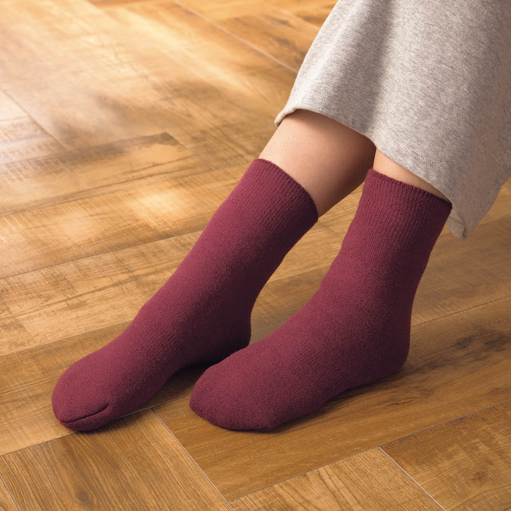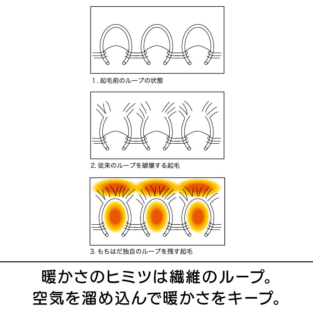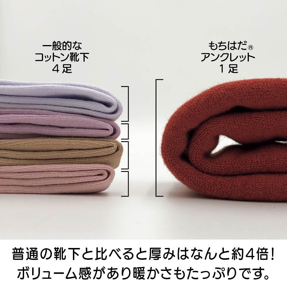 登山家・植村直巳氏も愛用していた50年以上のロングセラーを誇るあったか素材「もちはだ(R)」シリーズのアンクレットタイプの靴下。「世界から寒さをなくしたい」という製造メーカー「ワシオ」のメッセージが込められた1足。この冬のマストアイテムです。フローリングの床でもスリッパいらずで指先までぽかぽかに。まるでふかふかの毛布を履いているような厚みのある起毛で冷えをシャットアウト。かかとのない筒タイプのデザインでワンサイズ展開。男女兼用なのでペアで揃えるのもおすすめです。暖房がなくても、履いているだけでぽかぽか。足元の冷えが気になる方におすすめしたいソックスです。これ1枚でも十分暖かですが、カバーソックスとして重ね履きにも重宝します。起毛のタイプは厚みによって6タイプ。靴下に使用されている「極厚地」は「超極厚地」に次ぐ2番目の生地厚で、スポーツ観戦やキャンプなど、アウトドアアイテムに幅広く使用されています。通常の起毛処理は毛羽立つけれどループ部分が壊れてしまいます。もちはだ(R)は独自の技術でこのループを破壊することなく上部だけを起毛。起毛部分とループの両方に溜め込んだ空気で驚きの暖かさを生み出しています。起毛部分とループ内にできる空気層が見えないベールとなって外気を遮断すると同時に、体温が外に逃げるのを防いでいます。写真のように、もちはだ(R)はパイルの頭部分だけが起毛されていて、ループの輪の形は切れていないことがわかります。これを可能にしたのが50年以上変わらない「ワシオ」にしかできない独自技術なんです。1970年、兵庫県の地場産業である靴下の編機を改良したオリジナルの編機から、独自の起毛生地「もちはだ(R)」が誕生しました。その暖かさは50年以上にわたって愛され続けています。一般的なコットン素材の靴下の約4倍もの厚みが!足の先までふんだんに起毛を使用しています。