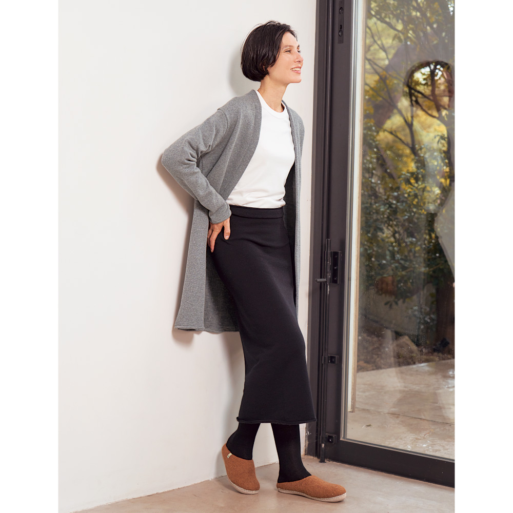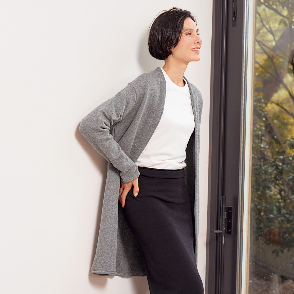 冷えやすい腰回りをしっかり温めてくれるロングタイプ。(イ)グレー コーディネート例 ※お届けはカーディガンです。