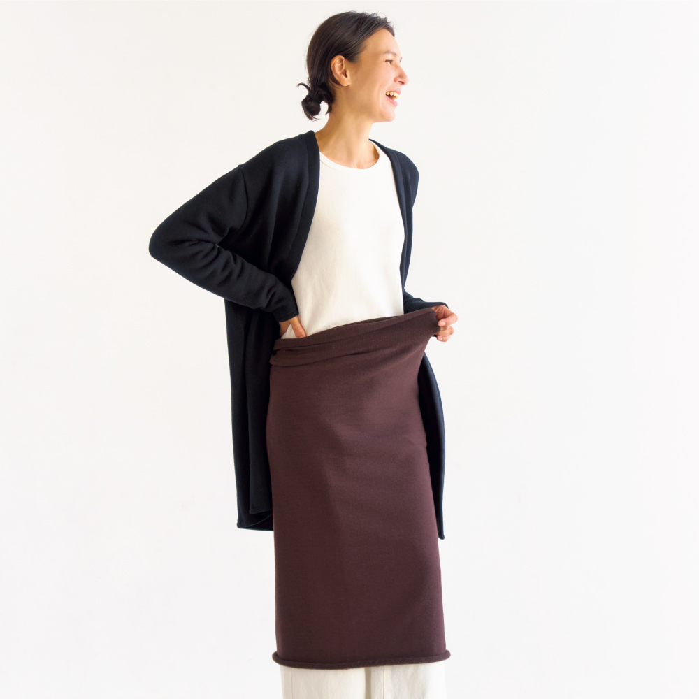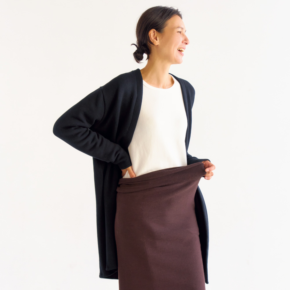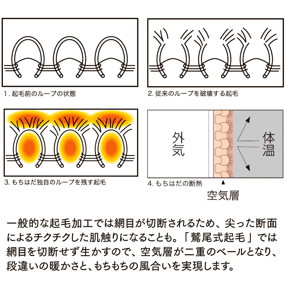 着やすくてポカポカ風合いあるホームウエア。カーディガンはロング丈。冷えやすい腰周りをしっかりガード。「世界中から寒いをなくしたい。」と、暖かさにこだわり続け、独自の起毛技術を持つワシオ株式会社が作る「もちはだ(R)」シリーズ。適度なフィット感があり、伸びもとても良く、洗濯後も変わらず起毛の柔らかな風合いと肌触りが持続します。暑くなるくらい暖かい。毎日のくらしにもちはだ(R)の温もりを。着る人を選ばないシンプルなデザインに、暖かさへのこだわりがいっぱい詰まっています。肌寒い日も暖かく過ごせます。コンビニやスーパーなど、ご近所へのちょっとしたお出かけ時も使えます。吐く息は白くても体はあったか。思わず足取りも弾みます。通常の起毛処理は毛羽立つけれどループ部分が壊れてしまいます。もちはだ(R)は独自の技術でこのループを破壊することなく上部だけを起毛。起毛部分とループの両方に溜め込んだ空気で驚きの暖かさを生み出しています。起毛部分とループ内にできる空気層が見えないベールとなって外気を遮断すると同時に、体温が外に逃げるのを防いでいます。1970年、兵庫県の地場産業である靴下の編機を改良したオリジナルの編機から、独自の起毛生地「もちはだ(R)」が誕生しました。その暖かさは50年以上にわたって愛され続けています。