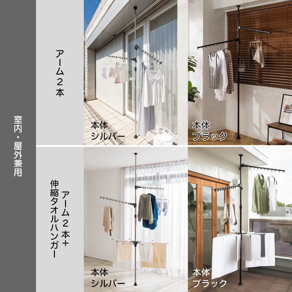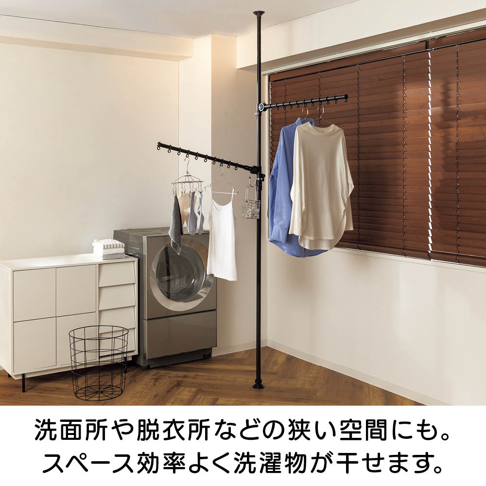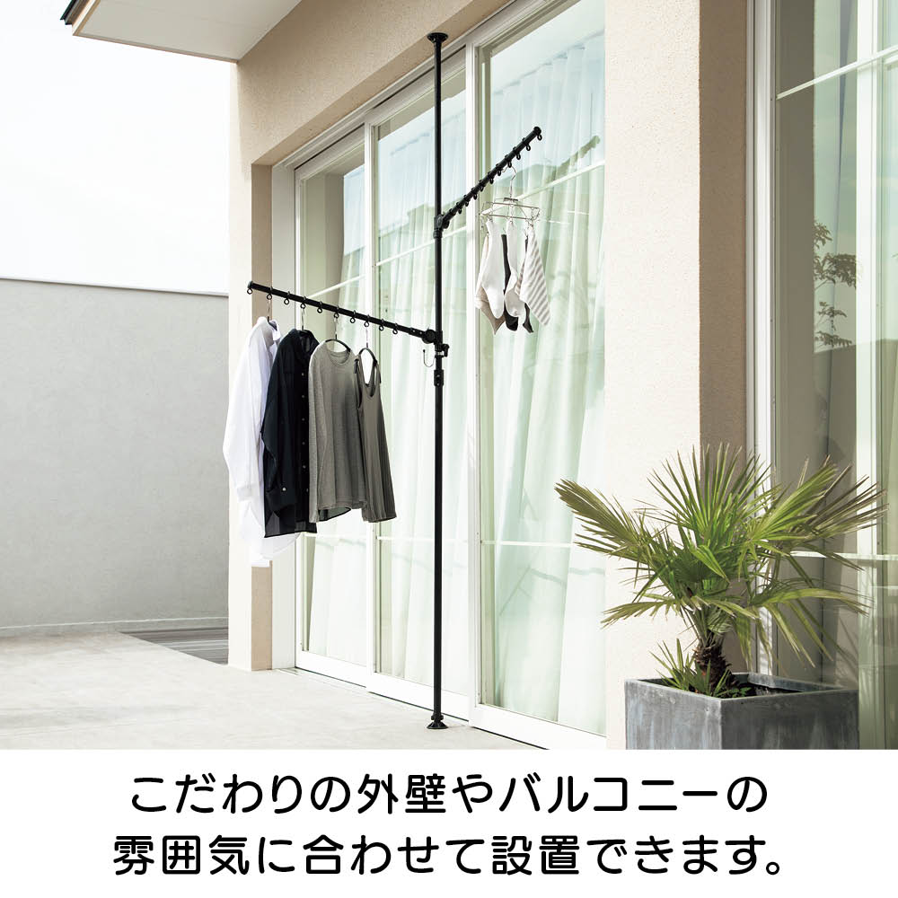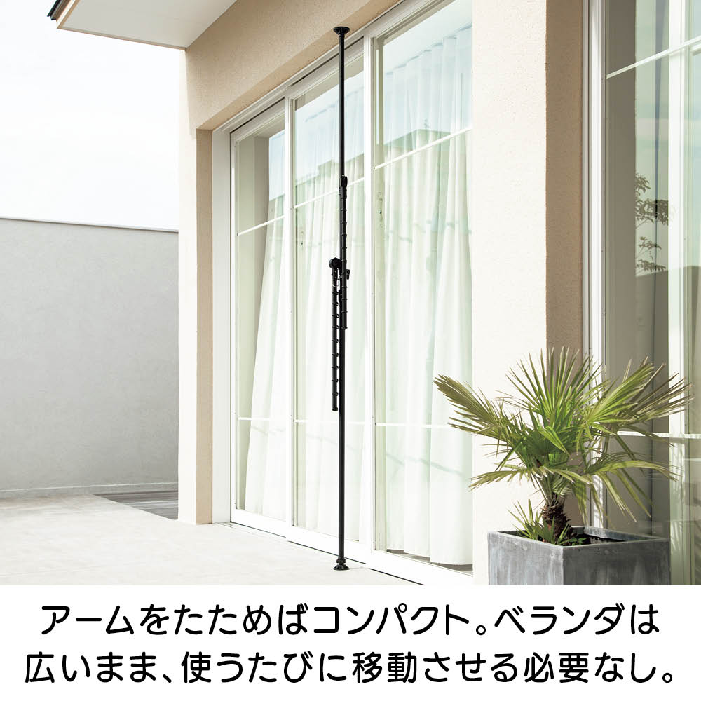 ワンタッチで簡単につっぱり設置でき、超省スペースで洗濯物が干せる「どこでもポール 物干しシリーズ」に待望のブラックが登場。てかりを抑えたマットな黒なので、インテリアにこだわりのあるお部屋でもオシャレに干せます。使用後はポールを下ろすだけですっきり、出し入れする手間もナシ!センスを感じられるこだわりのインテリアにもしっくりとなじむオールブラック。ブルックリンインテリアやカフェ風インテリア、北欧モダンなど、テイストを選ばずコーディネートできます。たたんだ時の立ち姿もシンプルなので、お部屋のイメージを損ねません。こだわりの外壁やバルコニーの雰囲気に合わせて設置できます。室内・屋外どちらでも使えるので、設置場所を選びません。設置後もアームの高さや向きを簡単に変えられるので、日当たりの向きに合わせて調整すれば、早く乾かすことができます。洗面所や脱衣所などの狭い空間にも。スペース効率よく洗濯物が干せます。使用後はアームをたたむだけで片付け完了!使うたびに出し入れする面倒も、収納場所の心配も無用です。洗濯機のそばに設置すれば、洗い上がりに取り出した洗濯物をダイレクトに干せるので、移動する手間がなく家事の時短にも。ビカクシダやエアプランツなど観葉植物を吊るしても。天井から吊るすのはハードルが高かった人気の吊り下げタイプのグリーンも、手軽かつオシャレに楽しめます。ペットを飼っていて、床にグリーンを置けない人にもオススメ。アームが動くので水やりの時も便利!シンプルなアーム2本タイプ。長さ76cmのアームが2本、それぞれにハンガー掛けリングが10個ずつ付いているので、数日分まとめて洗濯しても安心のキャパです。一人でも、簡単につっぱれる。設置したい場所を決めたら、調節ボタンを押しながら天井まで伸ばし、ぐっと押し付ければ設置完了。上下にすべり止めが付いているので安定して設置できます。用途に合わせて選べるどこでもポールシリーズ1室内でも屋外でも使える便利な兼用タイプ。アームの回転を防ぐストッパー付きなので、風のある日の外干しも安心です。用途に合わせて選べるどこでもポールシリーズ2リビング、洗面所や脱衣室、バスルーム、寝室など狭い場所にもワンタッチで設置できるので、お好みの場所がすぐに物干しスペースに。片付けはアームをたたむだけで、手間も場所もとりません。