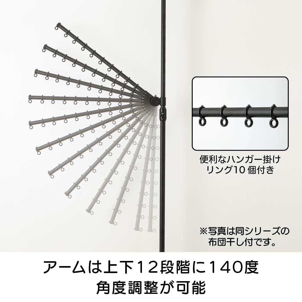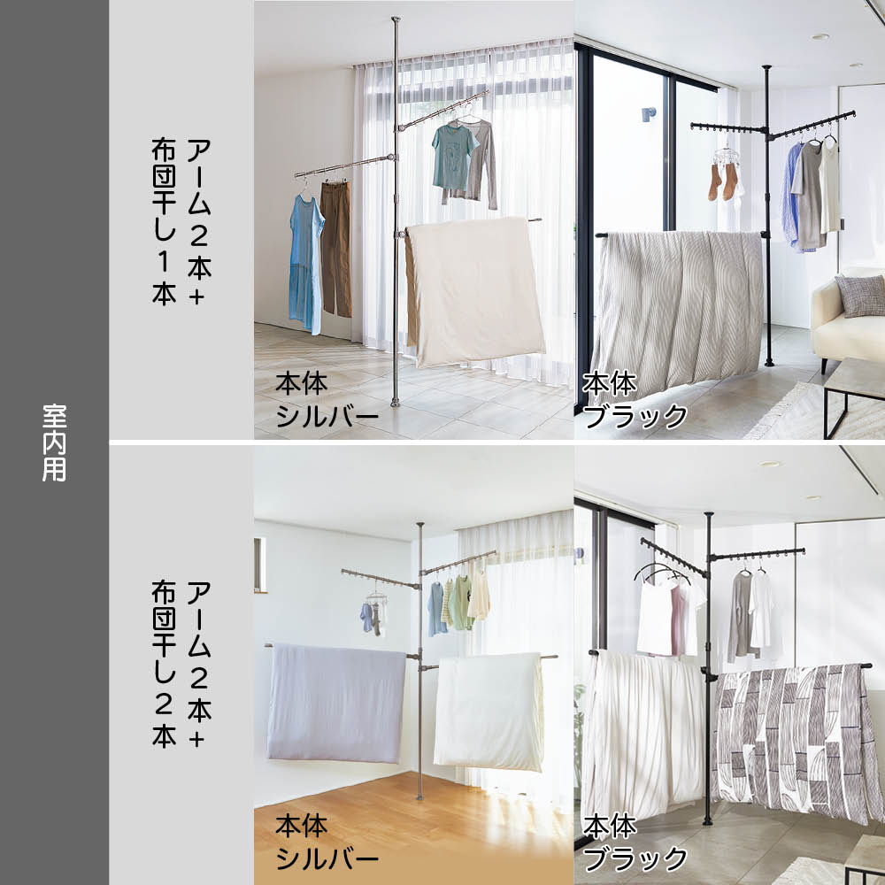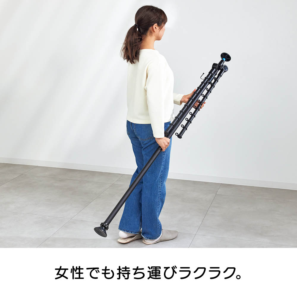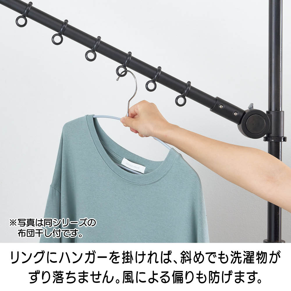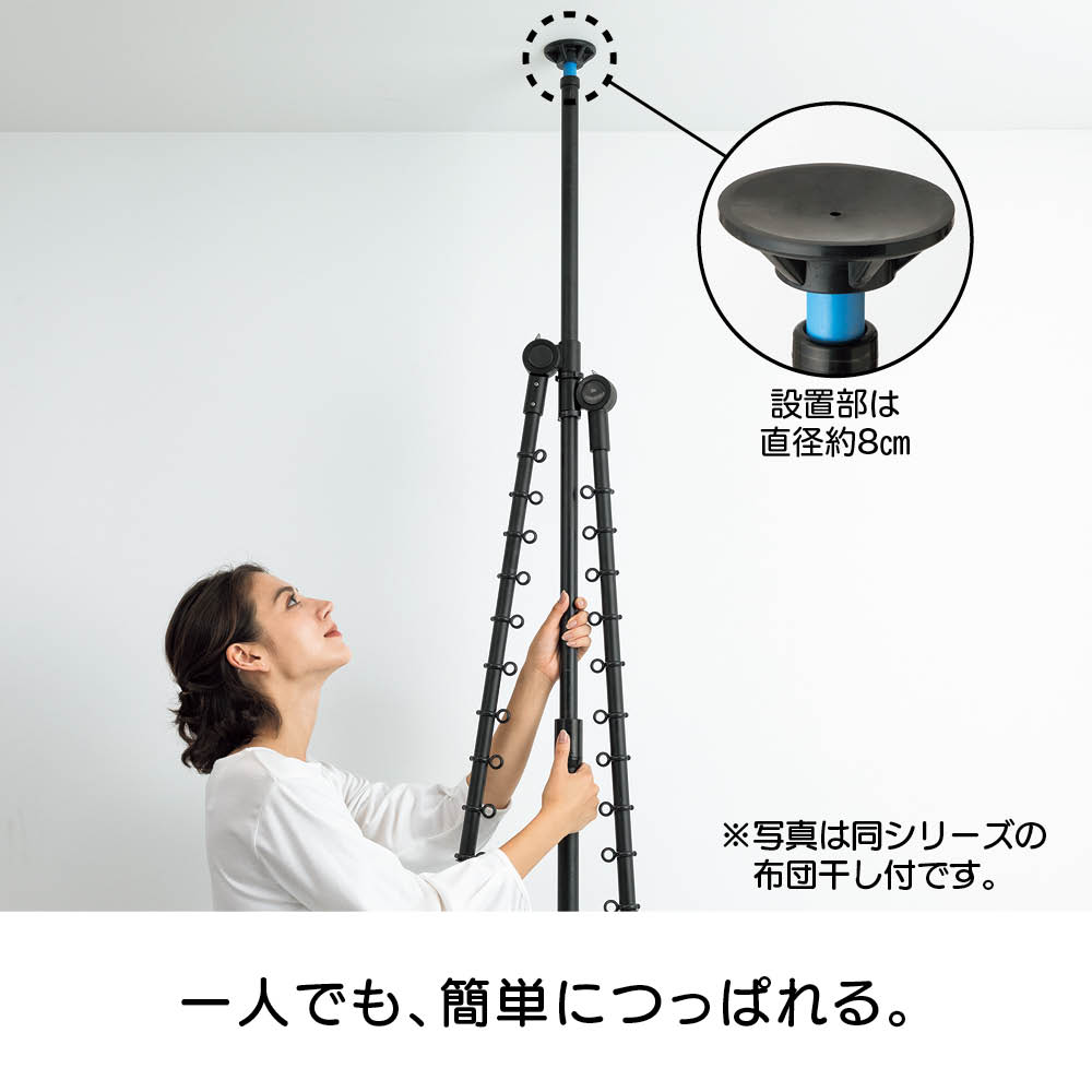 ワンタッチで簡単につっぱり設置でき、超省スペースで洗濯物が干せる「どこでもポール 物干しシリーズ」に待望のブラックが登場。てかりを抑えたマットな黒なので、インテリアにこだわりのあるお部屋でもオシャレに干せます。使用後はポールを下ろすだけですっきり、出し入れする手間もナシ!センスを感じられるこだわりのインテリアにもしっくりとなじむオールブラック。ブルックリンインテリアやカフェ風インテリア、北欧モダンなど、テイストを選ばずコーディネートできます。たたんだ時の立ち姿もシンプルなので、お部屋のイメージを損ねません。こだわりの外壁やバルコニーの雰囲気に合わせて設置できます。室内・屋外どちらでも使えるので、設置場所を選びません。設置後もアームの高さや向きを簡単に変えられるので、日当たりの向きに合わせて調整すれば、早く乾かすことができます。洗面所や脱衣所などの狭い空間にも。スペース効率よく洗濯物が干せます。使用後はアームをたたむだけで片付け完了!使うたびに出し入れする面倒も、収納場所の心配も無用です。洗濯機のそばに設置すれば、洗い上がりに取り出した洗濯物をダイレクトに干せるので、移動する手間がなく家事の時短にも。ビカクシダやエアプランツなど観葉植物を吊るしても。天井から吊るすのはハードルが高かった人気の吊り下げタイプのグリーンも、手軽かつオシャレに楽しめます。ペットを飼っていて、床にグリーンを置けない人にもオススメ。アームが動くので水やりの時も便利!シンプルなアーム2本タイプ。長さ76cmのアームが2本、それぞれにハンガー掛けリングが10個ずつ付いているので、数日分まとめて洗濯しても安心のキャパです。一人でも、簡単につっぱれる。設置したい場所を決めたら、調節ボタンを押しながら天井まで伸ばし、ぐっと押し付ければ設置完了。上下にすべり止めが付いているので安定して設置できます。用途に合わせて選べるどこでもポールシリーズ1室内でも屋外でも使える便利な兼用タイプ。アームの回転を防ぐストッパー付きなので、風のある日の外干しも安心です。用途に合わせて選べるどこでもポールシリーズ2リビング、洗面所や脱衣室、バスルーム、寝室など狭い場所にもワンタッチで設置できるので、お好みの場所がすぐに物干しスペースに。片付けはアームをたたむだけで、手間も場所もとりません。