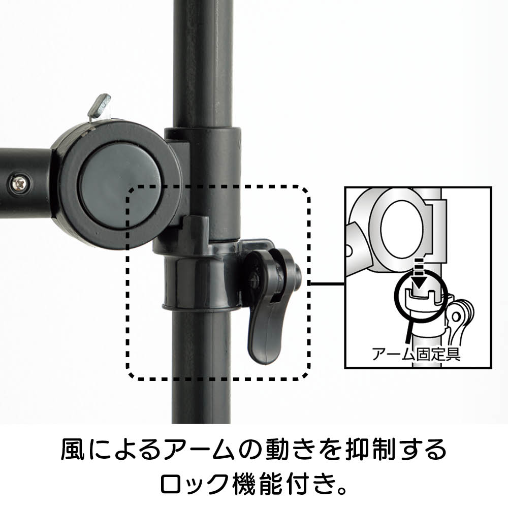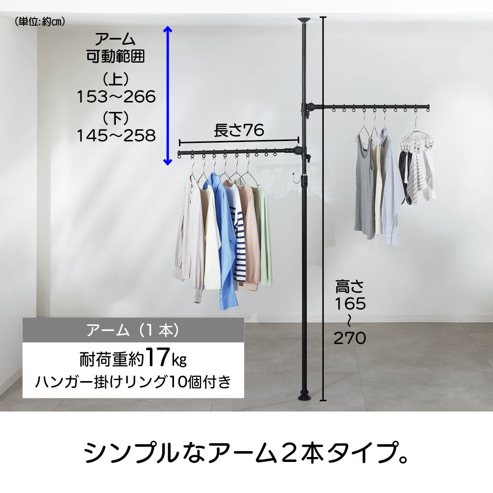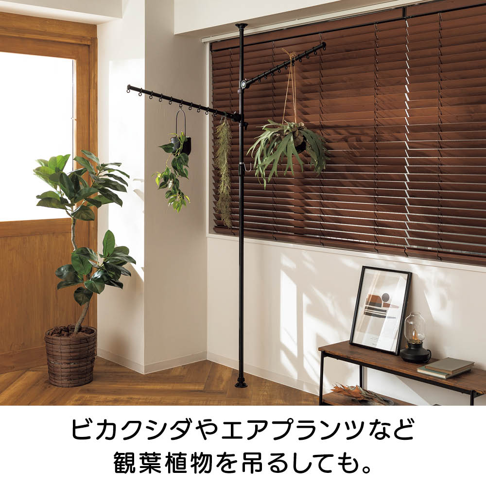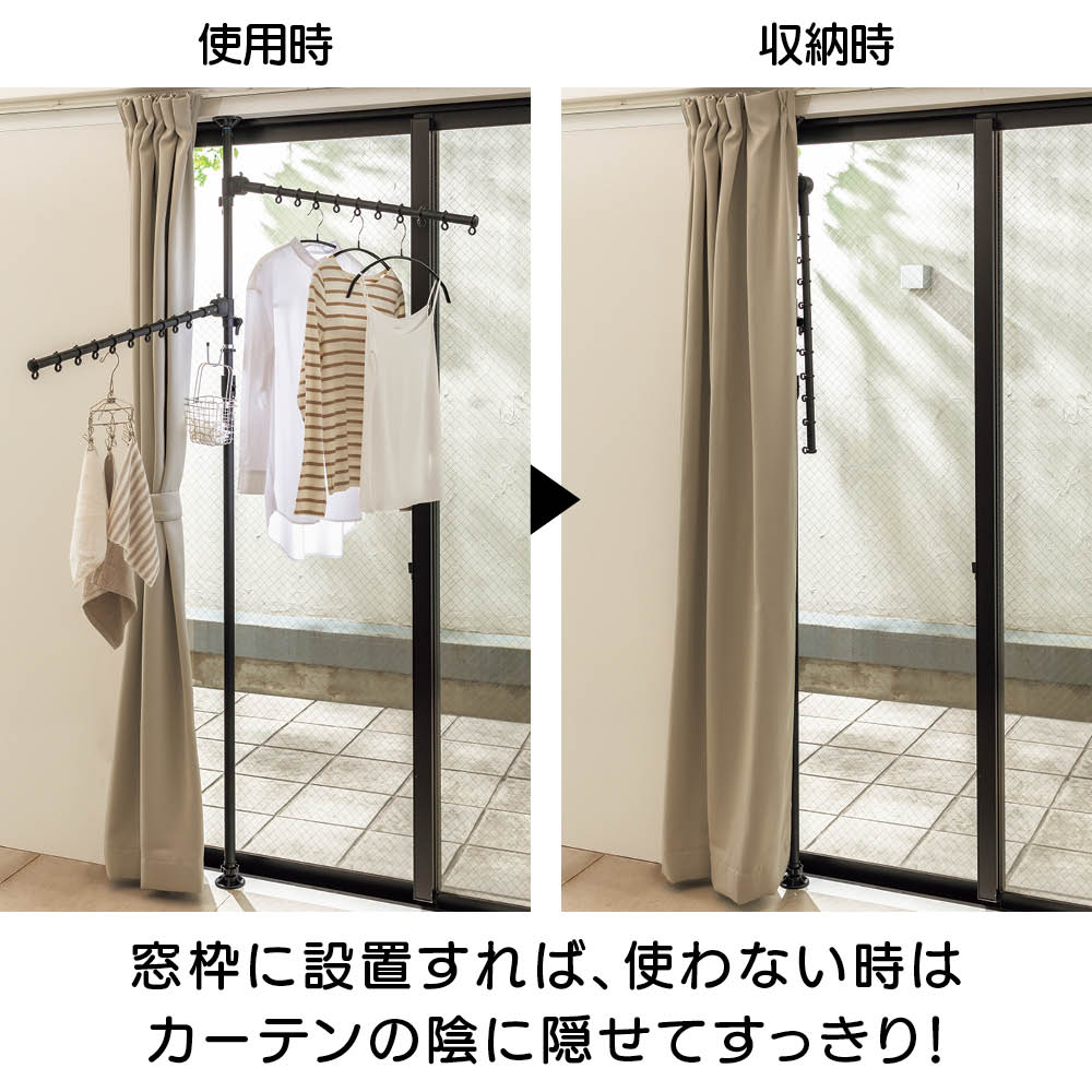 ワンタッチで簡単につっぱり設置でき、超省スペースで洗濯物が干せる「どこでもポール 物干しシリーズ」に待望のブラックが登場。てかりを抑えたマットな黒なので、インテリアにこだわりのあるお部屋でもオシャレに干せます。使用後はポールを下ろすだけですっきり、出し入れする手間もナシ!センスを感じられるこだわりのインテリアにもしっくりとなじむオールブラック。ブルックリンインテリアやカフェ風インテリア、北欧モダンなど、テイストを選ばずコーディネートできます。たたんだ時の立ち姿もシンプルなので、お部屋のイメージを損ねません。こだわりの外壁やバルコニーの雰囲気に合わせて設置できます。室内・屋外どちらでも使えるので、設置場所を選びません。設置後もアームの高さや向きを簡単に変えられるので、日当たりの向きに合わせて調整すれば、早く乾かすことができます。洗面所や脱衣所などの狭い空間にも。スペース効率よく洗濯物が干せます。使用後はアームをたたむだけで片付け完了!使うたびに出し入れする面倒も、収納場所の心配も無用です。洗濯機のそばに設置すれば、洗い上がりに取り出した洗濯物をダイレクトに干せるので、移動する手間がなく家事の時短にも。ビカクシダやエアプランツなど観葉植物を吊るしても。天井から吊るすのはハードルが高かった人気の吊り下げタイプのグリーンも、手軽かつオシャレに楽しめます。ペットを飼っていて、床にグリーンを置けない人にもオススメ。アームが動くので水やりの時も便利!シンプルなアーム2本タイプ。長さ76cmのアームが2本、それぞれにハンガー掛けリングが10個ずつ付いているので、数日分まとめて洗濯しても安心のキャパです。一人でも、簡単につっぱれる。設置したい場所を決めたら、調節ボタンを押しながら天井まで伸ばし、ぐっと押し付ければ設置完了。上下にすべり止めが付いているので安定して設置できます。用途に合わせて選べるどこでもポールシリーズ1室内でも屋外でも使える便利な兼用タイプ。アームの回転を防ぐストッパー付きなので、風のある日の外干しも安心です。用途に合わせて選べるどこでもポールシリーズ2リビング、洗面所や脱衣室、バスルーム、寝室など狭い場所にもワンタッチで設置できるので、お好みの場所がすぐに物干しスペースに。片付けはアームをたたむだけで、手間も場所もとりません。