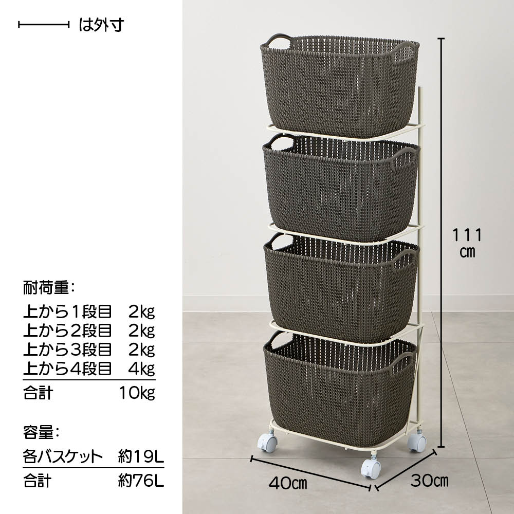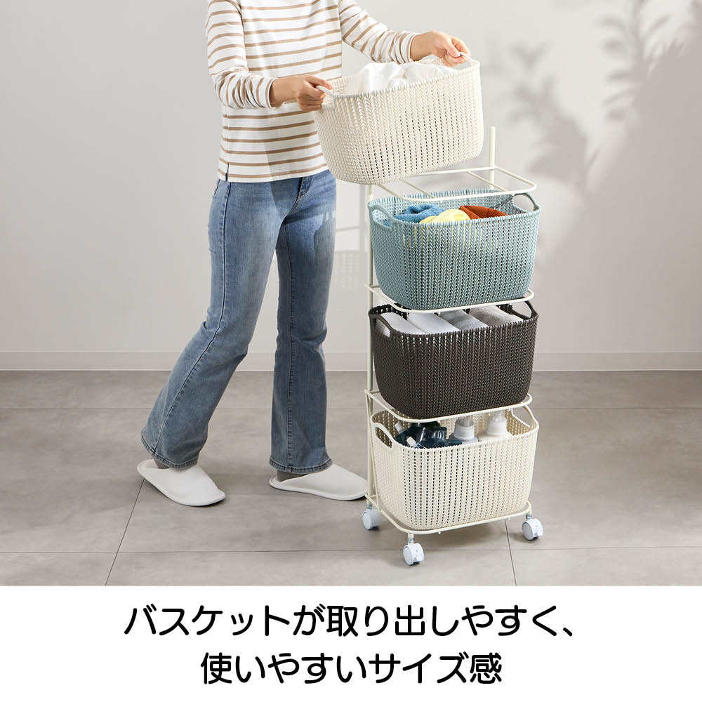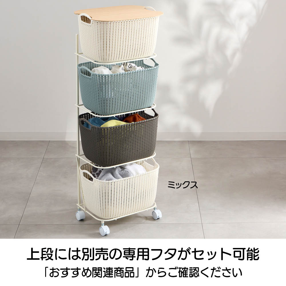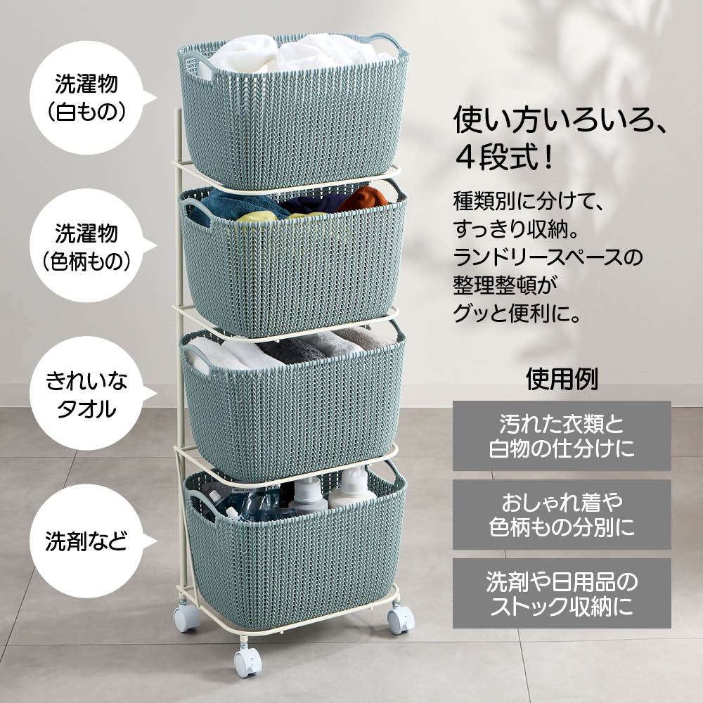 ランドリーワゴンが4段になって収納力がさらにアップ!ロングセラーのニット調バスケットに合わせて、使いやすさを考えて作りました。バスケット4個とワゴンをセットでお届けします。4つのバスケットで洗濯物の色分けはもちろん、タオルや洗剤など日用品の収納にも大活躍。置くだけで洗面スペースやランドリールームがおしゃれで快適な空間に。デザイン性と使いやすさを兼ねそろえた、ランドリーワゴンです。バスケットはこだわりのニット調ありそうでなかった本物のニットのようなやさしい質感、グレイッシュなカラーバリエーションも魅力。洗面台スペースをおしゃれにセンスアップします。引っかかりにくい、なめらかな手触り。通気性の良さも魅力です。内側がなめらかなので、タオルや衣類が引っかかりにくく、出し入れもスムーズです。通気性もよく、湿気やニオイがこもりにくいので、快適にお使いいただけます。バスケットは水洗いもできてお手入れ簡単汚れてもサッとひと拭き、まるごと水洗いもOK!きれいな見た目と使いやすさを両立しました。世界中で支持されるプラスチック製品専門の老舗メーカー、カーバー社再生プラスチック素材を使った生活用品のパイオニアとしても知られるカーバー社。丈夫さ・デザイン性・使いやすさ、すべてにこだわったモノづくりで世界中の家庭に支持されています。