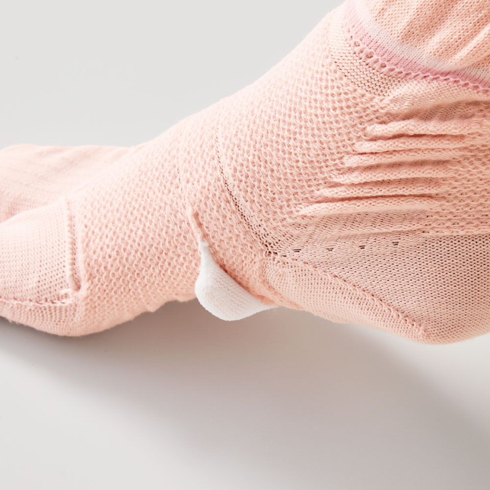 ほどよく押圧する独自のパッド クッション性のあるパッドを内蔵し、母趾外転筋に圧をかけることで親指を無理なくひらく。 ※下の画像は内側構造が分かりやすいよう、肌面を外にして着用しています。
