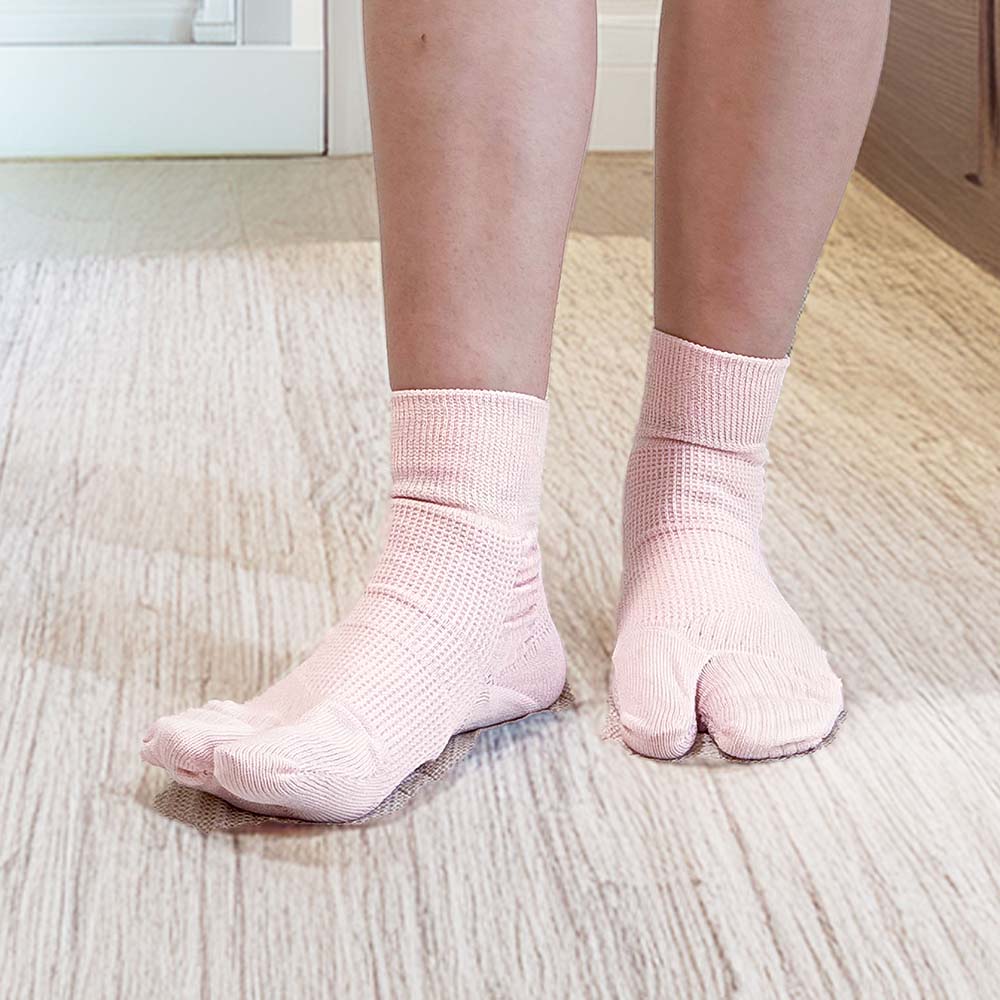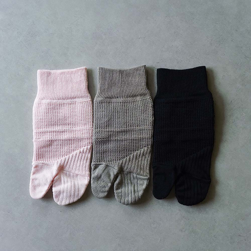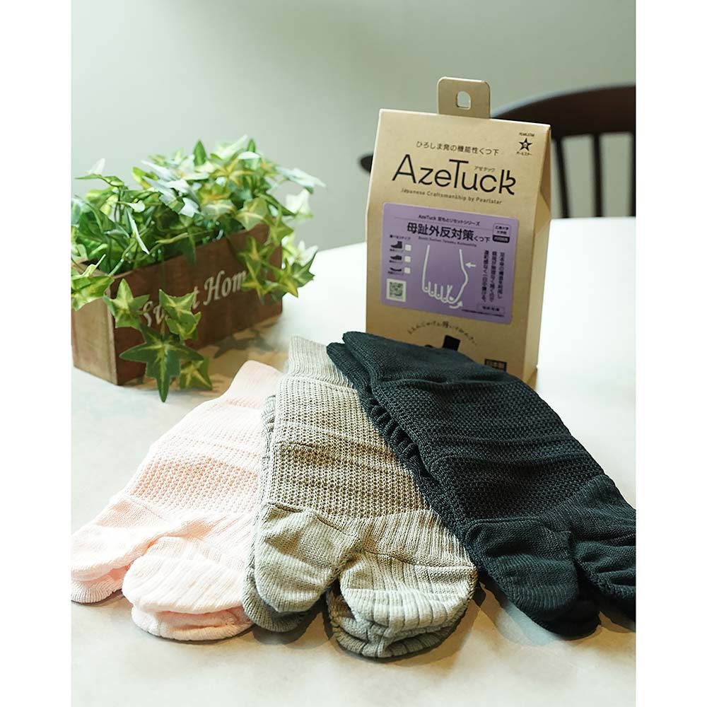 職人技が光る特殊縫製で、外反母趾の方の足指を優しくサポート。外反母趾にお悩みの方のために、広島大学大学院と共同開発。2つの編み方を組み合わせた独自の技術と構造で、親指を無理なくひらきやすくする靴下です。自然にサポートすることで、長時間着用しても快適。熟練の職人たちが丁寧に仕上げています。〔2つの編み方〕・タック編み 甲とアキレス腱の部分は伸縮性を抑えた硬い編み方。 ・あぜ編み 足裏・つま先部分は伸縮性の高い柔らかい編み方。⇒タック編みとの組み合わせで親指がひらくよう設計されています。「こんな方にオススメ」■外反の親指が気になる■脚への負担を減らしたい■快適に歩きたい■締め付けが苦手
