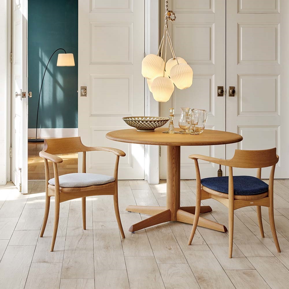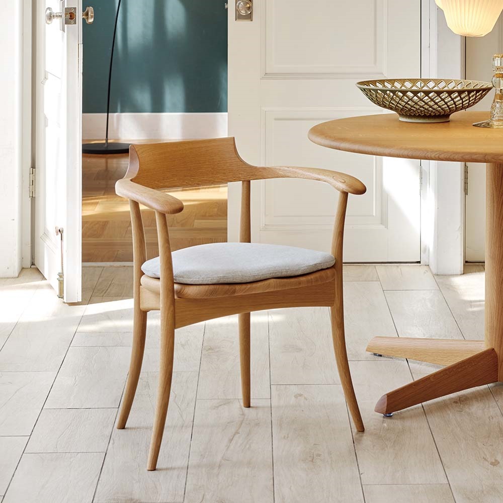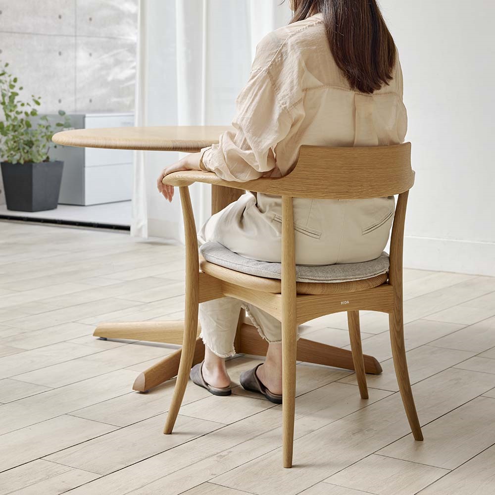 曲げ木家具でくつろぐ、温もりあふれる北欧モダンな空間。柔らかなフォルムの無垢材家具に囲まれた穏やかな時間。飛騨の匠の技が息づく家具シリーズ。立ち上がりたくない座り心地で定評あるHIDAを代表するデザイナーズチェア。丸テーブルと合わせて風格のある空間に。飛騨の技と心を受け継ぐ老舗メーカー「飛騨産業」日本有数の家具の産地である岐阜県・飛騨高山。1920年に創業した「飛騨産業」は、“ 飛騨の匠”で知られる伝統技術、山々に密生した豊富なブナ原生林を資源に持つこの地で一世紀もの歴史を刻み、「キツツキマークの木製家具メーカー」として国内のみならず、世界でも高い評価を得ています。自分のために選びたい日々を豊かにする国産チェアどこから眺めても美しいシルエット、妥協のない精巧な細工、堅牢な使いやすさ― 。飛騨産業の家具には、いにしえの造都や寺院建設に貢献したといわれる名工たち、飛騨の匠の技と心が確かに息づいています。「立ち上がりたくない椅子」とも称されるHIDAのシンボリックチェア1995年に発表された、滑らかな曲線だけで構成される美しいデザインは、座り心地を追及した結果生まれた必然な形です。極上の座り心地を持つこのチェアはダイニングではもちろんのこと、パーソナルな空間で1脚からのご使用にもおすすめです。吸いつくようなフィット感背板もまた体を支える重要なパーツで、飛騨産業が世界に誇る匠の技「曲げ木」が使用されています。曲木とは、木材を蒸煮することで軟化させた後、曲型にはめて固定し、乾燥させて曲面に形成した部材のことです。曲木を使用した背板は背中にぴったりとフィットし、椅子に包み込まれるような心地を体感できます。触感のデザインこのチェアは「触感のデザイン」というコンセプトの基に、目を閉じて座っても、いい椅子だと思えるような掛け心地や触り心地を作ろうとデザイナーの佐々木敏光氏と手を組み開発されました。肘部分は下向きに少し傾斜した丸みのあるフォルムでつかみやすく、そっと肘を乗せると自然と肘裏に指が回り、心地良い安心感を得られます。座った時のフィット感。こだわりの座面木で出来た座面でありながらも、不思議なことに座ったときに堅さをあまり感じません。座面の角度や座面を立体的に削る「座繰り加工」を施し、職人の手で丹念に磨き上げることで、やさしい座り心地を実現しています。さらに塗装には「ノンスリップ加工」がされており、おしりが前に滑ることなく正しい姿勢を維持できます。職人技が光る、安心の日本製熟練の家具職人が、一点一点心をこめて丁寧に仕上げております。長く使うものだから、造りのしっかりした家具をお求めください。面倒な組み立てのいらない完成品組み立て不要の完成商品でのお届けになります。届いたその日からすぐにご使用いただけます。【HIDA】1920年飛騨高山に創業。飛騨産業の伝統である曲げ木の技と豊富なビーチ材を資源にした家具は、日本でも世界でも高い評価を得ています。ハウススタイリングは、HIDA(飛騨産業)の正規販売店ですディノス・ハウススタイリングは、HIDA(飛騨産業)の製品の正規販売店です。並行輸入品やリプロダクト、ジェネリックと称するコピー商品は販売しておりません。