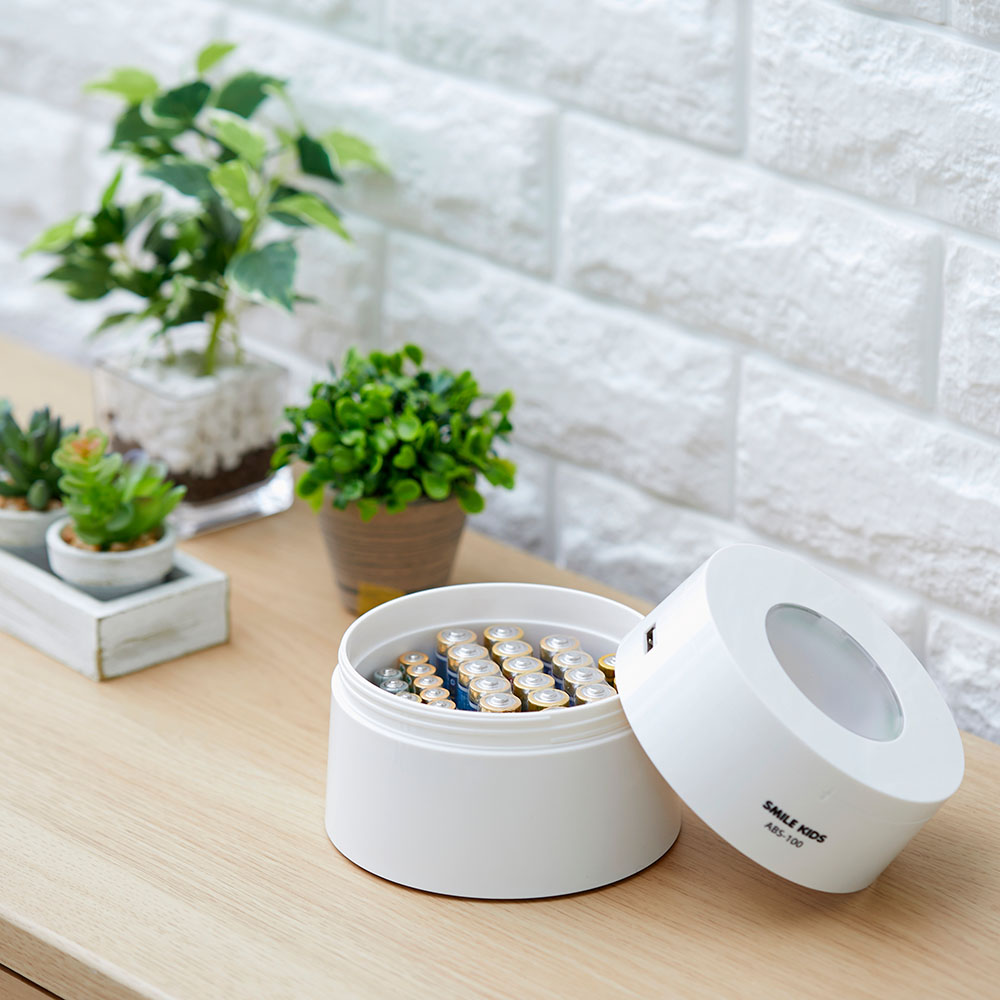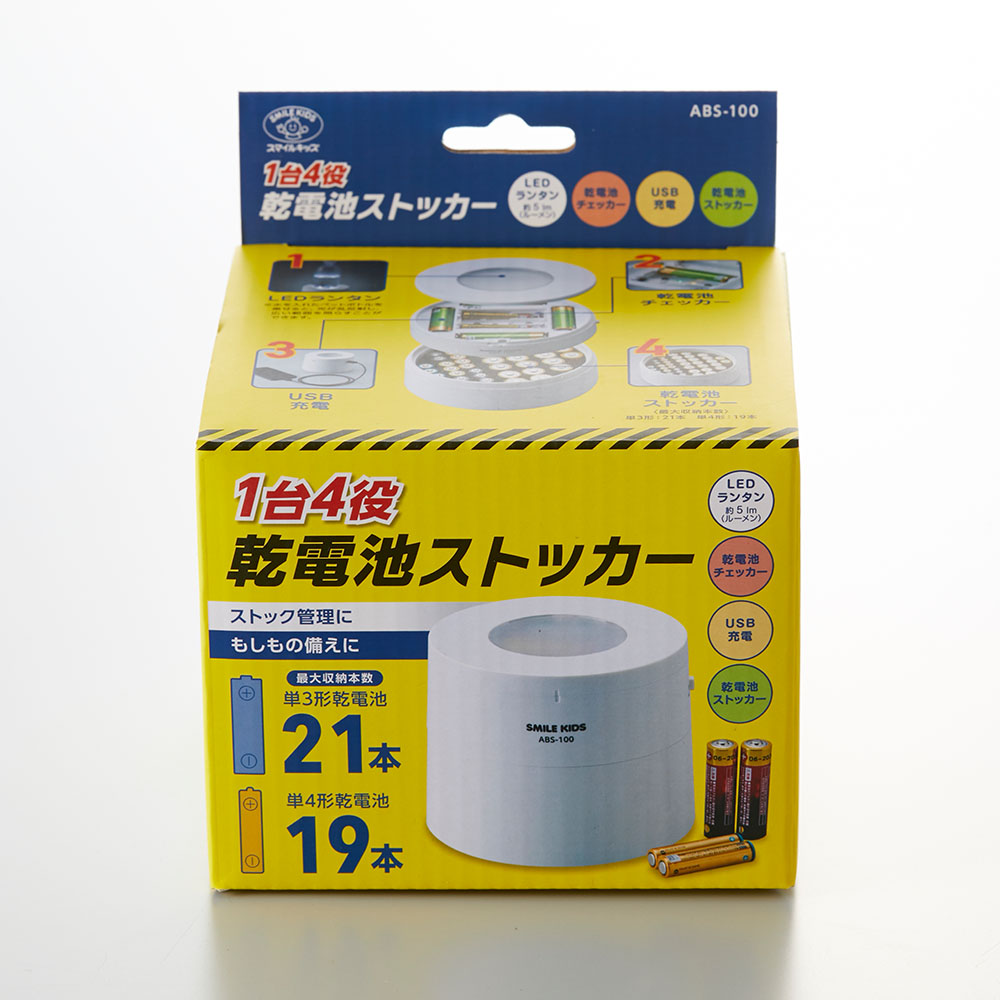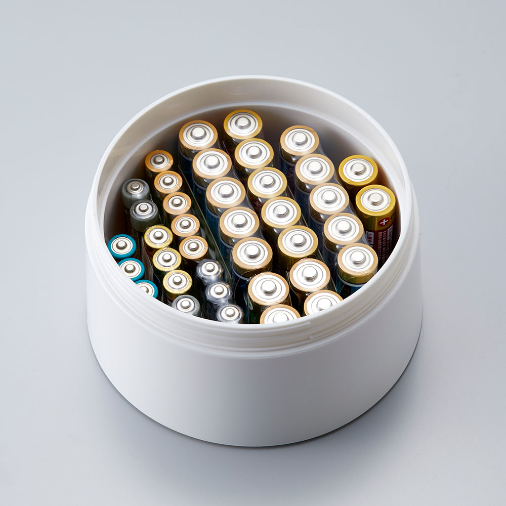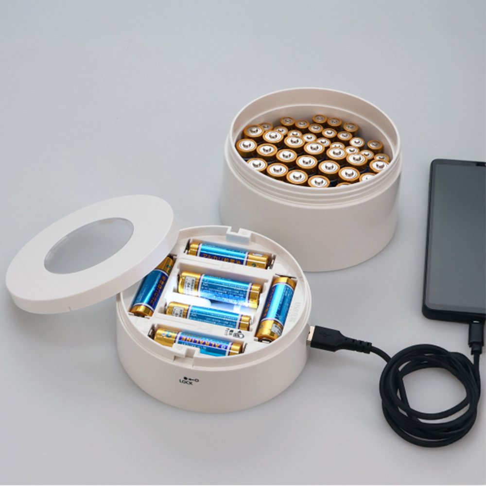 非常時も普段使いも安心!電池ストッカー、ランタン、充電器、電池チェッカーの1台4役。もしもの時に役立つ、単3形乾電池21本と単4形乾電池19本が同時に収納できる多機能ケースです。スライドスイッチでモード切替可能。電池管理も充電も明かりもこれ一台で!いつでも頼れる4in1マルチツール。最大で単3形乾電池21本と単4形乾電池19本をスッキリ収納できるストッカー機能で、電池の管理がぐっと楽に。乾電池の残量をLEDでパッと確認できるチェッカー機能も搭載。もう「使える電池が分からない」「買い置きがない」なんて焦ることもなく、いざという時の電池切れを防ぎます。ランタンやスマホ充電機能も備えているから、災害時やアウトドアにも大活躍です。(1)電池残量を測るチェッカー機能(2)LEDで周りを優しく照らすランタン機能水を入れたペットボトルを乗せると、光が乱反射し、広い範囲を照らすことができます。(3)スマートフォン充電機能(簡易充電)(4)乾電池収納機能(単3形乾電池が21本と単4形乾電池が19本同時に収納可能)周りに溶け込むシンプルなデザインです。電池残量とLED点灯は単3形でも単4形でも使用可能。【特徴】電池残量のチェッカーは使用可(緑・黄色点灯)、電池残量少ない(黄色点灯)の2段階表示。LED明るさ約5lm、連続点灯時間は単3形で約45時間、単4形で約20時間(国内製アルカリ乾電池使用時)、スマートフォンの簡易充電目安は約3時間充電で約50%充電(国内製単3形アルカリ乾電池使用、第2世代iPhoneSEにてテスト)※備考簡易充電機能を使用する際はお手持ちの純正ケーブルをご使用してください。