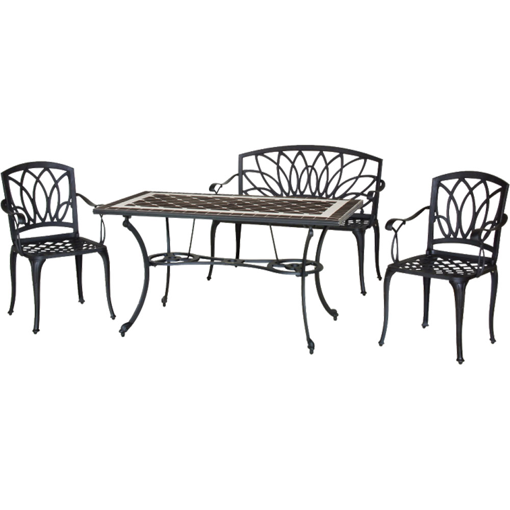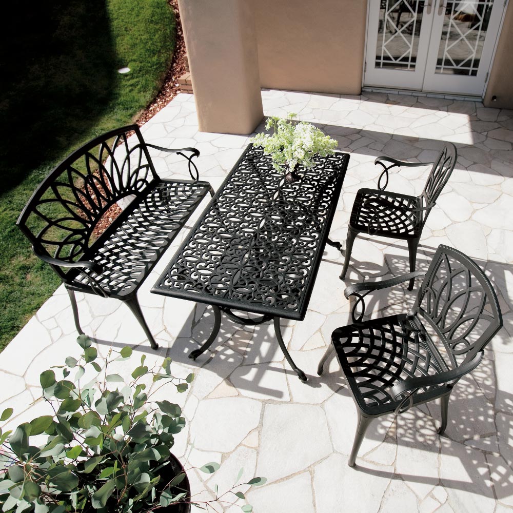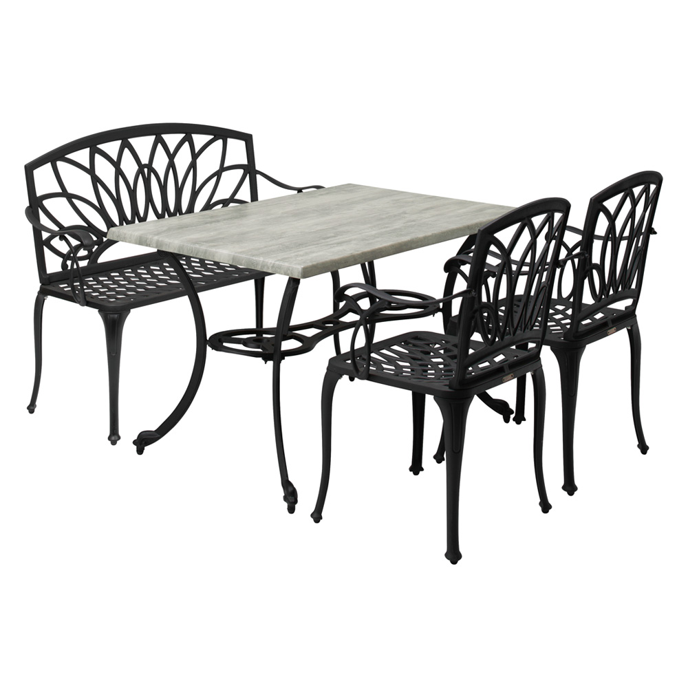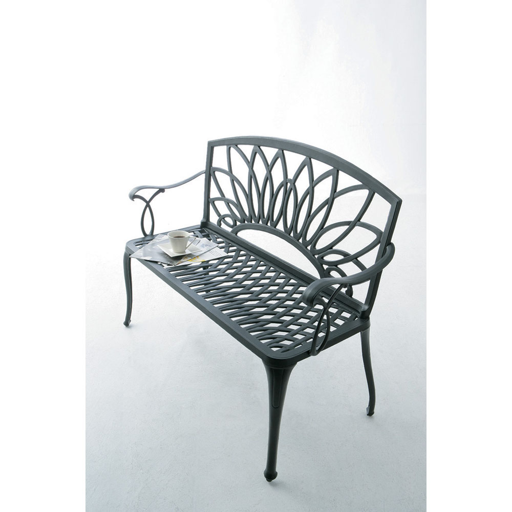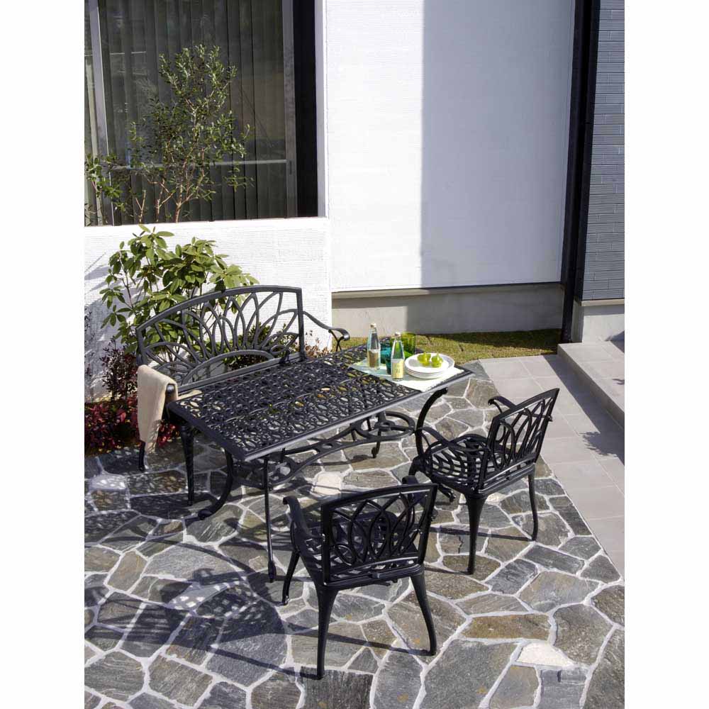 精緻な装飾模様が存在感を放つガーデンファニチャーシリーズのガーデンベンチ。重厚感あるブラックの色合いが、緑豊かなお庭の素敵なアクセントに。お庭をシックで重厚感のある空間に演出します。多彩なアイテムを揃えているので、お庭や使い方に合わせたセットをお選びいただけます。エレガントテイストでまとめたガーデンを、さらにグレードアップする選りすぐりのガーデンファニチャー。ガーデニングのポイントとも言える大切なアイテム選びにもこだわりを。【鋳物(いもの)】鋳型に金属を流しこみ凝固させる伝統的手法により、工芸品のような独特の風合いを持ちます。鋳物ならではの細かな造形や重厚な雰囲気を持つガーデン用品は、格調高いガーデン作りに好適と言えます。