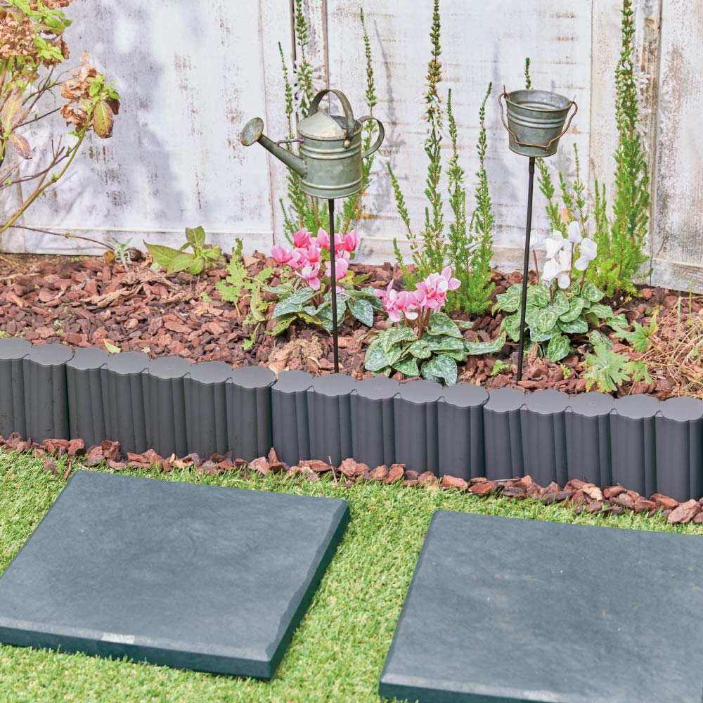 コーディネート例 本物と同じような造りのじょうろとバケツのピックを飾り、ガーデンブロックで縁取り、芝生にストーン風ステップを配せば花壇の見せ場が完成します。