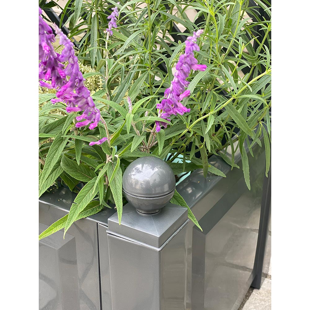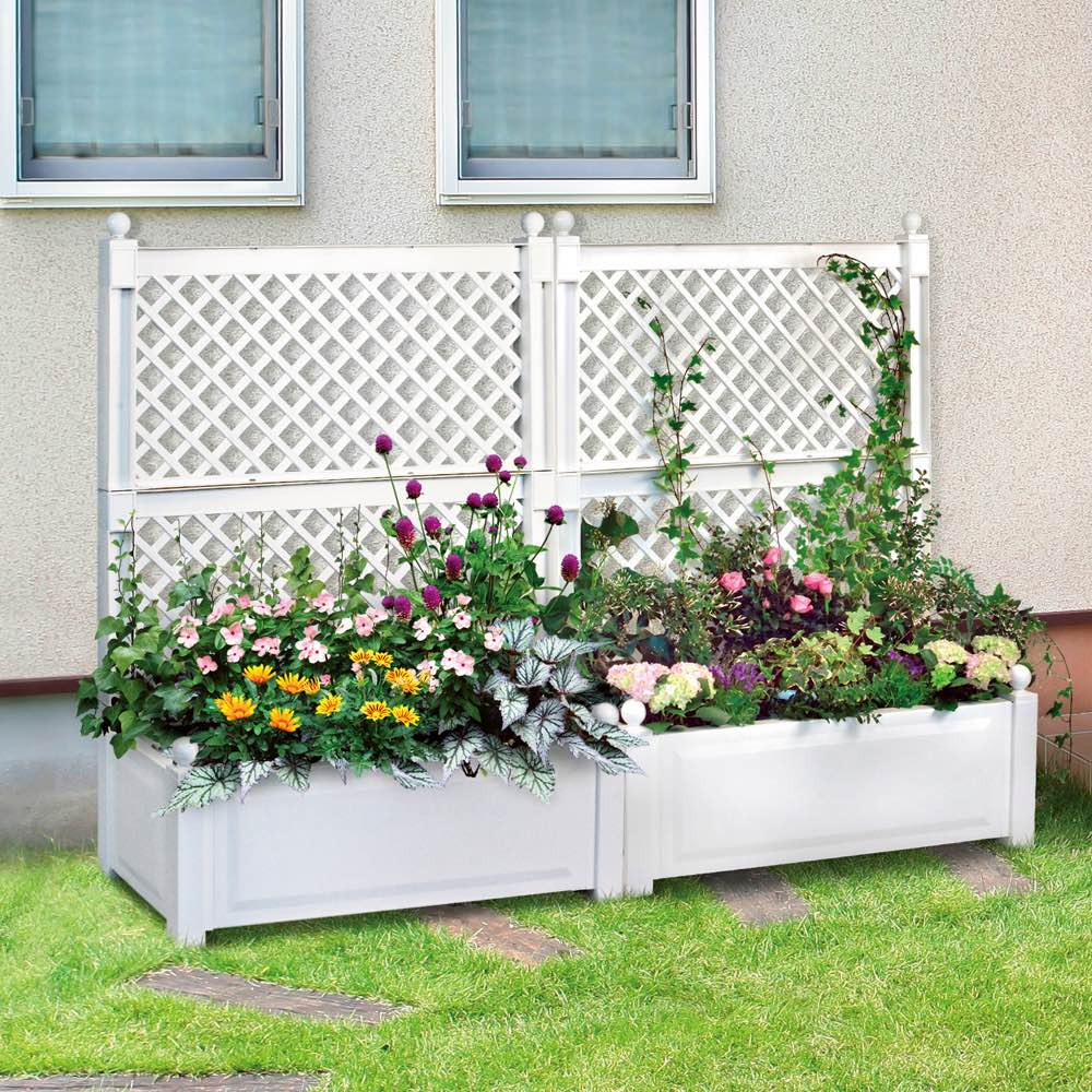 欧州デザインの樹脂製プランター付きトレリス。プランターがついているので地植えできない玄関やアプローチ、ベランダでも。憧れのバラやグリーンを絡ませて雰囲気のある壁面を演出してくれます。ヨーロッパの香り感じるエレガントなたたずまい。耐候性に優れた樹脂製なので雨水は流れ落ち、汚れも拭き取るだけ。清潔感を保てるのでお気に入りの空間を長く楽しめます。バラやクレマチスなどの誘引にもおすすめ、エレガントデザインのプランターボックス。無骨な壁面を美しくカバーします。程よいサイズ感でベランダなどにもおすすめです。腐食に強くメンテナンスが楽なプラスチック製。スタンダードなホワイトに加え、インポートならではの珍しいグレーをご用意。ヨーロピアンデザインの個性的なカラーで、ワンクラス上の個性的なお庭づくりに挑戦。【フェンス・トレリス】お隣との境界やお庭を仕切るガーデンフェンスとしてはもちろん、つる性の植物を這わせてトレリスとしての使い方もおすすめ。デコラティブなデザインのフェンスは、オフシーズンのお庭にも賑わいを添えてくれます。【KHW】ドイツ南部に拠点を置く成型品メーカーKHW社。品質を追求したベーシックデザインは、欧州ほか世界で支持されています。
