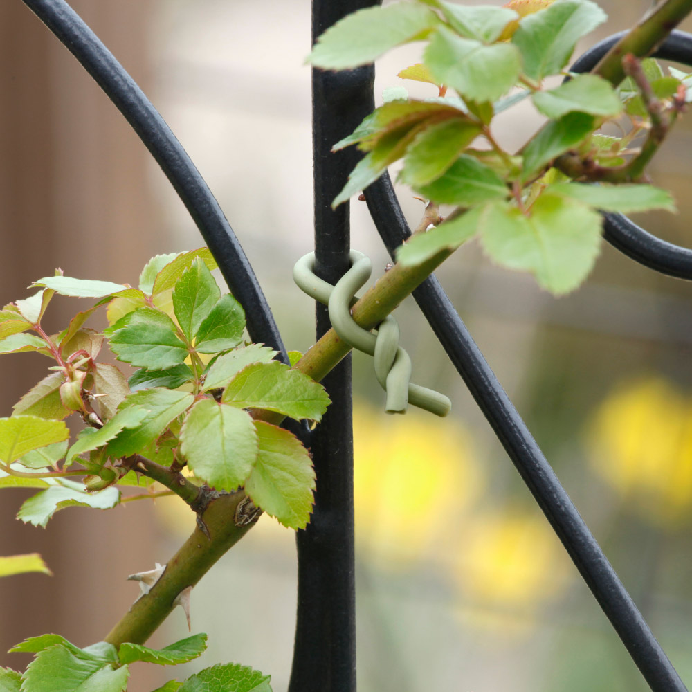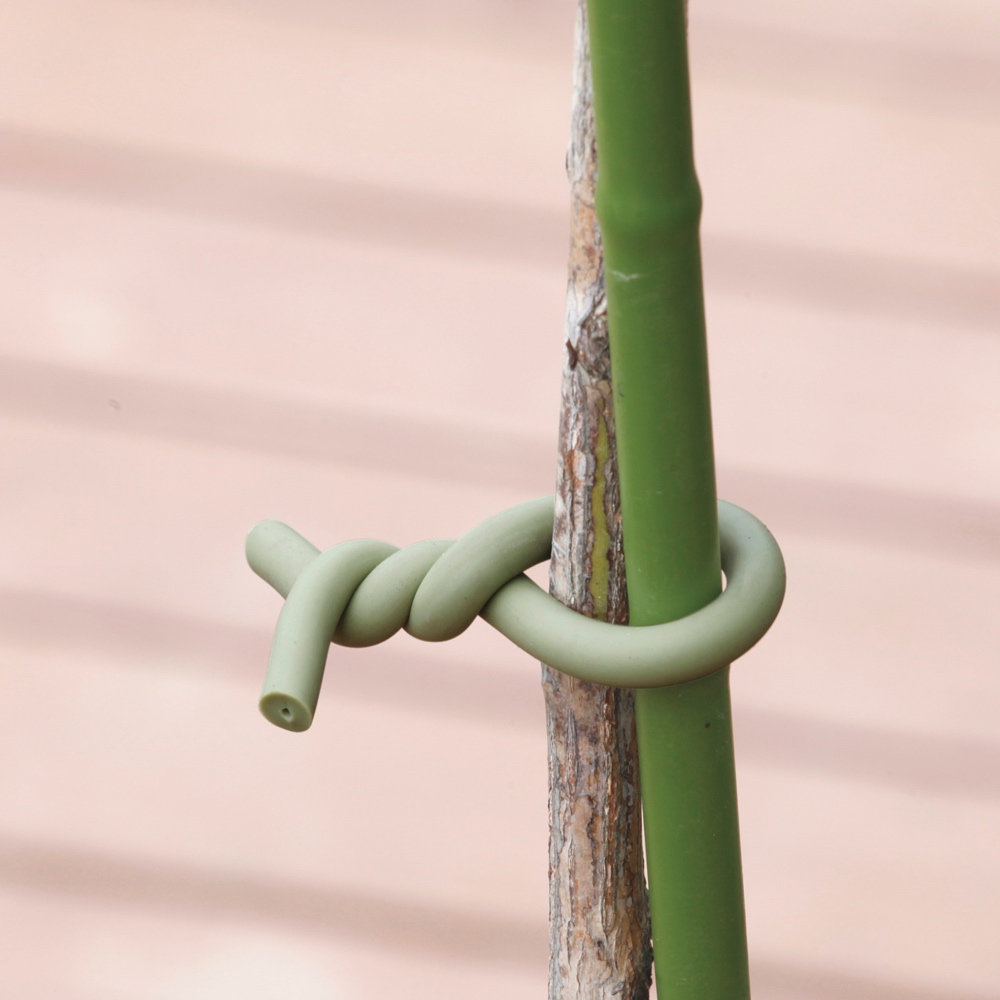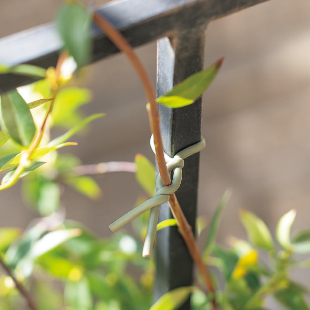 支柱と植物をしっかり結束。柔らかい素材で植物を傷つけにくく、色合いも目立ちにくく馴染みます。植物の誘引、支柱の結束に。やわらかい素材が扱いやすいソフトタイです。
