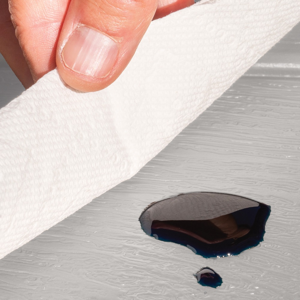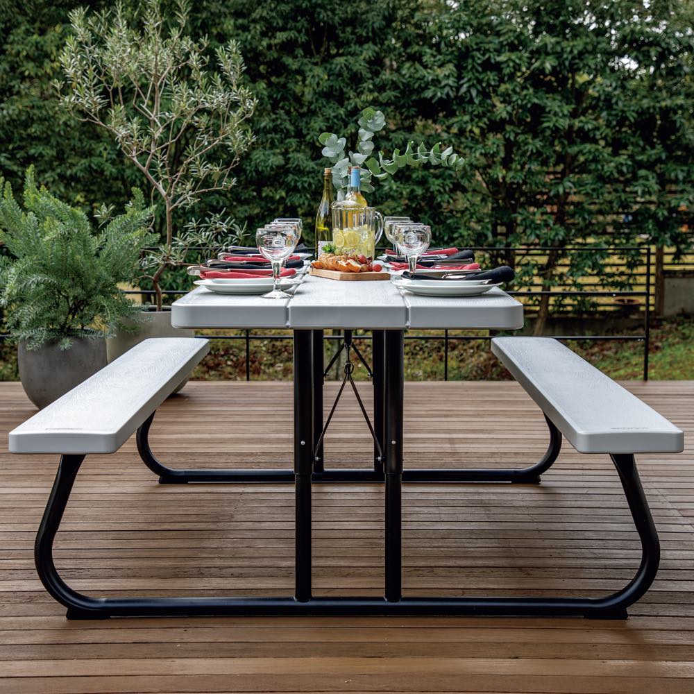 グリーンに馴染む木目調の天板は、樹脂製で汚れがサッと拭き取れてお手入れ簡単。